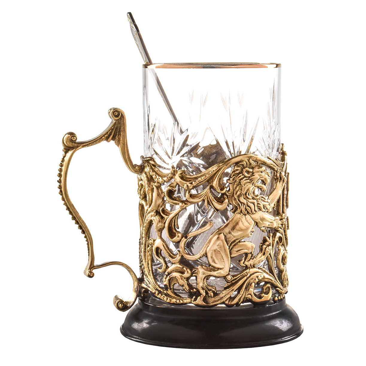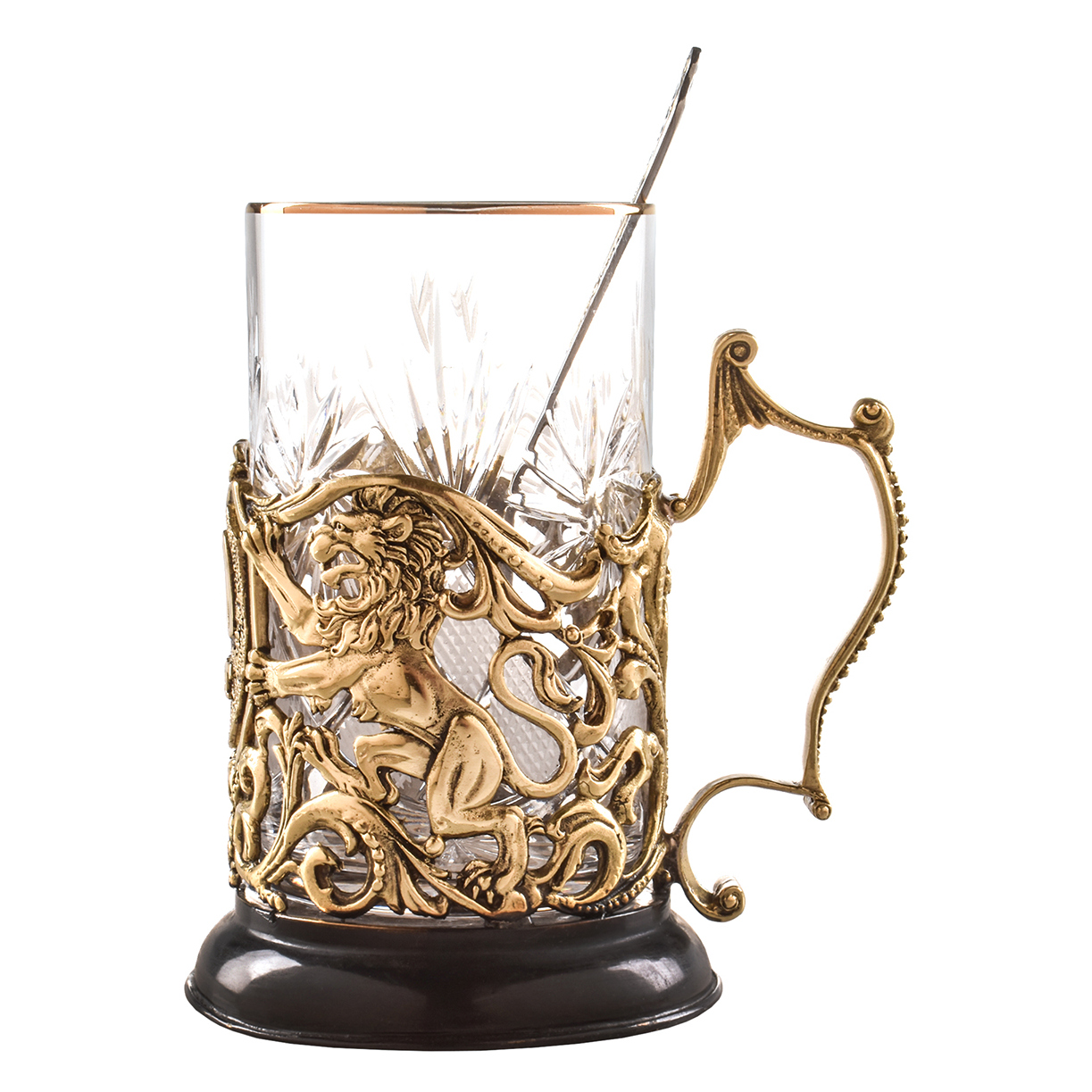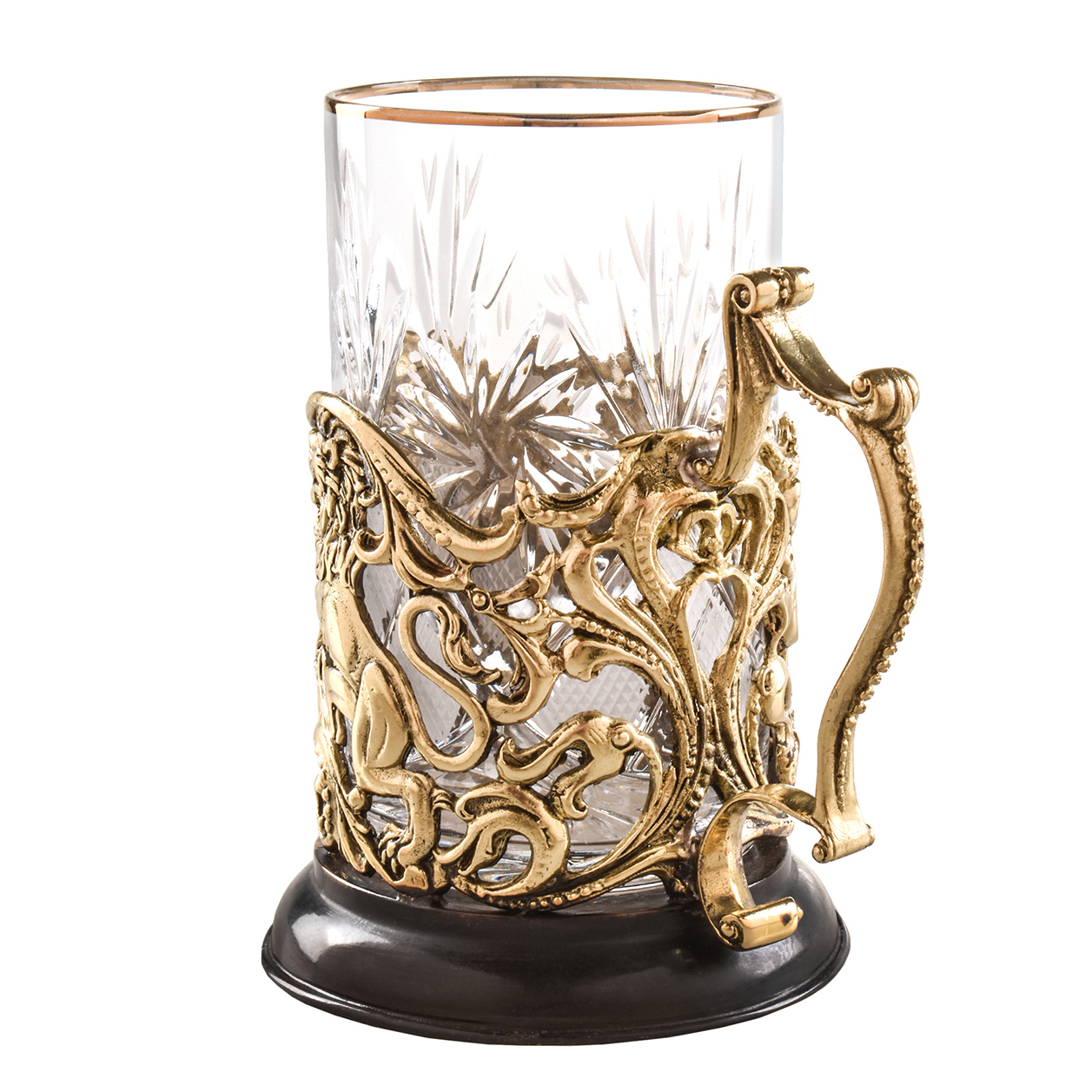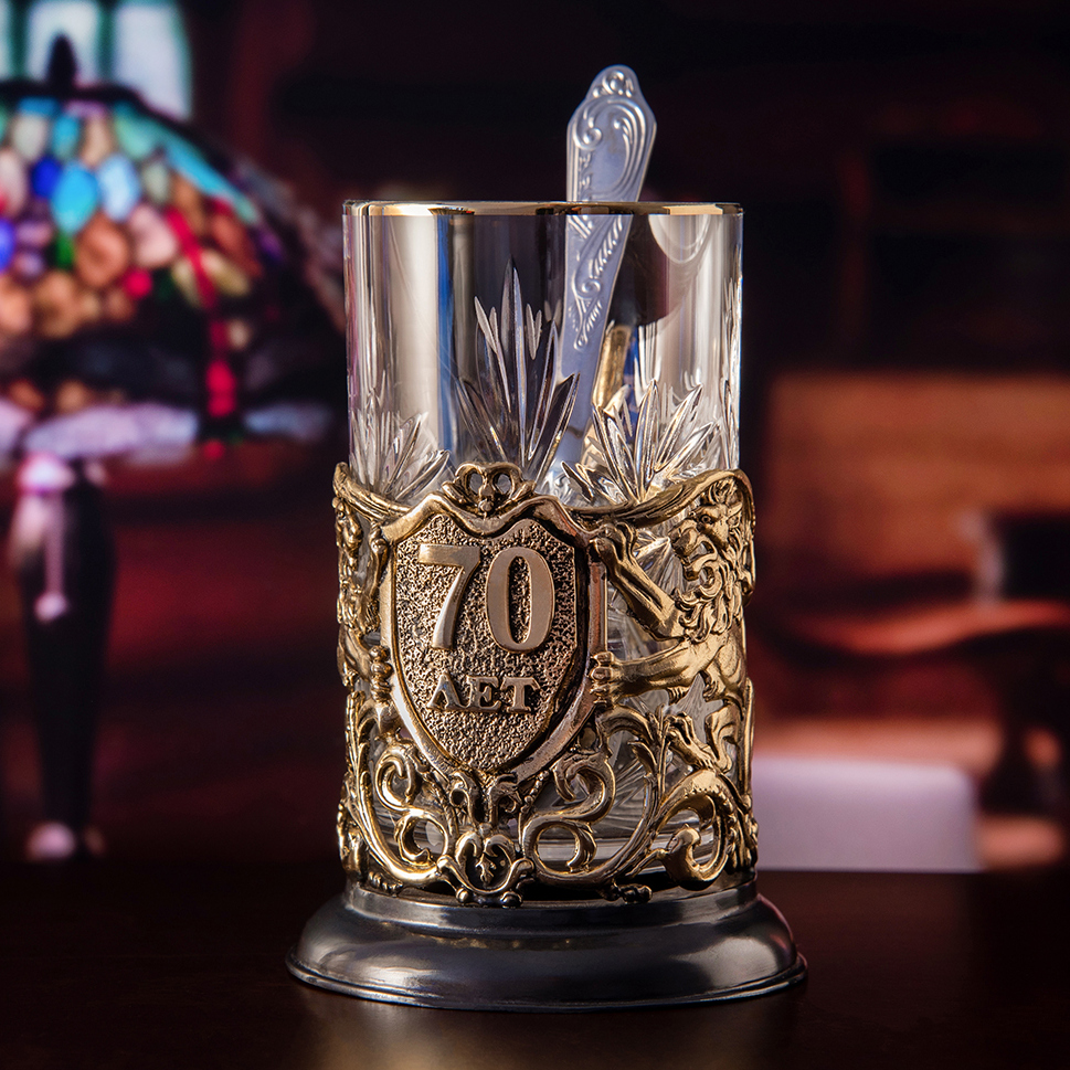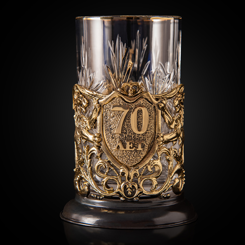 Подстаканник из латуни с юбилейной надписью «70 лет» — символичный знак внимания, выраженный в благородных материалах и утончённой пластике форм. Композиция собрана из хрусталя ручной огранки и латунного литого обрамления с патинированной поверхностью. Стекло блистает глубокими лучами граней, создающими игру света, а латунный корпус венчается центральным элементом — щитом с горельефной надписью, словно выведенной на старинной медали. Фигуры геральдических львов, расположенные по сторонам, подчёркивают торжественность момента и идею достоинства.