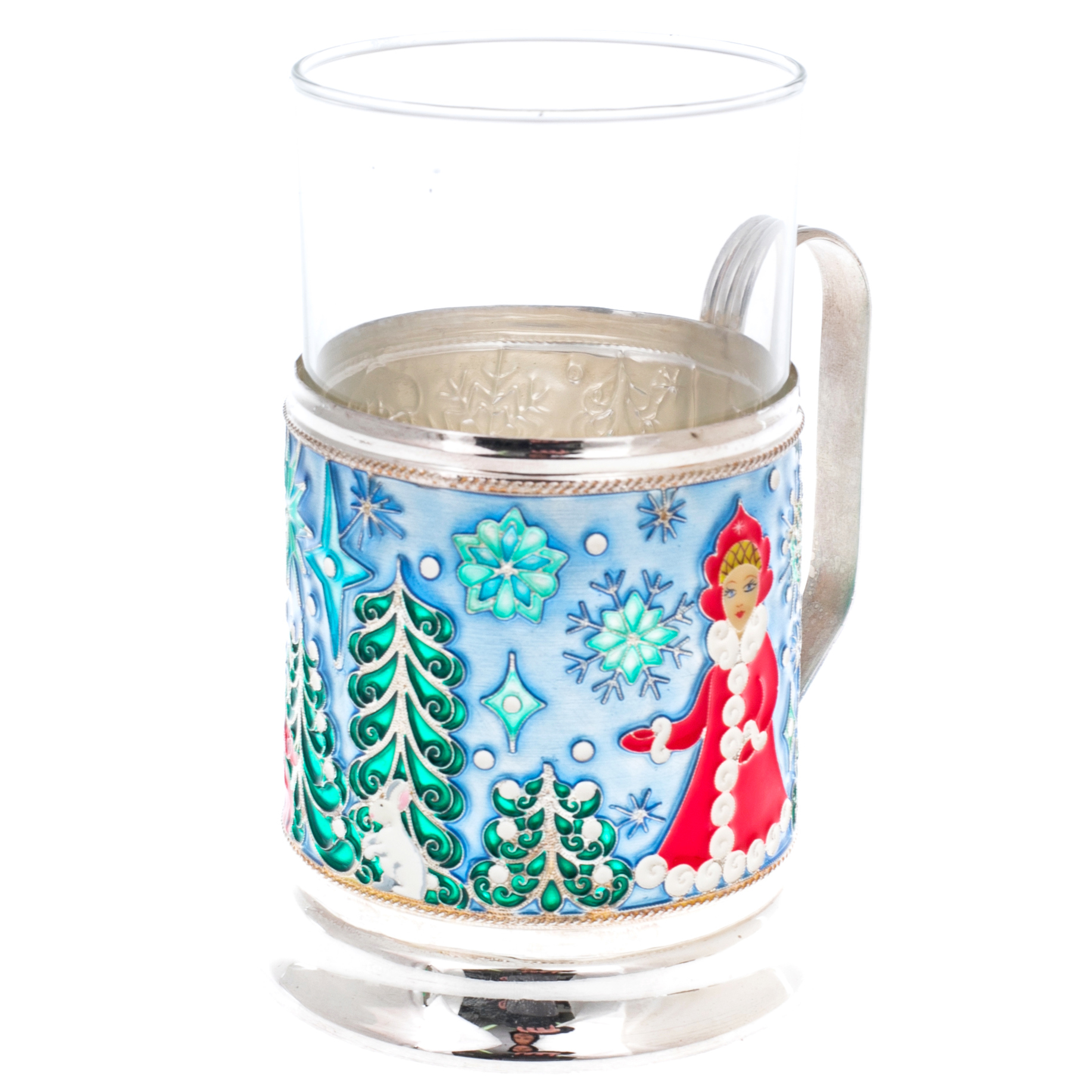 Чайный подстаканник из серебра с изображением Снегурочки — это торжественный гимн русской зиме, воплощённый в благородном металле и ярких эмалевых красках. Каждая деталь этого изысканного изделия, от ярких снежинок до кудрей Снегурочки, отражает магию праздников и тепло русской души. Кристально чистое стекло окружено кольцом из серебра, дополненным замысловатыми узорами, словно мороза, прорисовавшего свои узоры на стекле в морозный вечер.