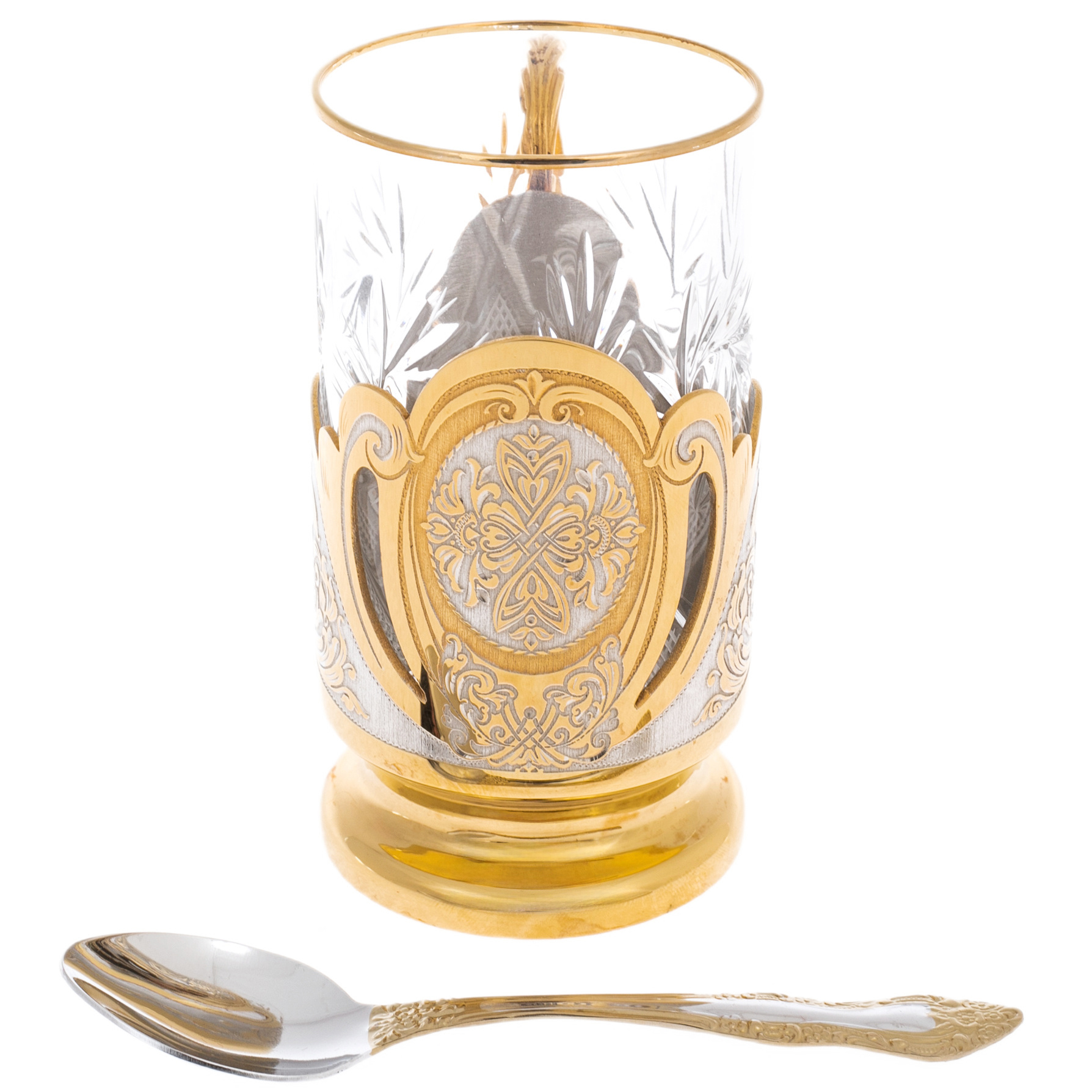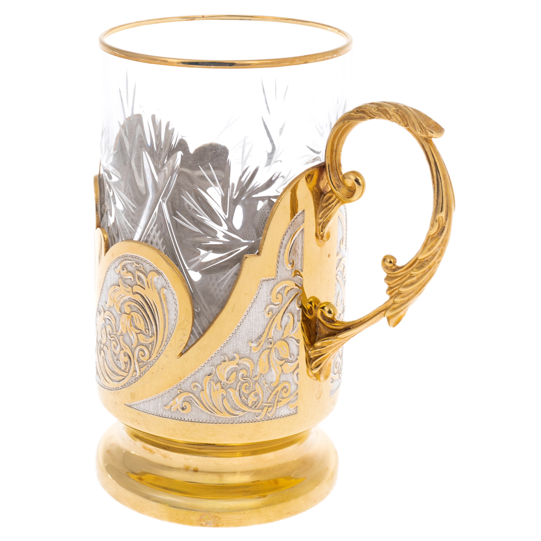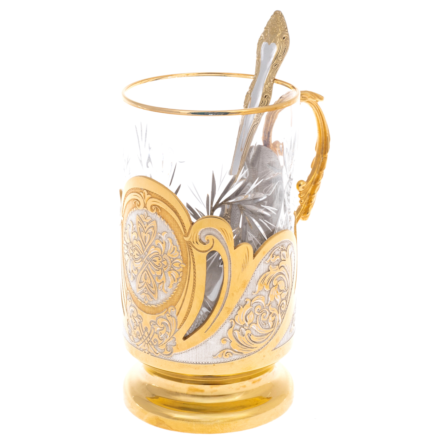 Стакан, прозрачный как зимний воздух, украшен филигранной огранкой, где свет преломляется в мириадах искр, будто напоминая о вечности могучих традиций. Кристальная чистота контрастирует с обрамлением из латуни, покрытой благородным золотом. Каждый завиток, каждый штрих гравировки — плод тонкой ручной работы, придающий подстаканнику царственную стать.
