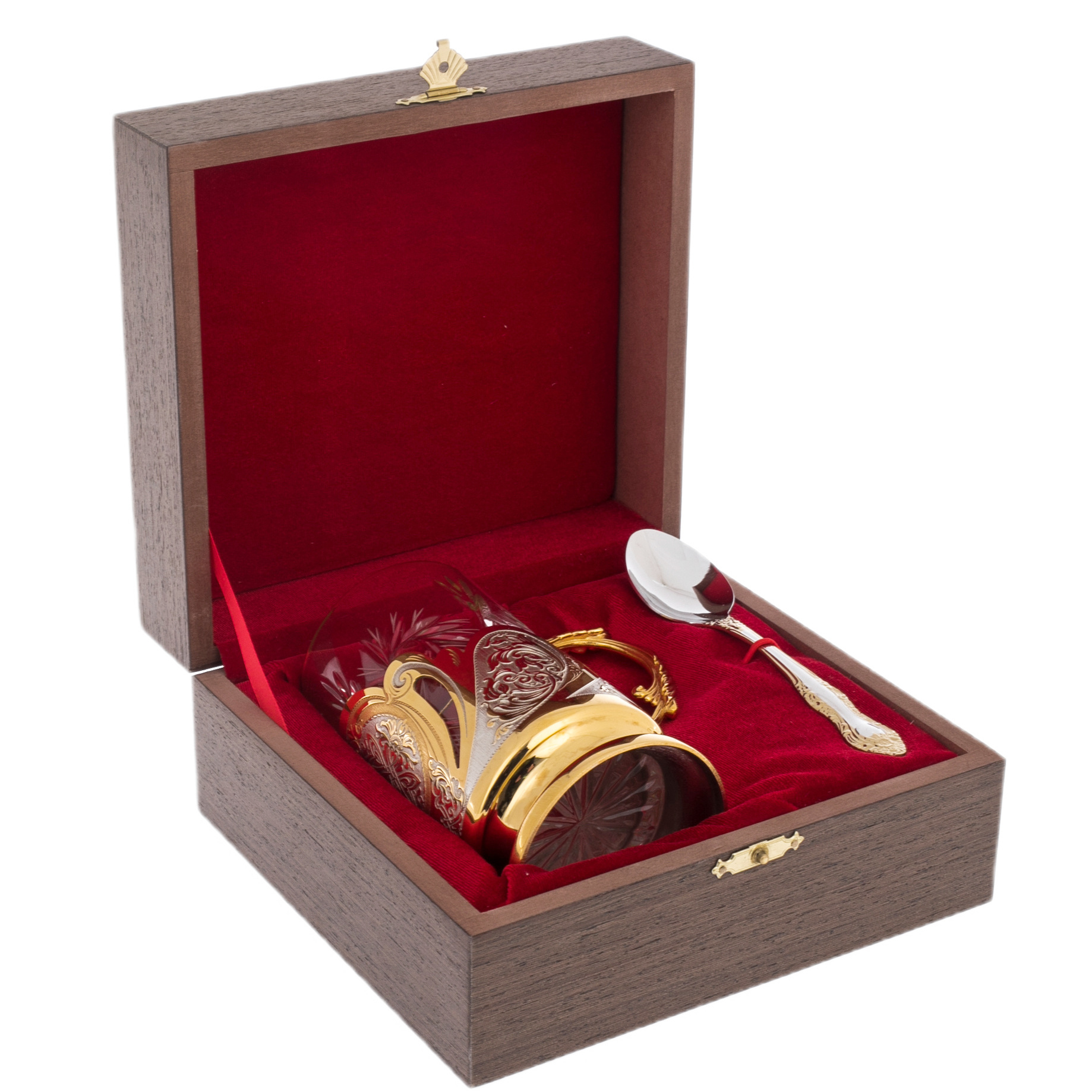 С этим произведением искусства поставляется изящная ложечка с гравировкой, гармонично завершающая ансамбль. Внутри элегантного футляра из темного дерева, устланного бархатной алой тканью, подстаканник предстает как драгоценный артефакт — достойный лидеров, патриархов и истинных ценителей роскоши.