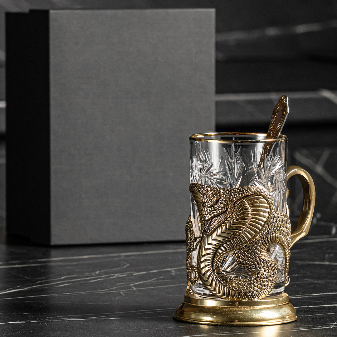Подстаканник "Змея" — это не просто утонченный аксессуар, но и символ богатой культурной традиции, связанной с исконно русским изобретением. Появившийся в XVIII веке, он изначально был создан для того, чтобы облегчить подачу чая в прозрачных стаканах: наполненные горячим напитком, их было практически невозможно удержать в руках. С тех пор этот простой, но гениальный предмет стал неотъемлемой частью русского быта, а его эволюция привела к появлению настоящих шедевров — таких как этот изысканный набор.