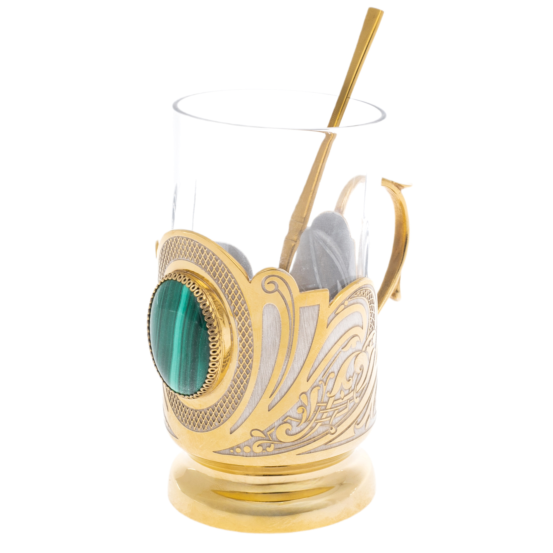 Этот изящный подстаканник с ложкой — утончённый символ домашнего уюта и достойного вкуса. Он выполнен из латуни с изысканным покрытием из золота и никеля и украшен натуральным малахитом — камнем, который в России издавна ассоциируется с благополучием и спокойствием. Глубокий изумрудный оттенок малахита контрастно выделяется на фоне теплого блеска металла, привлекая внимание и подчеркивая статус владельца. Такой подстаканник — не просто аксессуар для чаепития, а подарок, в котором сочетаются польза, символика и настоящее искусство.