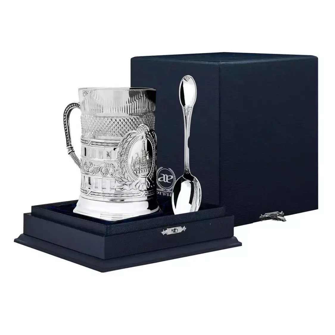 Серебряный чайный набор "Спасская башня" гербовый: ложка, стакан, подстаканник с чернением