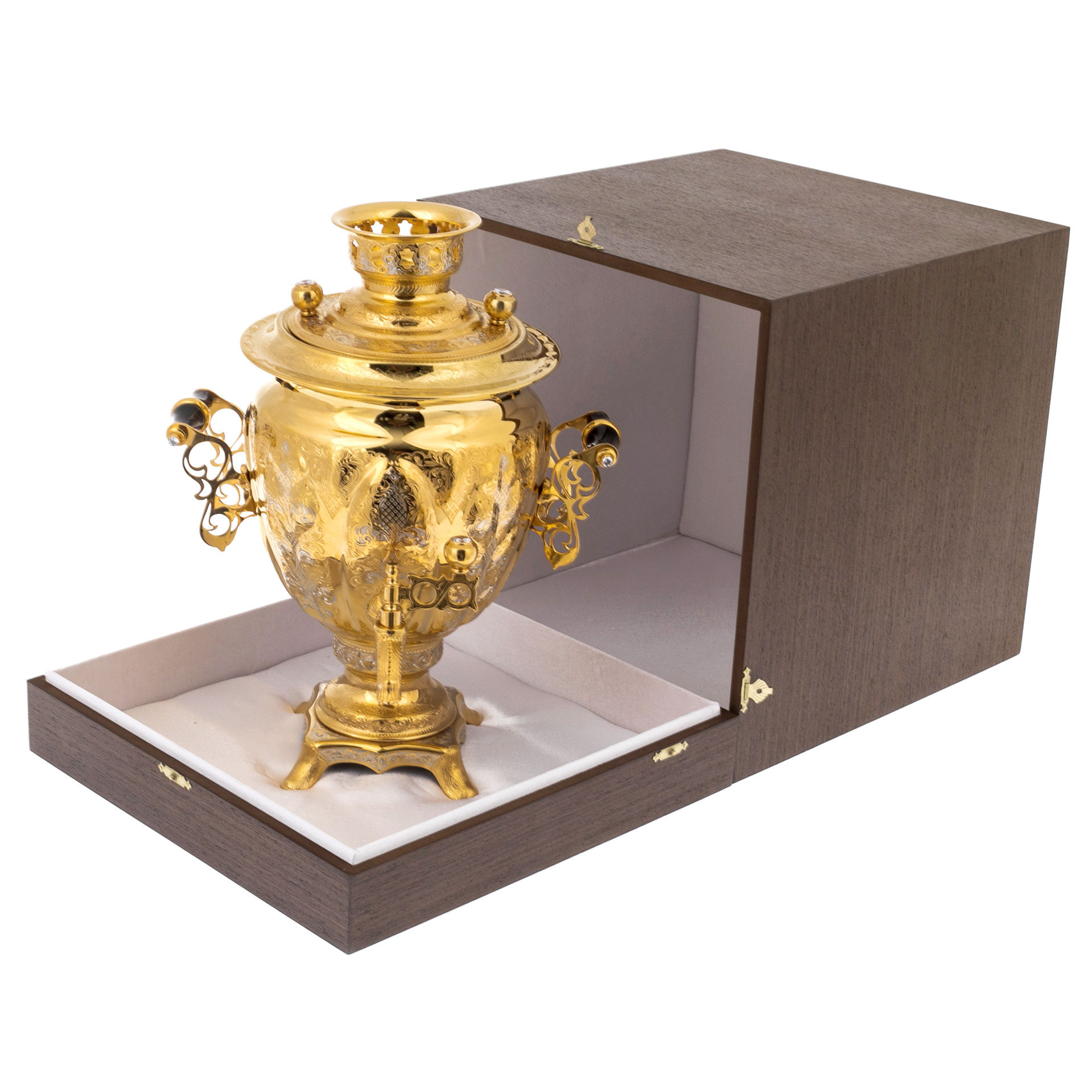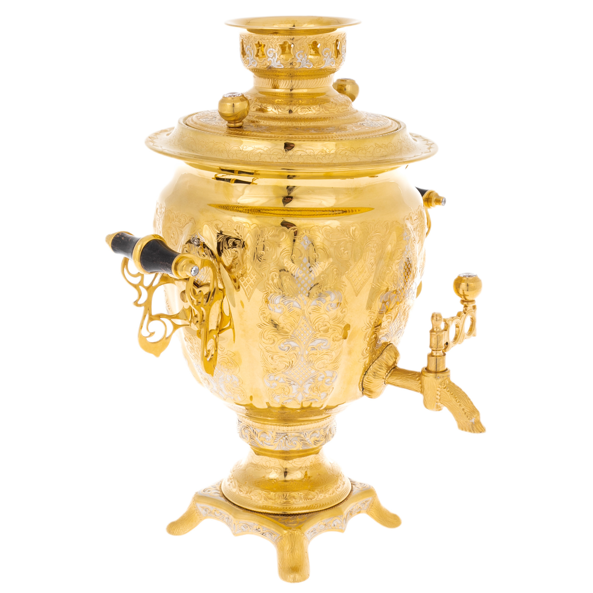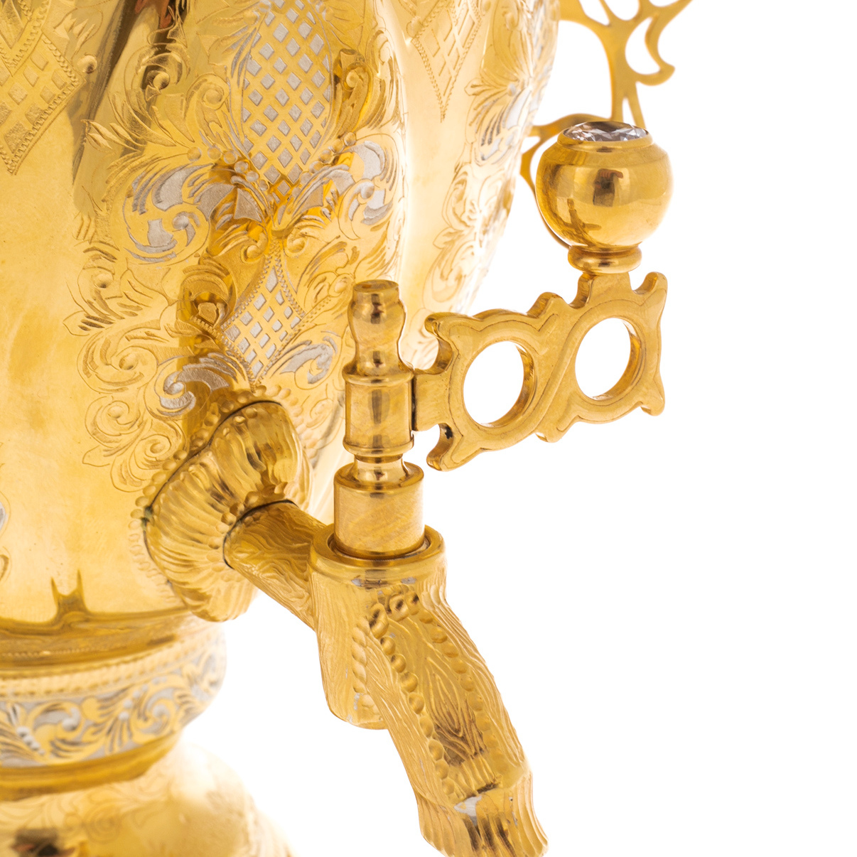 Латунь и никель обеспечивают прочность и долговечность изделия, а позолота придаёт ему роскошный вид и защищает от коррозии. Златоустовская гравюра, примененная при изготовлении самовара, славится своим изяществом и высокой детализацией. Эта технология, зародившаяся в городе Златоусте, включает в себя нанесение сложных узоров и орнаментов на поверхность изделия, что делает каждый самовар уникальным и неповторимым.