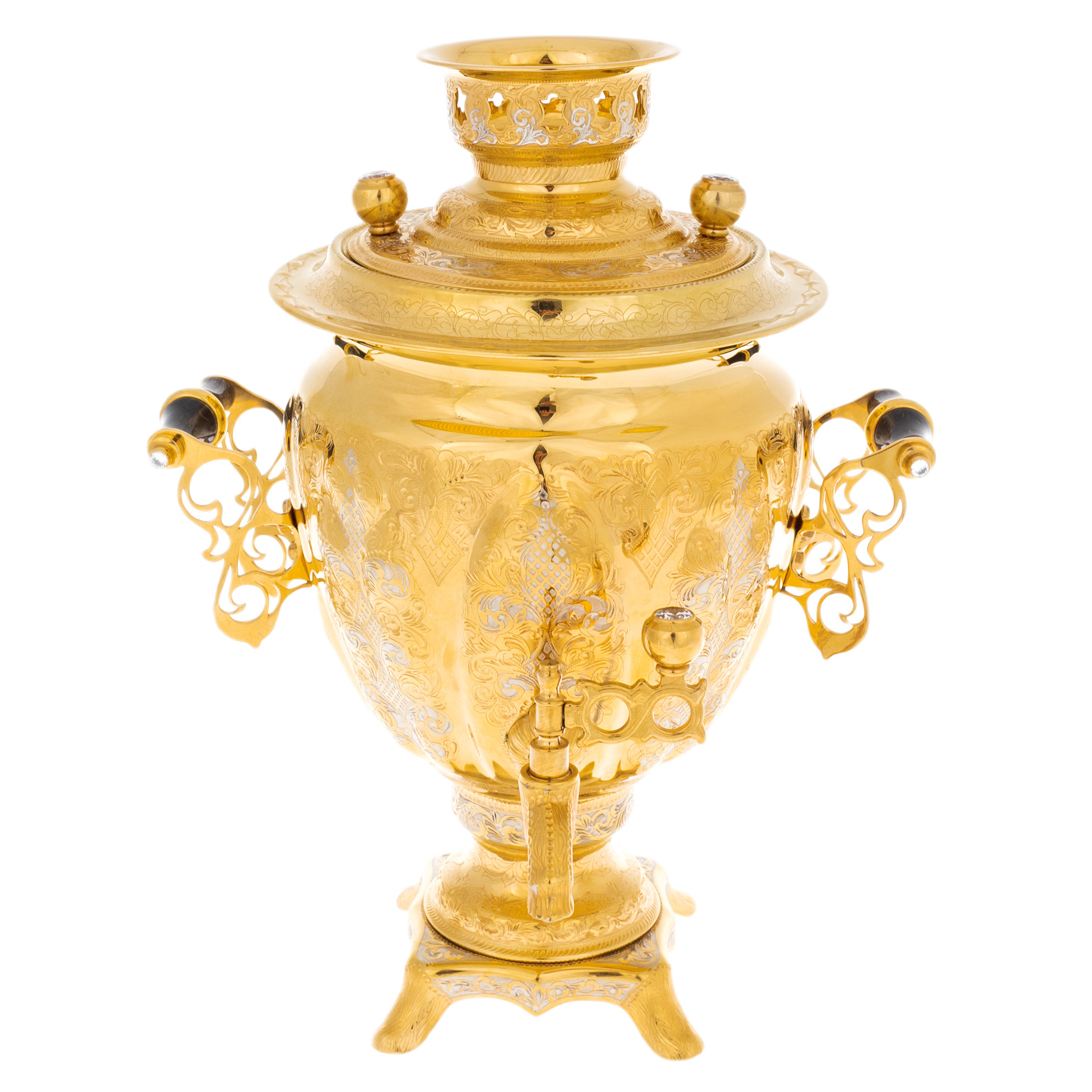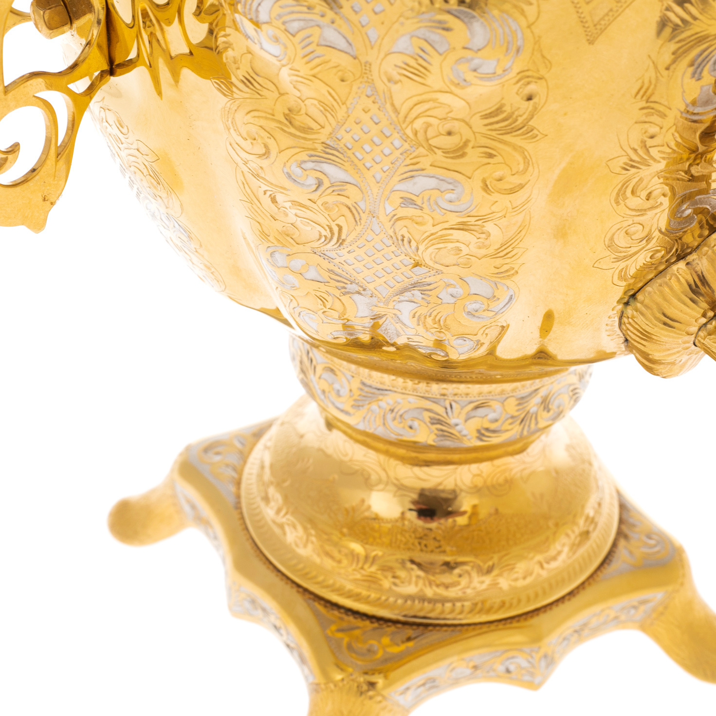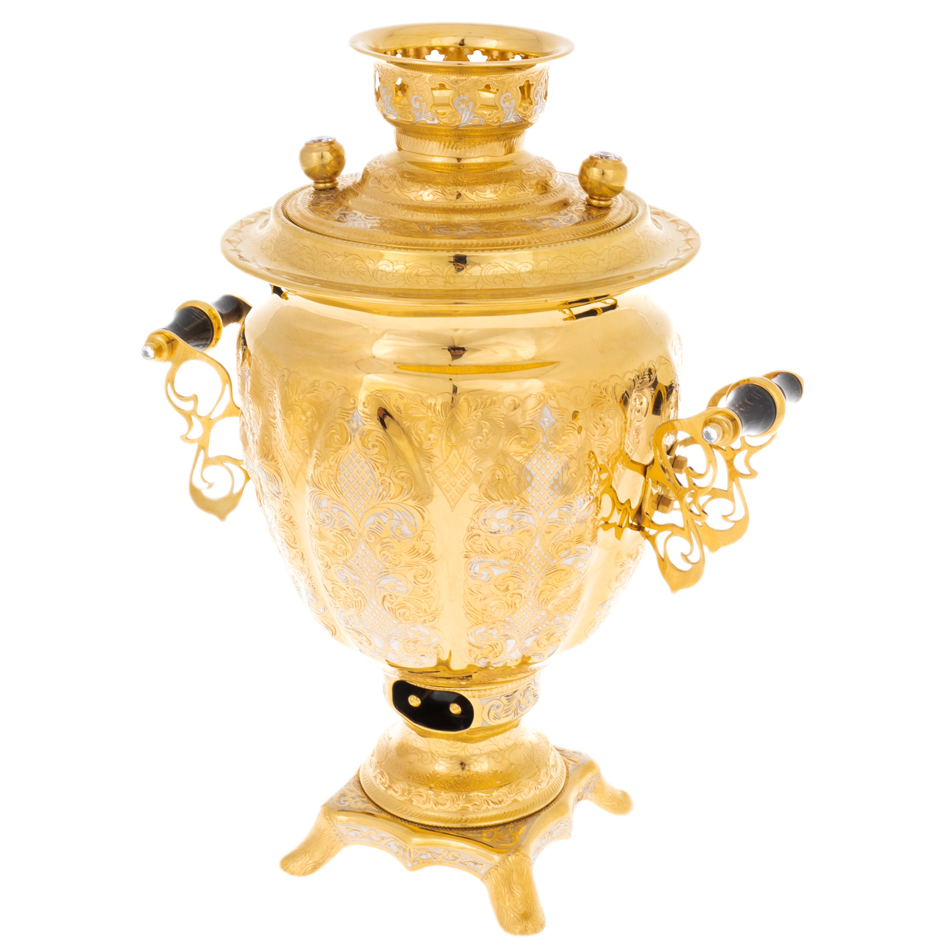 Латунь и никель обеспечивают прочность и долговечность изделия, а позолота придаёт ему роскошный вид и защищает от коррозии. Златоустовская гравюра, примененная при изготовлении самовара, славится своим изяществом и высокой детализацией. Эта технология, зародившаяся в городе Златоусте, включает в себя нанесение сложных узоров и орнаментов на поверхность изделия, что делает каждый самовар уникальным и неповторимым.