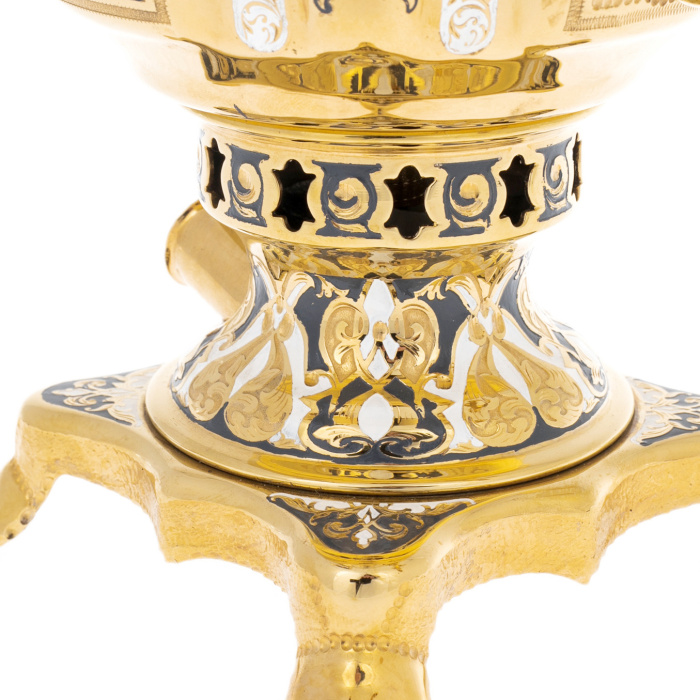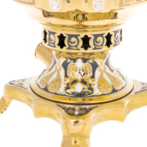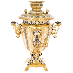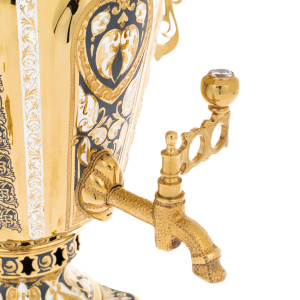 Основная поверхность покрыта плотным гальваническим золочением, создающим ровный, глубокий блеск и подчёркивающим резонанс тёплых оттенков металла. Контрастные вставки с чернью образуют сложный орнаментальный рисунок: переплетающиеся растительные мотивы, продуманные симметрии и тончайшие линии формируют на корпусе настоящий декоративный фриз. Ручки, выполненные как ажурные завитки, дополненные тёмными накладками, создают сочетание лёгкости и монументальности; кран с рельефной фактурой и декоративным ключом подчеркивает ручную проработку каждого элемента.
