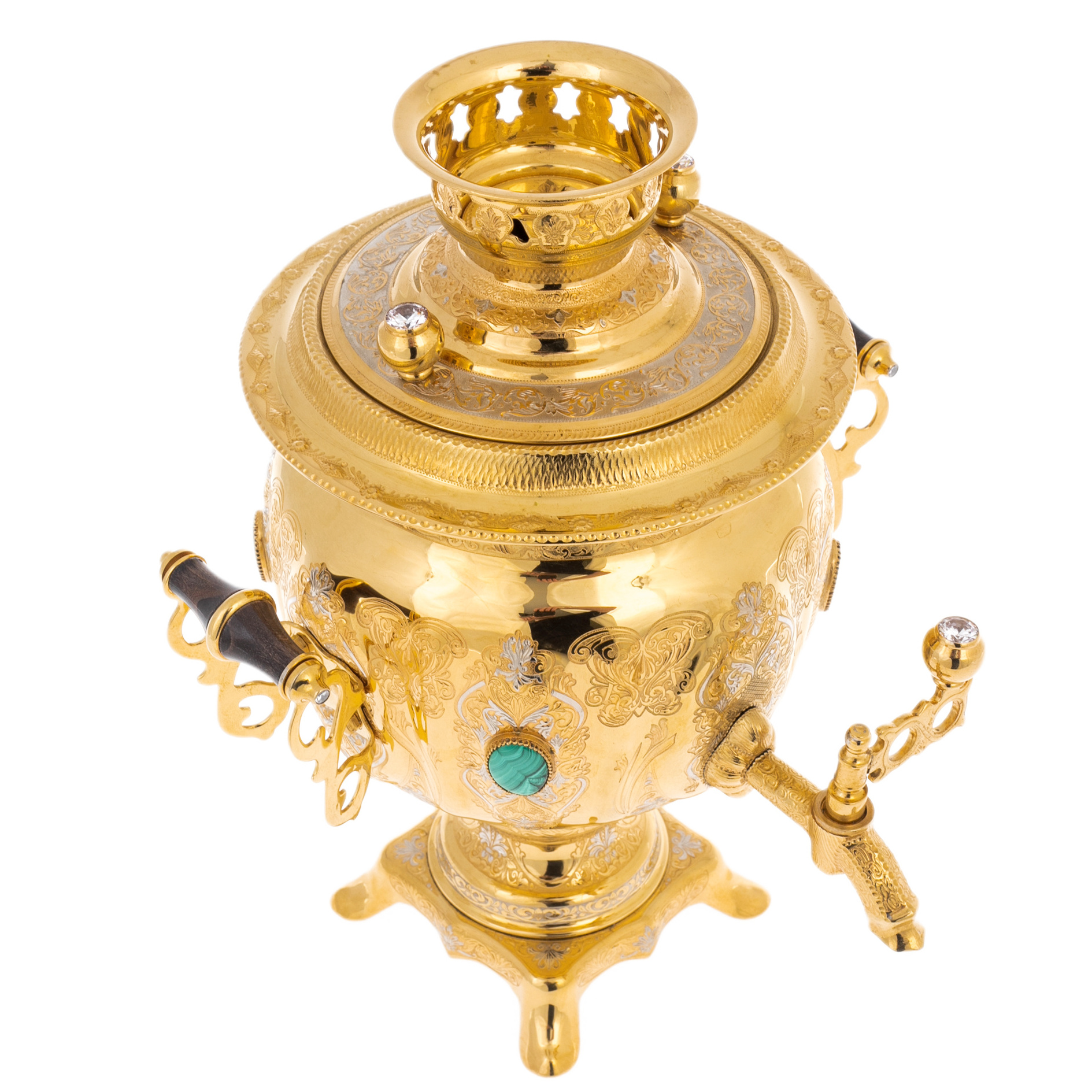 Изысканный самовар, воплотивший в себе торжественность русских традиций и блеск королевского убранства, выполнен из латуни и украшен филигранной гравировкой в технике Златоуста. Каждая линия на его поверхности напоминает перистую вязь старинных манускриптов, погружающих в атмосферу неспешного чаепития, где время словно замирает. Центральный корпус венчают вставки из малахита — камня с загадочной глубиной зелени, дарующего спокойствие и уверенность. Гладкость металла, насыщенность цвета и ювелирная точность деталей превращают этот предмет в символ домашнего уюта, возведённого до уровня высокого искусства.