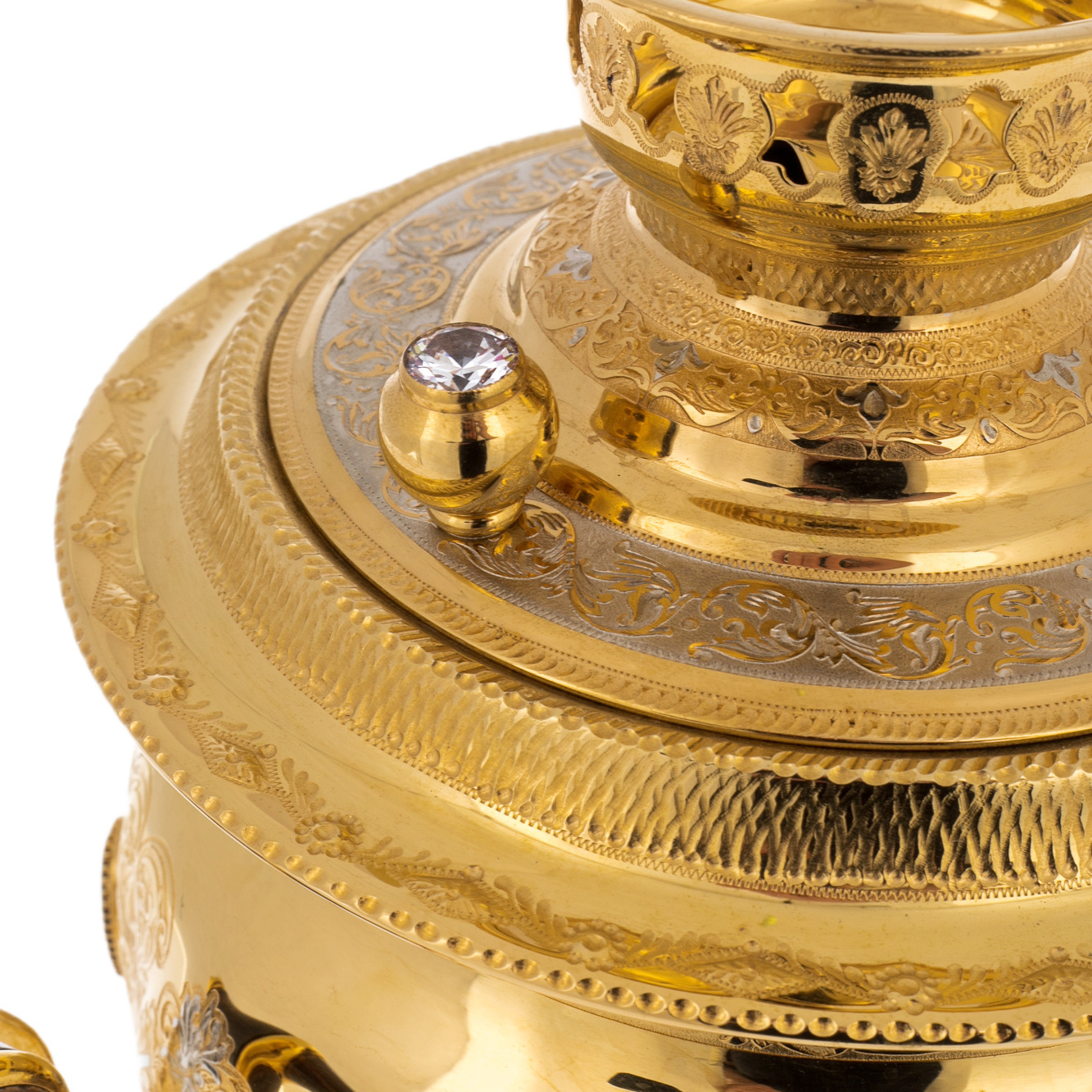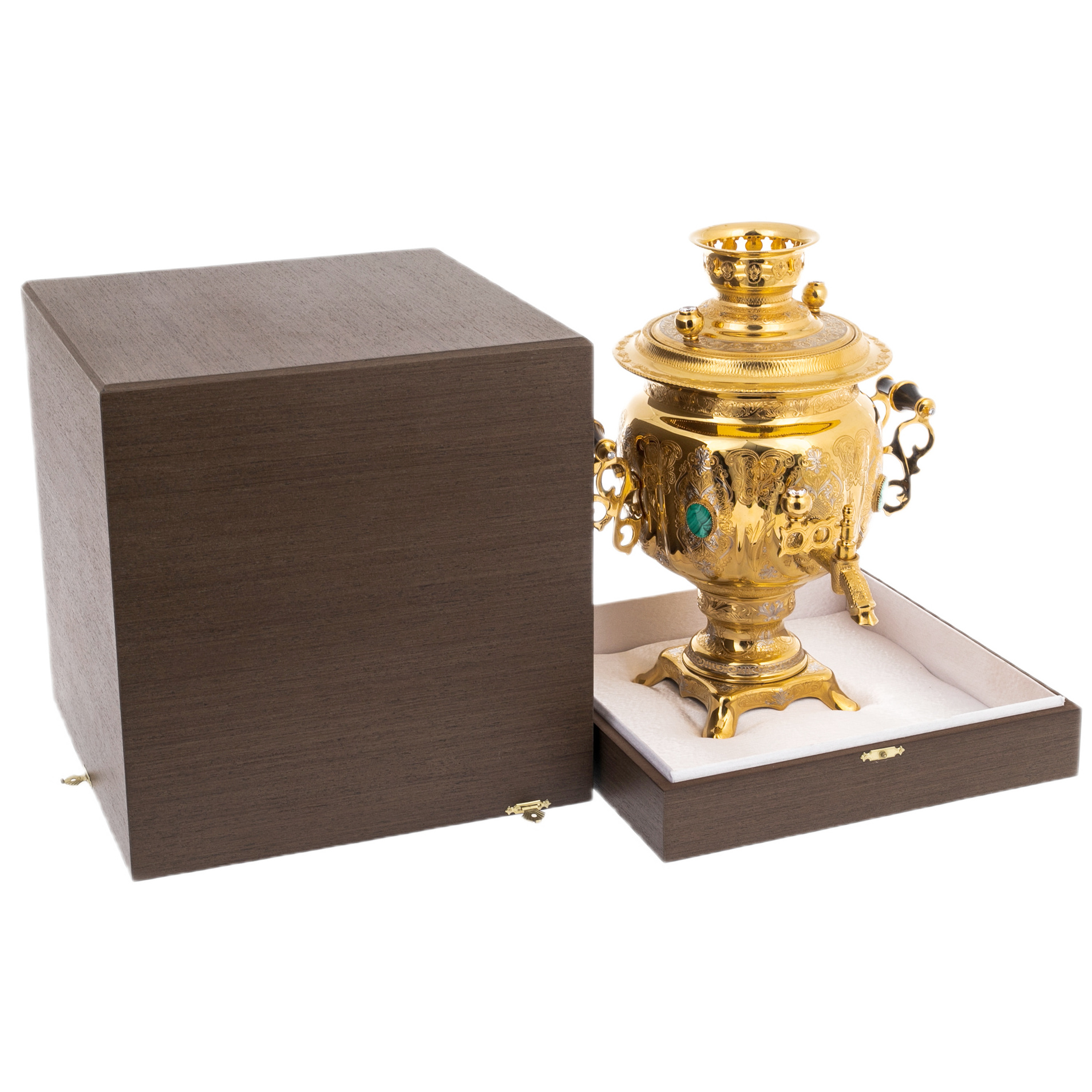 Металлические поверхности самовара покрыты гальваническим золотом и вручную декорированы гравировкой по златоустовской технике. Эта сложная многоступенчатая работа требует высочайшего мастерства: сначала на латунную основу наносятся тончайшие узоры, затем рисунок покрывается сусальным золотом и шлифуется до зеркального блеска. Каждая линия, каждый завиток орнамента — результат ювелирной точности и тонкого художественного чутья. Благодаря этой технике изделие излучает тёплое сияние и выглядит одновременно весомым и изысканным, отражая свет и внимание в каждом изгибе.