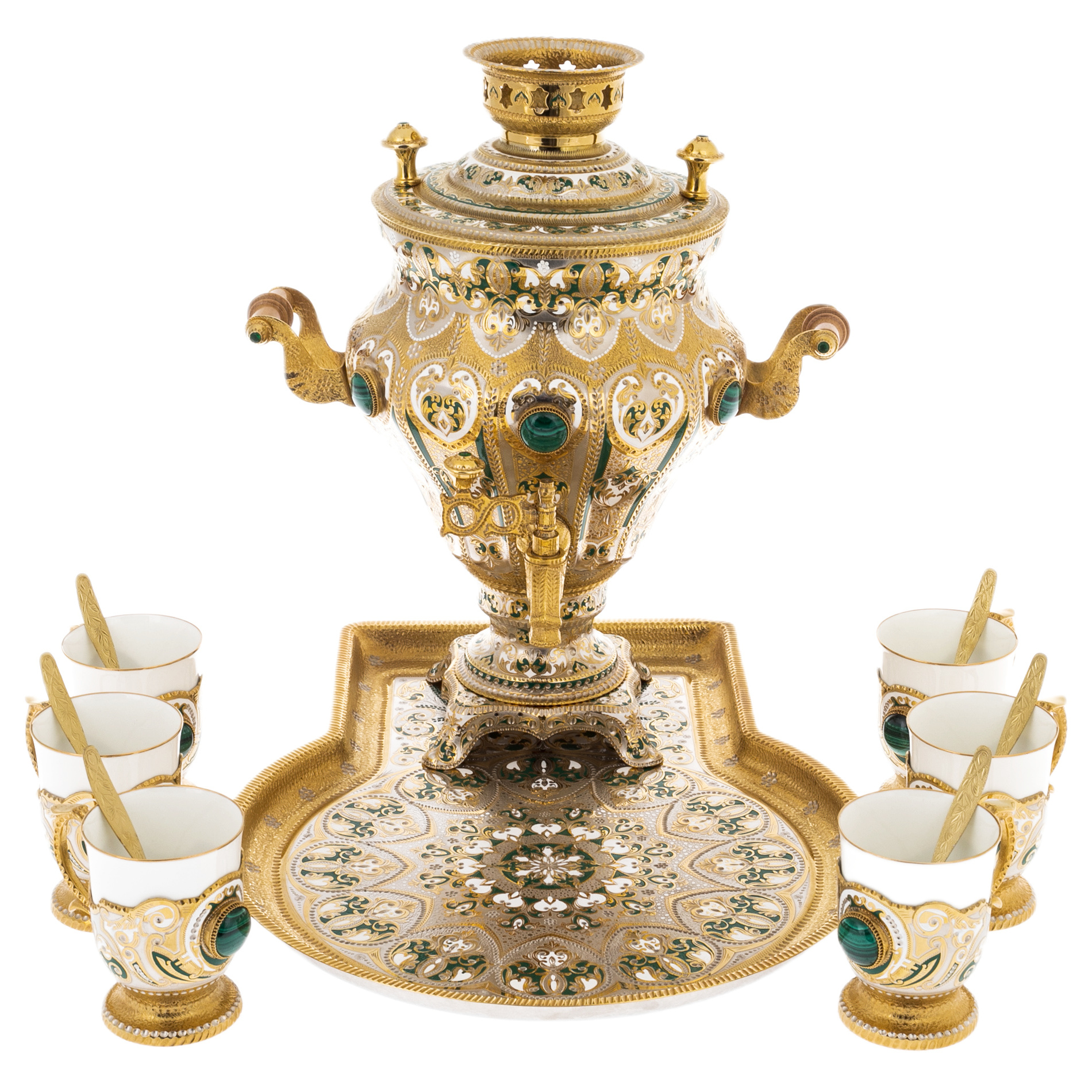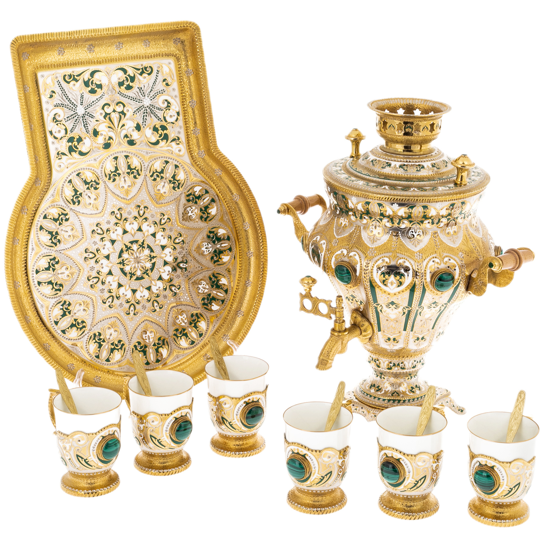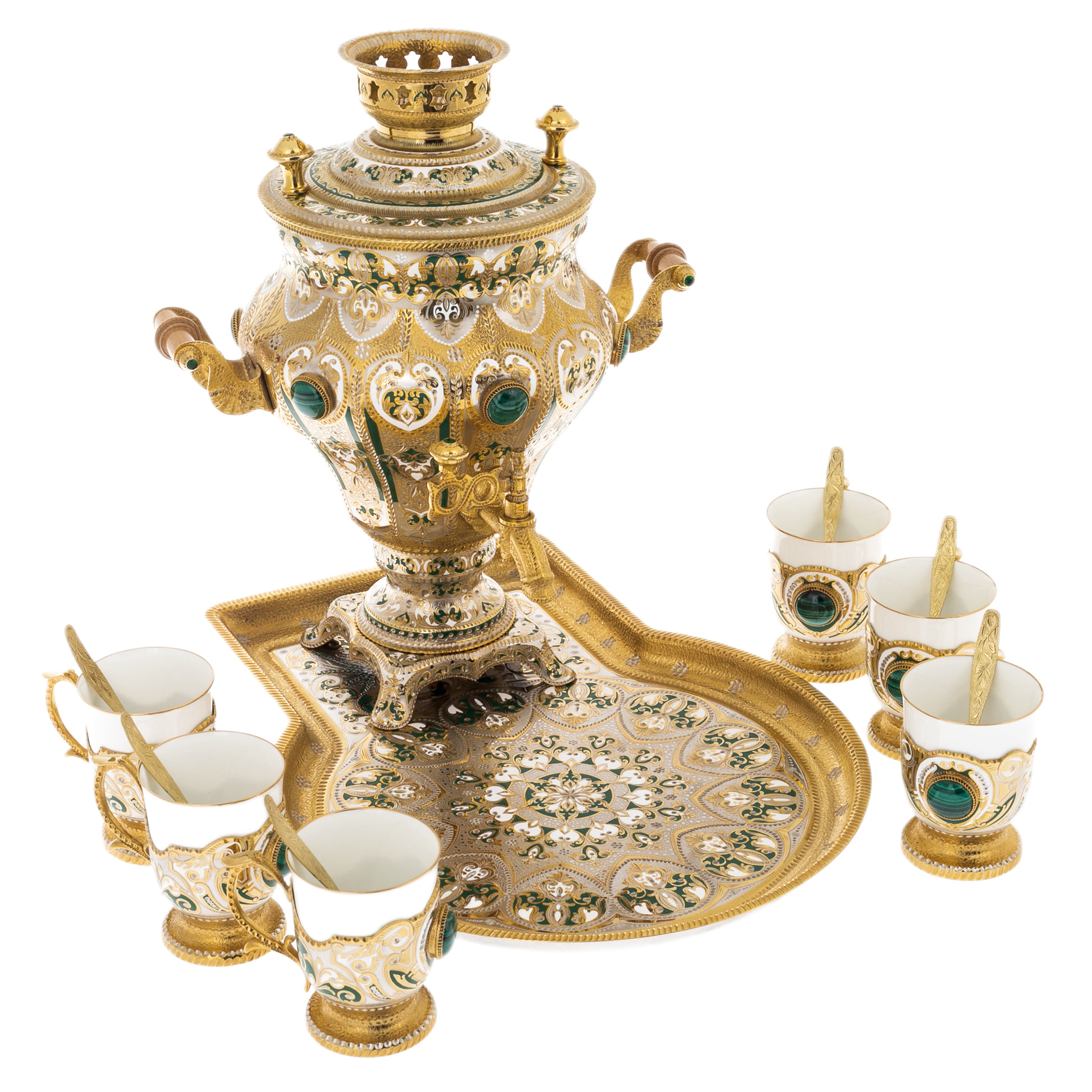 Каждый элемент этого набора источает великолепие: от величественного самовара до элегантно украшенных чашек и ложечек. Использование малахита добавляет изысканность и богатый зеленый цвет, который великолепно контрастирует с золотым блеском позолоты и эмали.