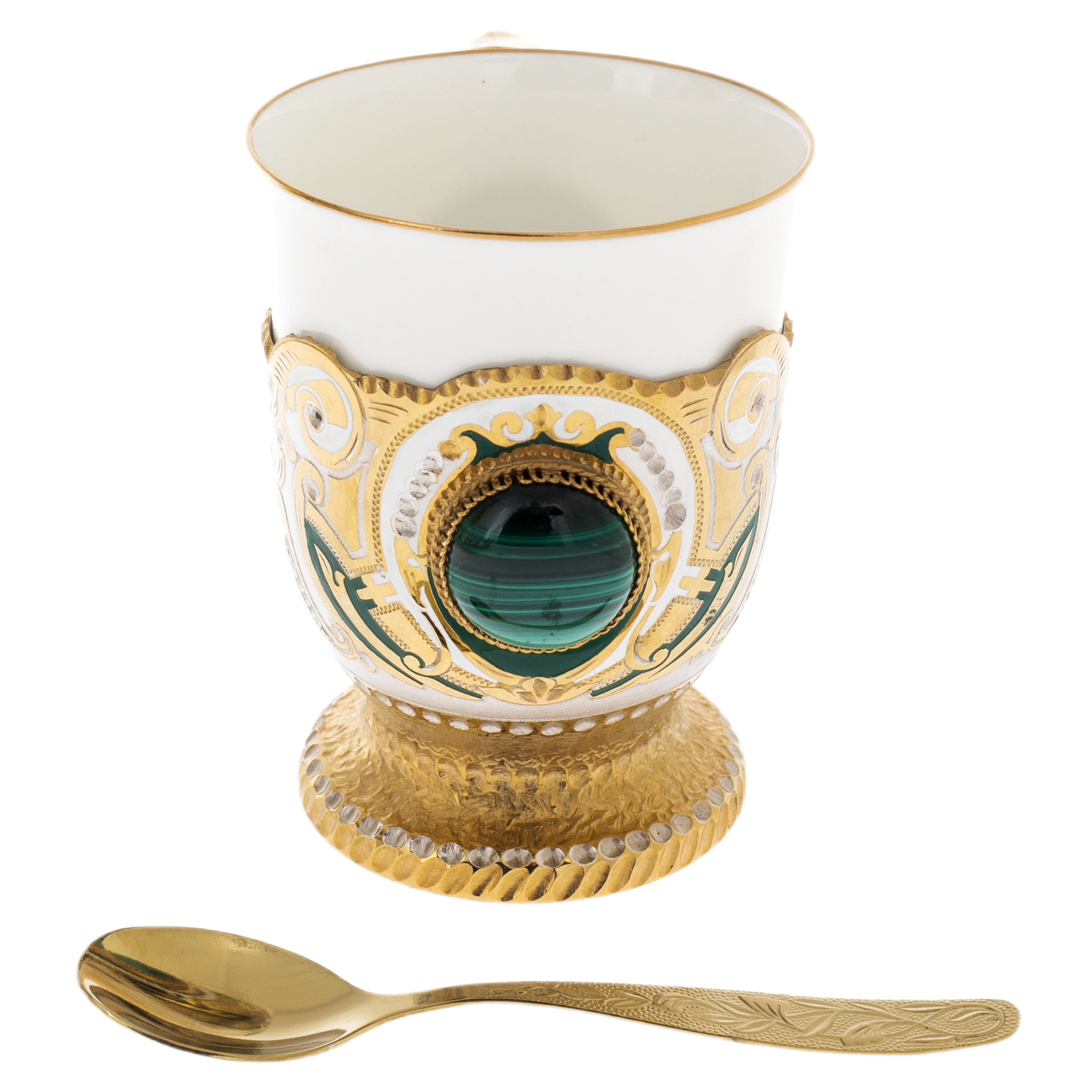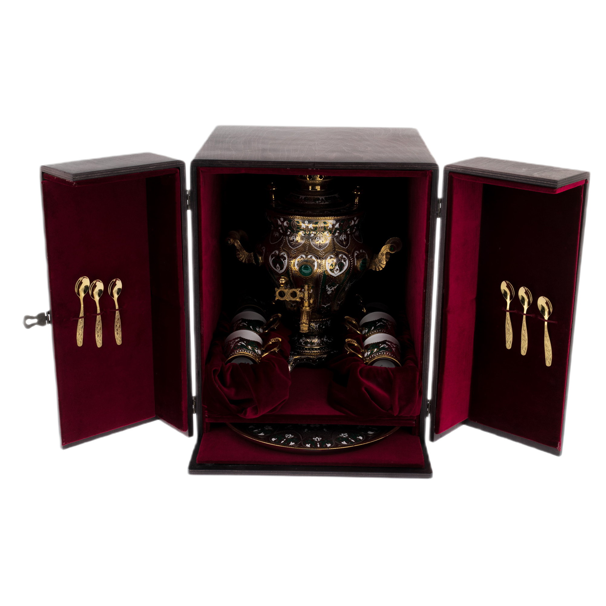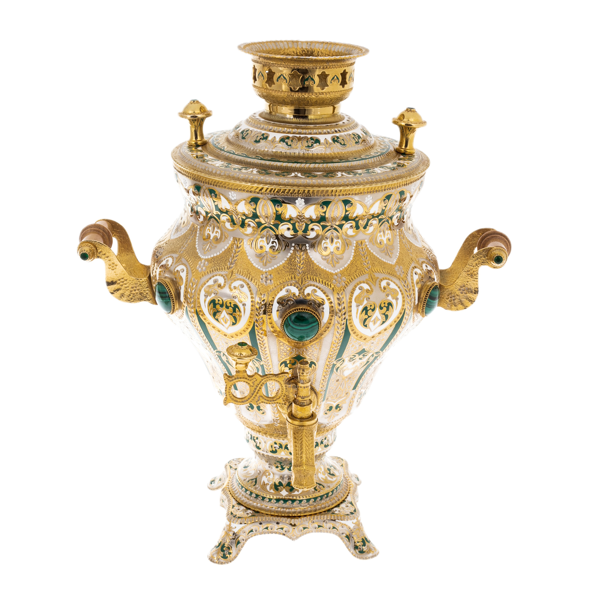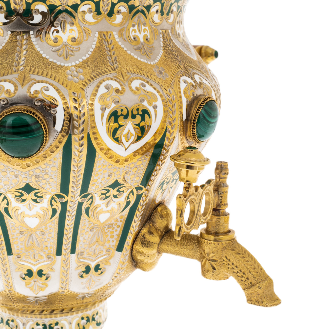 Каждый элемент этого набора источает великолепие: от величественного самовара до элегантно украшенных чашек и ложечек. Использование малахита добавляет изысканность и богатый зеленый цвет, который великолепно контрастирует с золотым блеском позолоты и эмали.