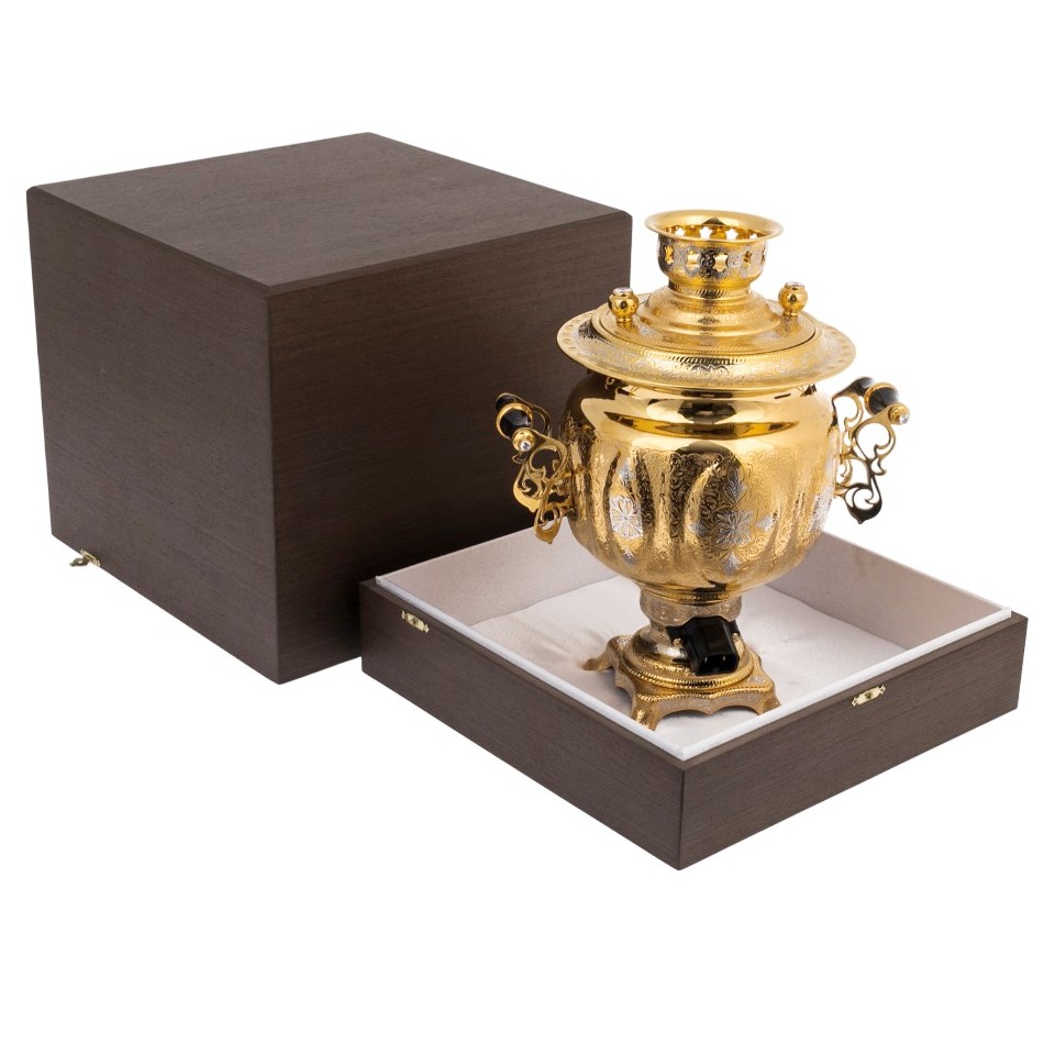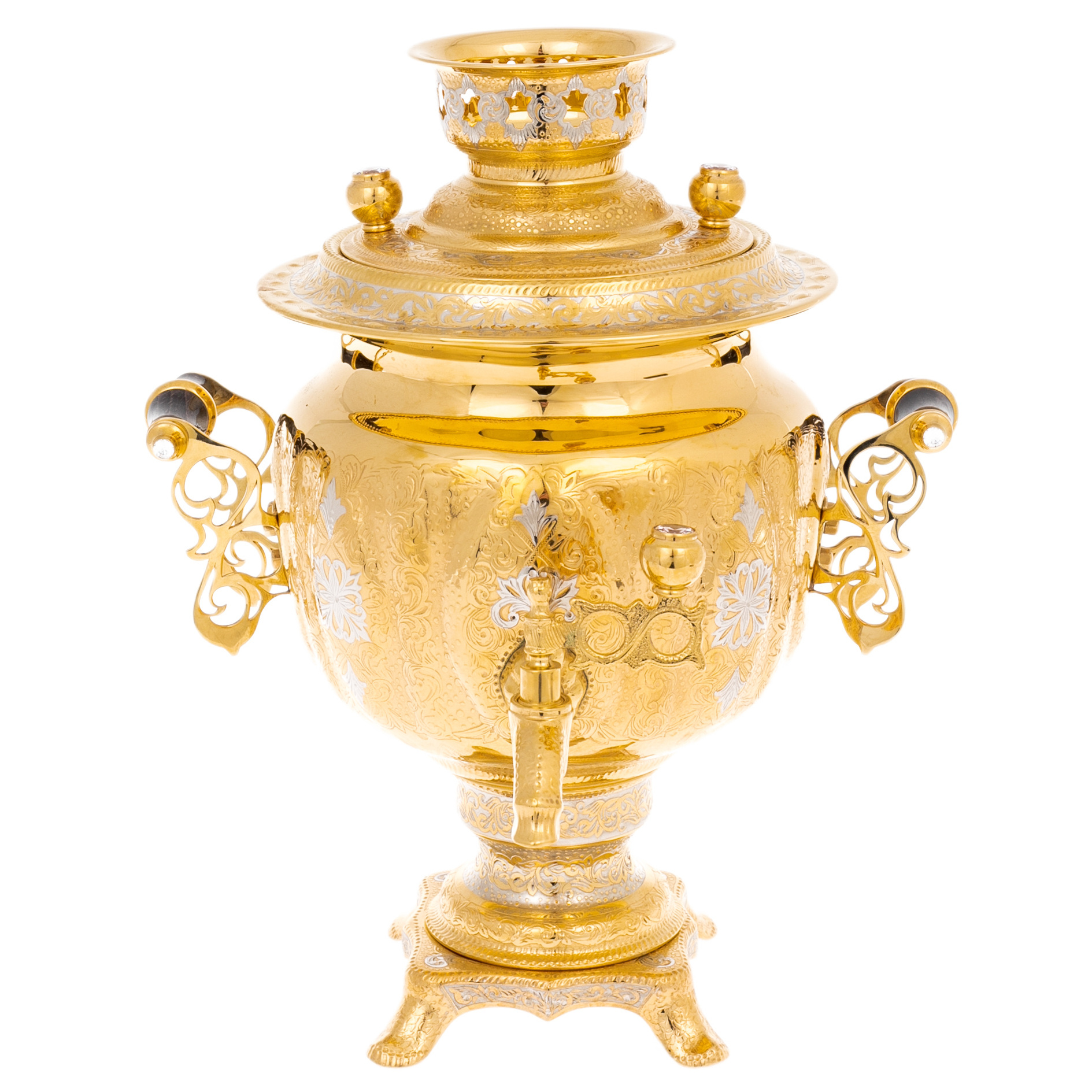 Самовар, выполненный в златоустовской технике, представляет собой изысканное сочетание функциональности и художественного мастерства, являясь настоящим украшением любого стола. Самовар включает корпус, крышку, кран и ручки, каждый элемент которого украшен утончённой гравировкой, выполненной вручную. Основной фон изделия покрыт золотым узором, переплетающимся с серебряными и чёрными оттенками, придающими самовар особую глубину и благородство. Золотистые и серебряные элементы, используемые в росписи, делают самовар ещё более привлекательным. Каждый элемент самовара, будь то изящный узор на корпусе или утончённые детали ручек, выполнен с безупречным вниманием к деталям, демонстрируя высочайший уровень мастерства.