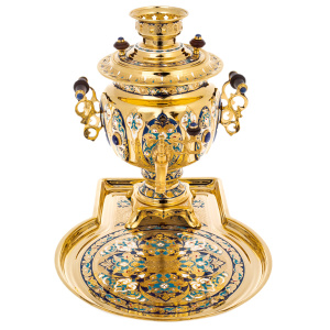 Корпус выполнен из металла, покрытого тёплой позолотой, отражающей свет мягким зеркальным сиянием. Поверхности украшены златоустовской гравировкой и орнаментом, поддержанным эмалевыми вставками в сине-бело-лазурной гамме, вызывающей ассоциации с "Гжелью": плавные растительные мотивы, симметричные медальоны, тонкие обводы, создающие ощущение ручной, выверенной до линии работы. Лазурит представлен декоративными вставками глубокого синего тона, расставленными акцентами на корпусе и деталях, добавляя композиции благородную холодную глубину, оттеняющую золото. Ручки завершены тёмными накладками, приятно лежащими в ладони; на крышке и кране присутствуют фигурные навершия, поддерживающие общий ритм. Поднос повторяет мотивы самовара: центральный орнаментальный круг, окружённый поясами узора и эмали, обрамлён широким золотым полем, подчёркивающим уровень исполнения.
