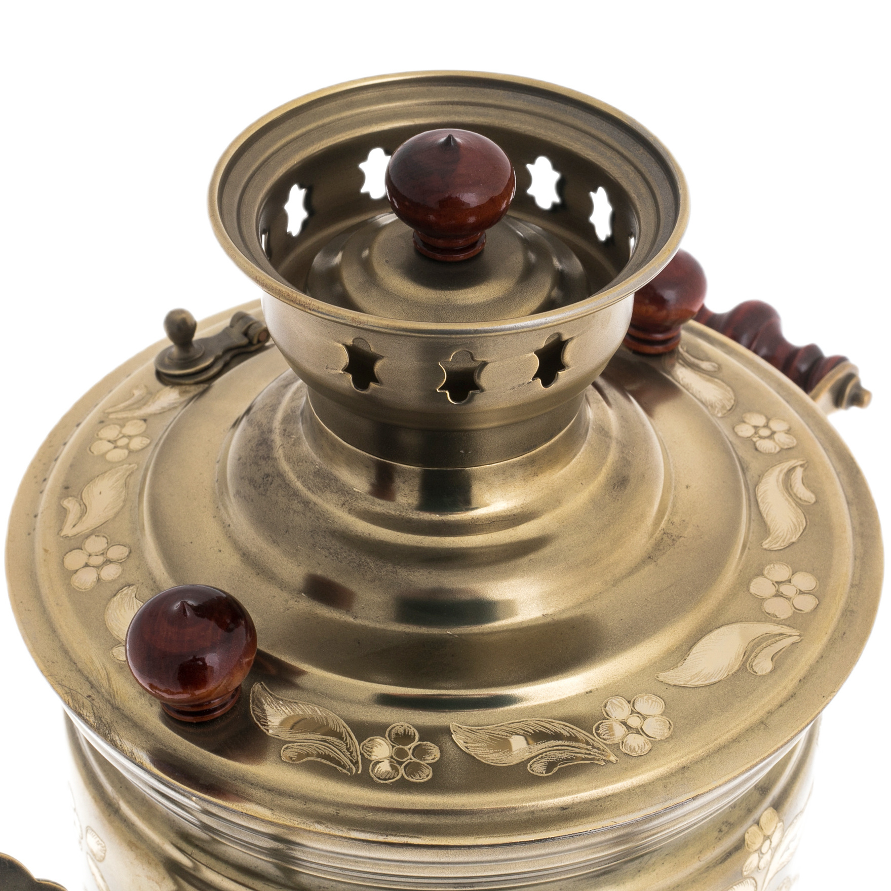 Самовар укомплектован латунным краником с фигурной поворотной ручкой и резными накладками, а также крышкой с деревянной кнопкой, обеспечивающей комфорт при открывании. Декоративные элементы сочетают практичность с художественной выразительностью. Перед вами предмет, чья эстетика укоренилась в традициях, но обращена в будущее — для тех, кто ищет в предмете быта не просто утилитарность, а осязаемую красоту, наполненную теплом, достоинством и родовой памятью.