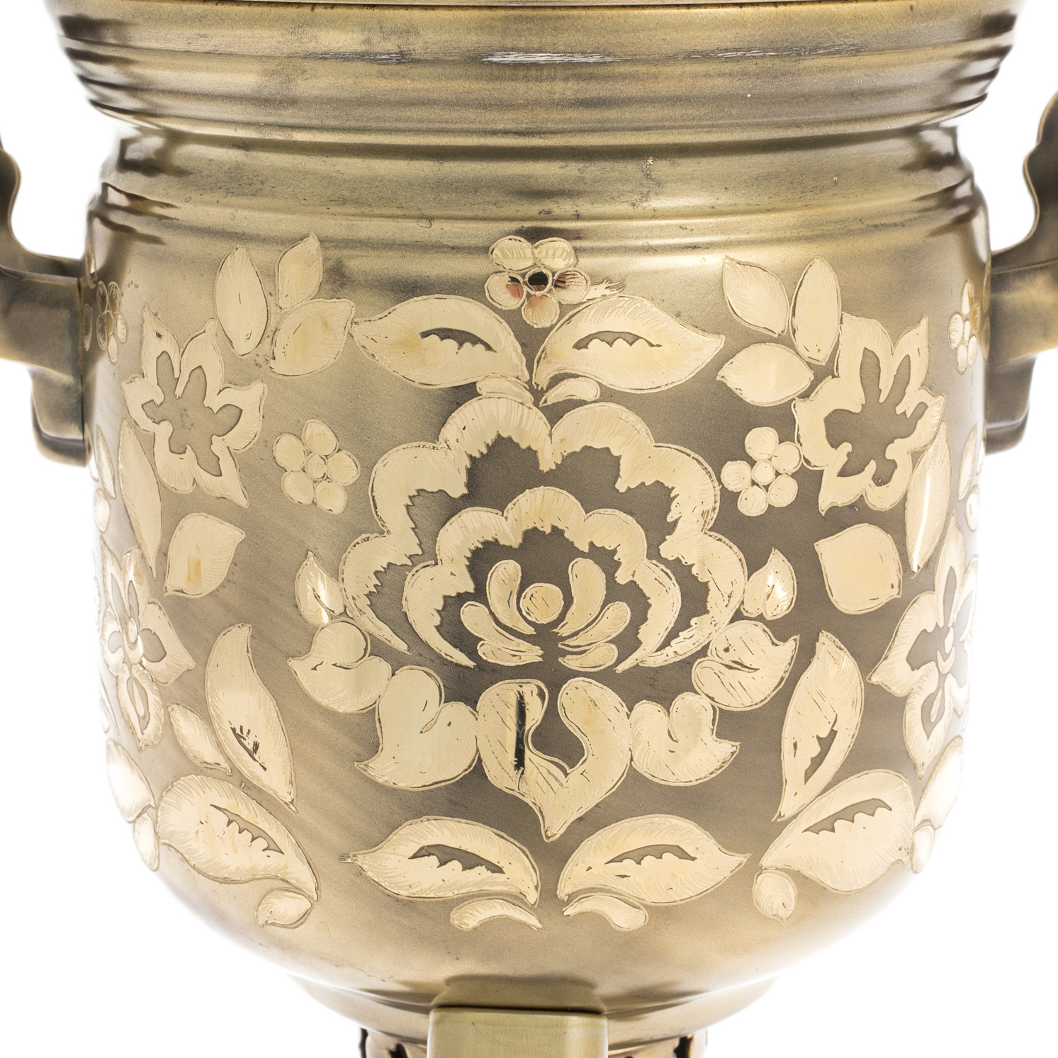Металлическое тело украшено флоральным орнаментом, нанесённым вручную техникой гравировки и тиснения по латуни. Цветочный узор выполнен в мягком сатиновом золоте, создающем игру света на матовой поверхности корпуса. Каждая линия — результат филигранной работы мастера, добившегося удивительной глубины даже в лаконичных мотивах. Чуть приподнятые лепестки, листья и стебли словно светятся изнутри — эффект достигается благодаря особому травлению и полировке с переменной зернистостью. Отполированные ножки, носик и венчик венчают композицию, подчёркивая аристократизм образа.