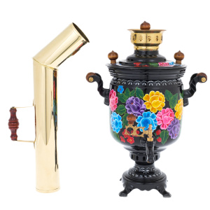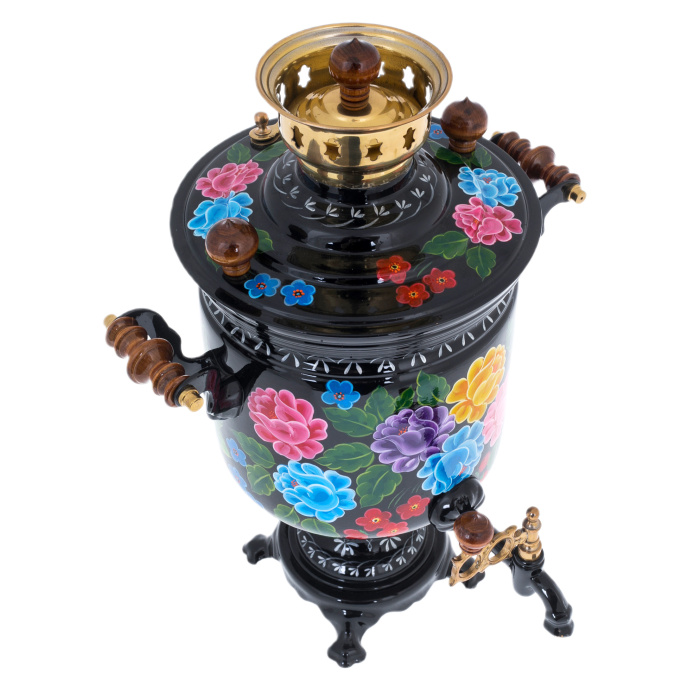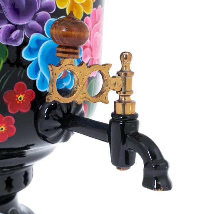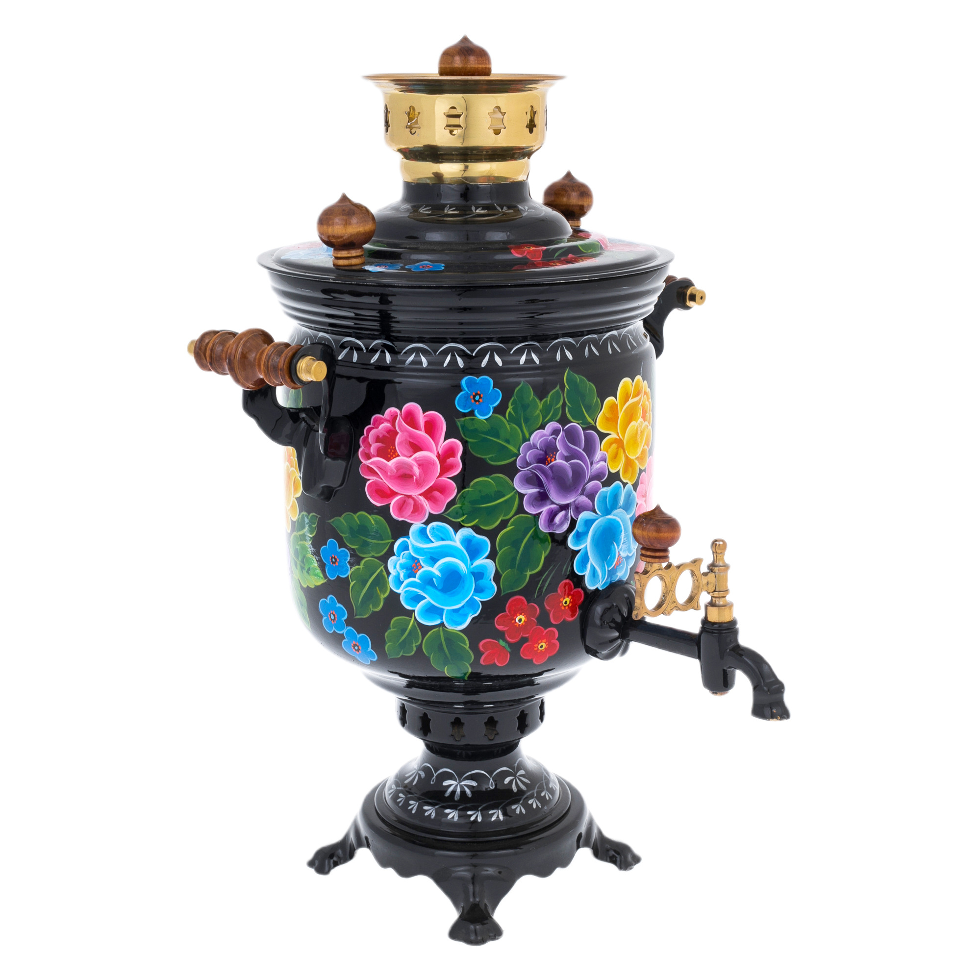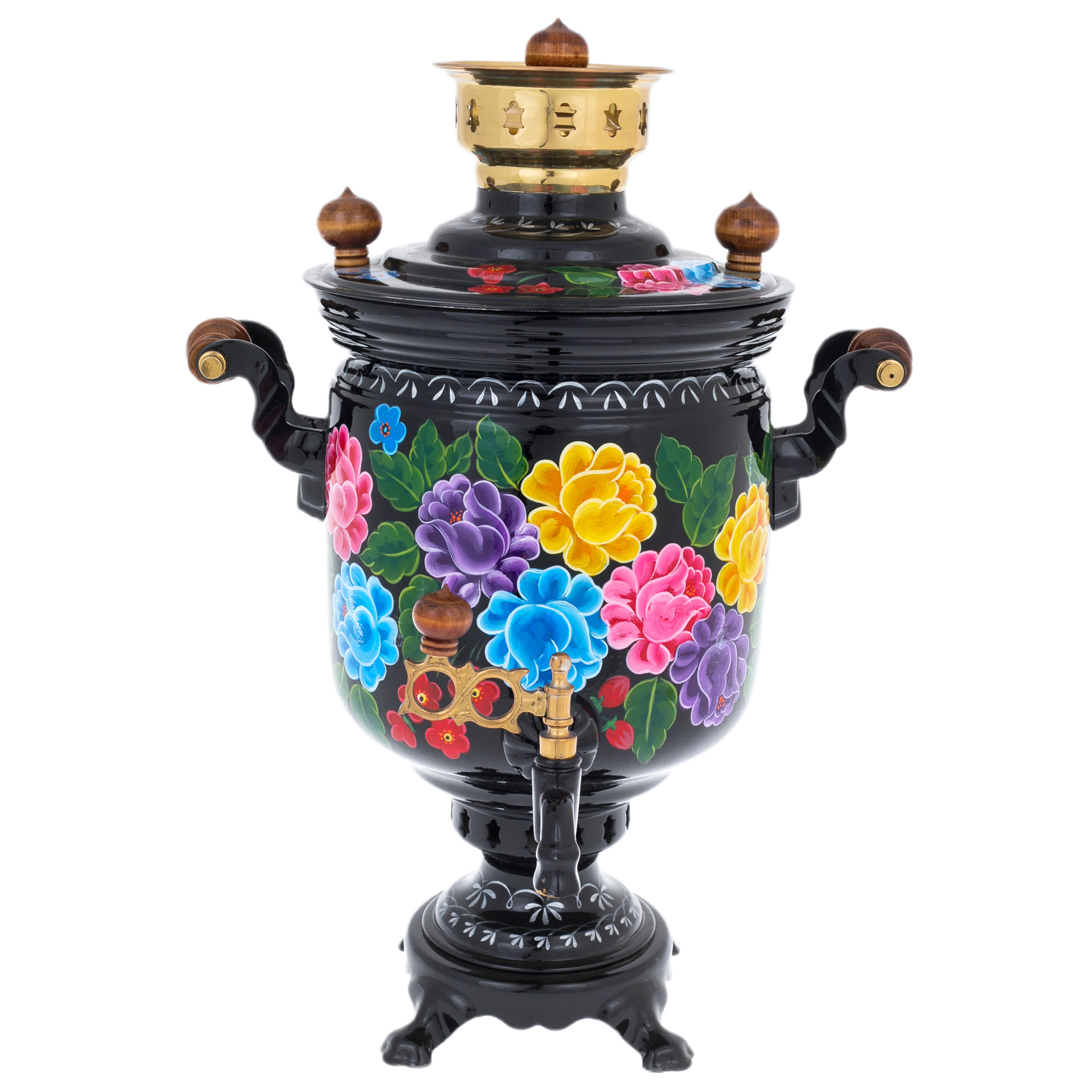 Радость, изобилие и яркая душа русского народного искусства заключены в этом самоваре. Его чёрный корпус стал фоном для буйства красок: пышные розы, пионы и незабудки, выписанные вручную в стиле традиционной росписи, словно оживают под блеском лака. Цветы расположены так, будто обвивают самовар, образуя вечный венок лета, тепла и чаепитий на свежем воздухе.