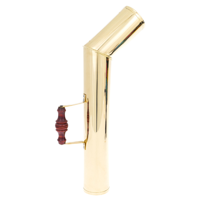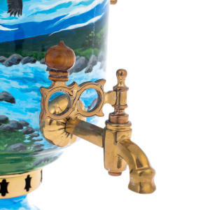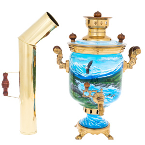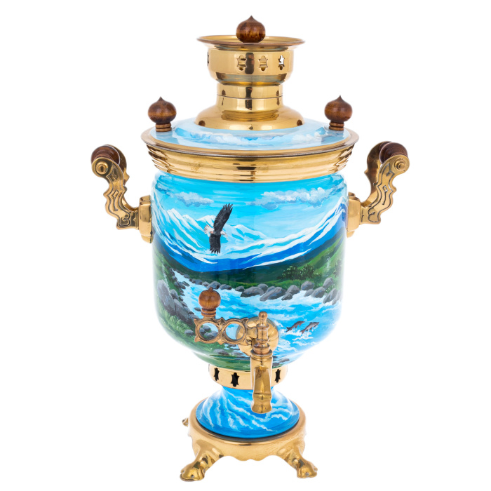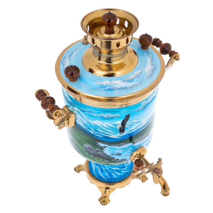 Контраст между матовыми пастельными тонами горной долины и сиянием золочёных деталей создаёт эффект драгоценного артефакта, предназначенного для интерьеров с высоким визуальным статусом. Латунные элементы — кран, венец, ручки и ножки — отполированы до зеркального блеска. Тёплая древесина набалдашников добавляет уютную нотку и подчёркивает ручную работу. Самовар снабжён трубой для полноценной работы на углях — дань исторической точности и функциональности, превращающей этот предмет в нечто большее, чем просто украшение.