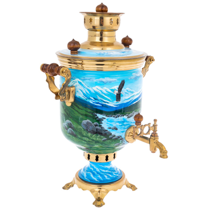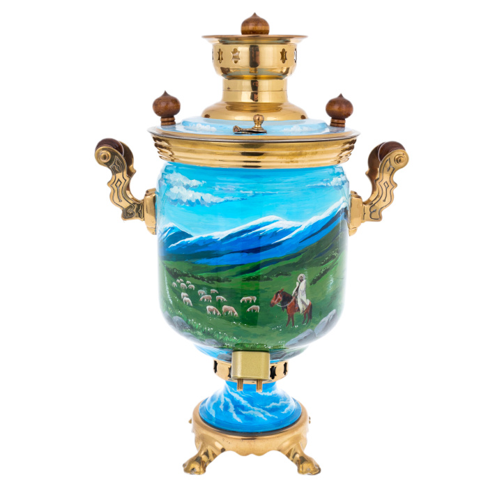 Комбинированный самовар объёмом 5 литров, украшенный живописным панорамным пейзажем Кавказа, — подлинный предмет коллекционного и декоративного значения, рождающий ощущение прикосновения к архаике, где чаепитие превращается в неспешный ритуал. Его форма, повторяющая традиции тульских мастеров, сохраняет совершенные пропорции, в которых утилитарность переплетается с искусством. Тело самовара из латуни вручную расписано в технике, близкой к лаковой миниатюре: живые краски, нанесённые тонкими кистями, с любовью выстраивают сложную композицию, охватывающую круговую поверхность сосуда. В центре сюжета — горный поток, уносящийся вдаль под голубым небом, орёл, парящий над хребтами, и всадник, направляющий стадо овец к подножию заснеженных вершин.