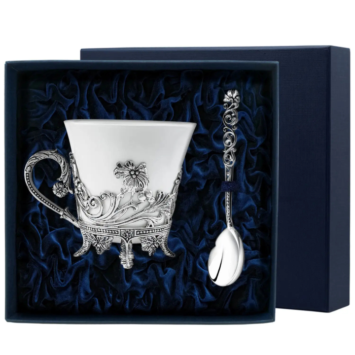Серебряная чайная пара "Цветочная" новая ; чашка, ложка чайная, на 1 персону