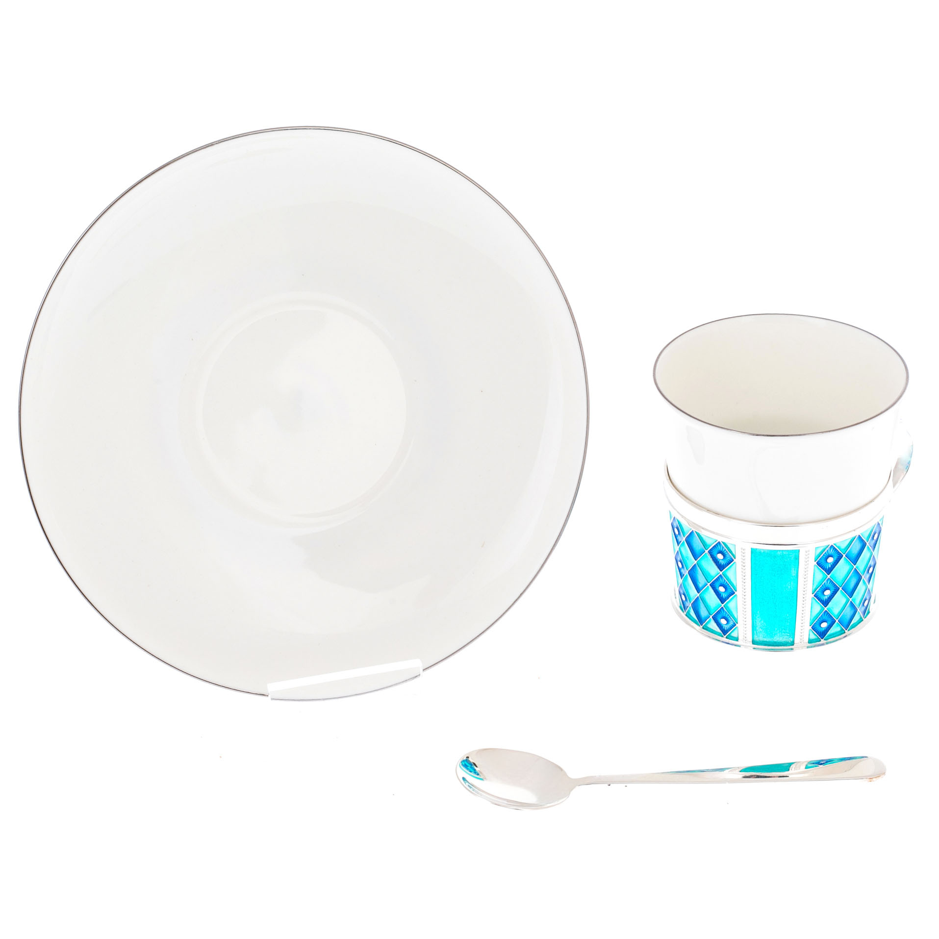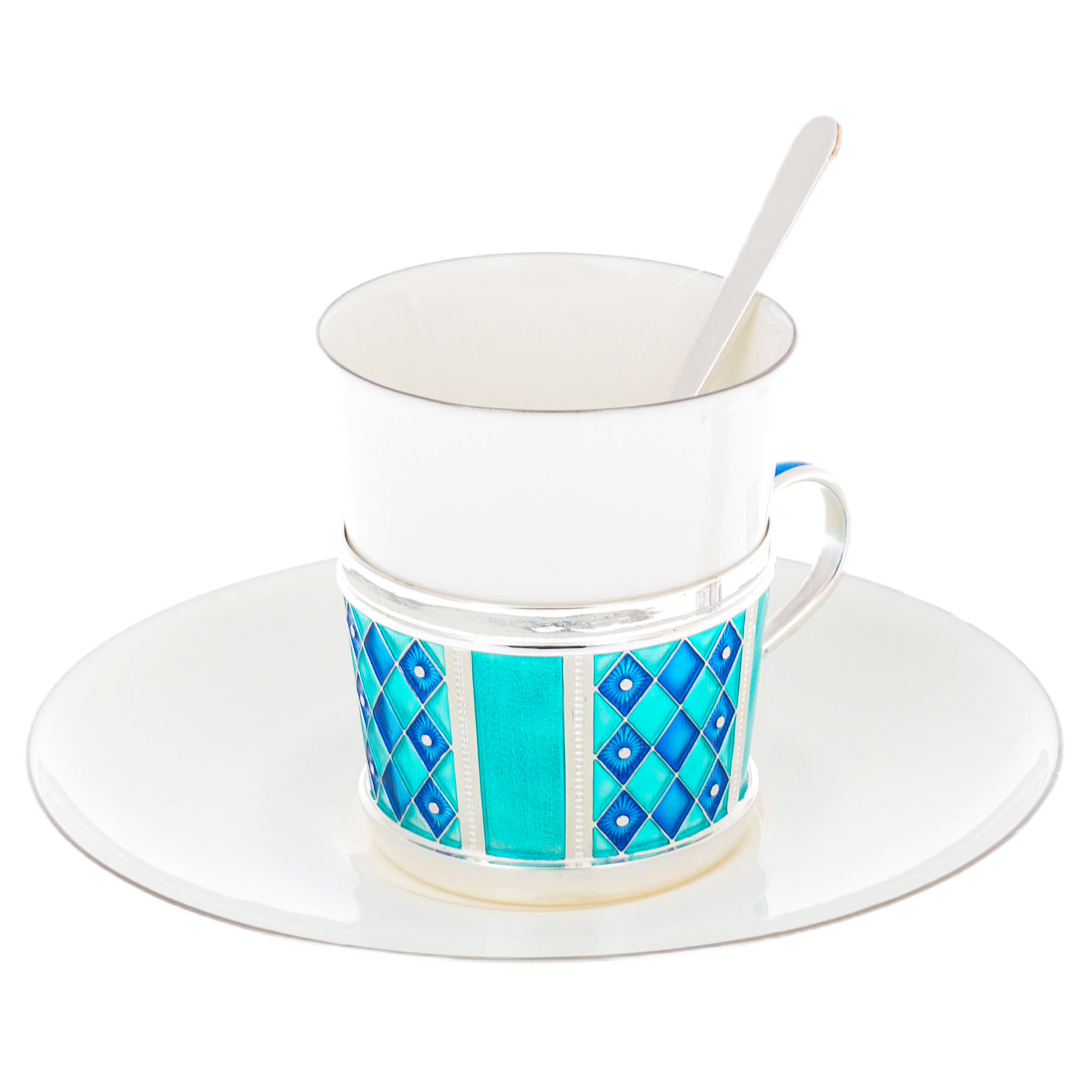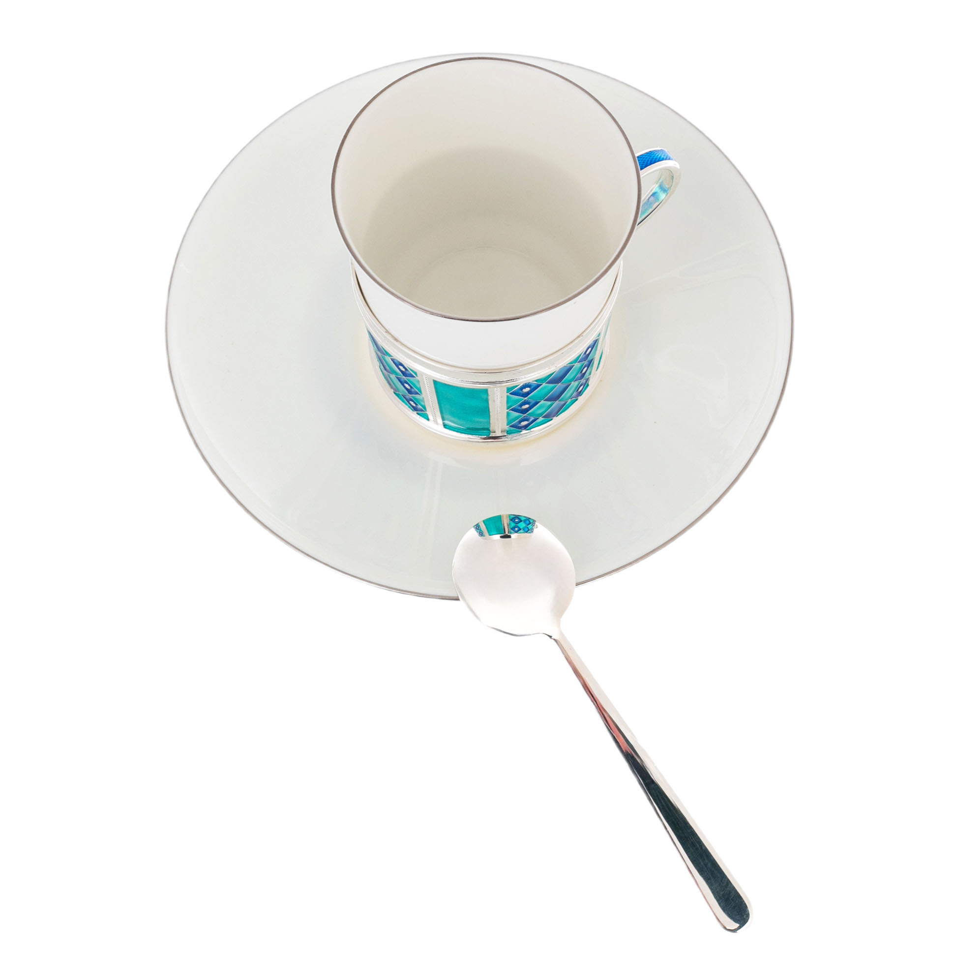 Кофейная пара из серебра и фарфора "Сетка" на 1 персону, голубая