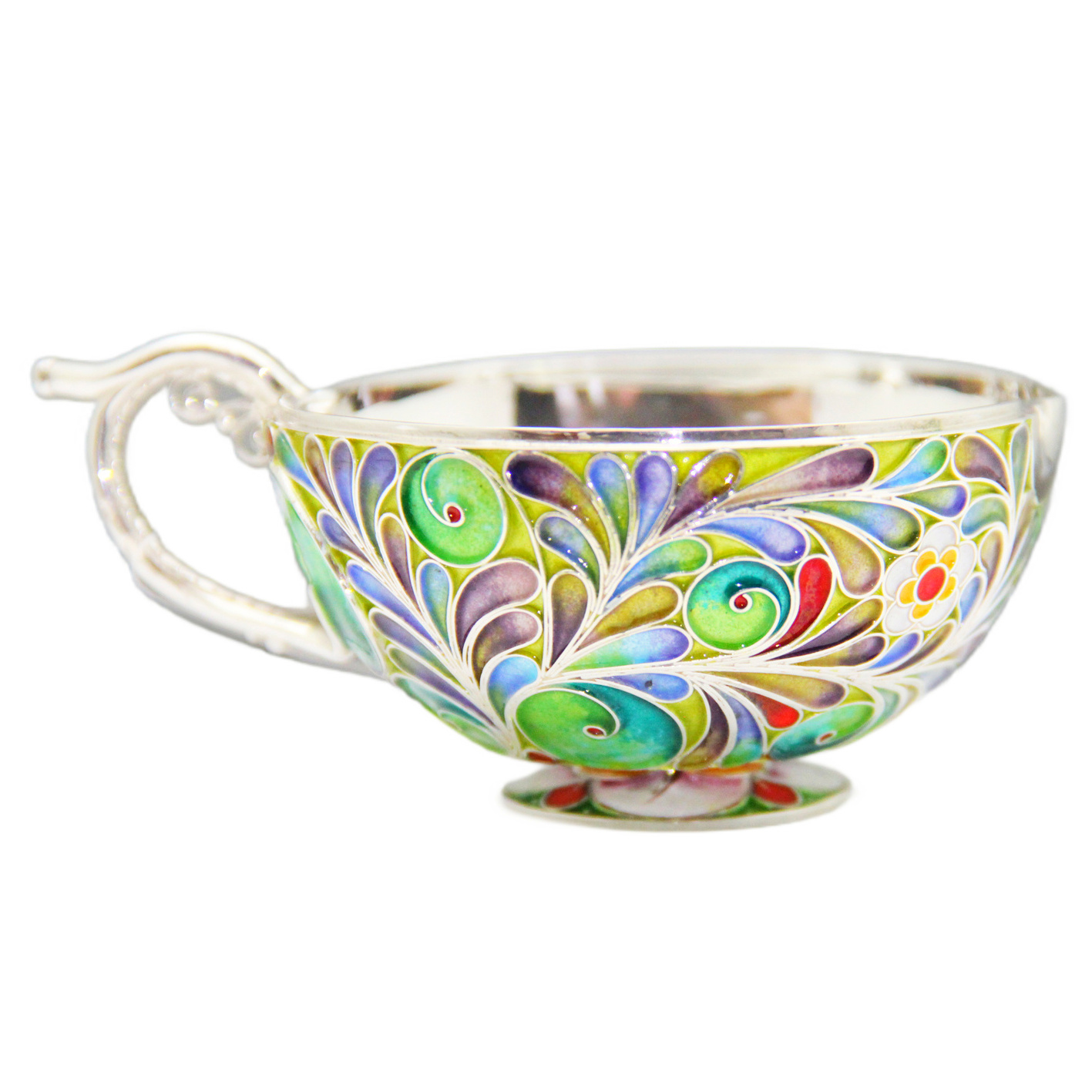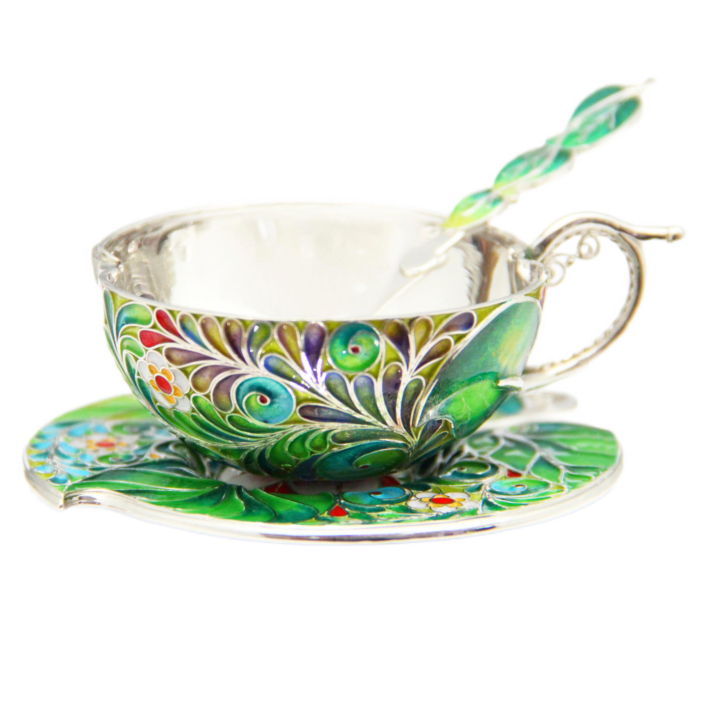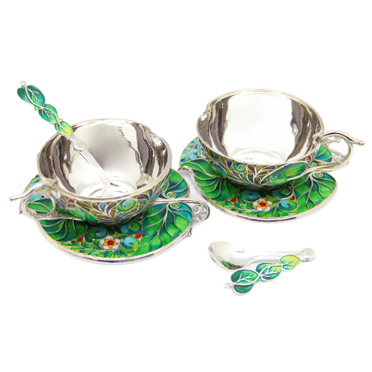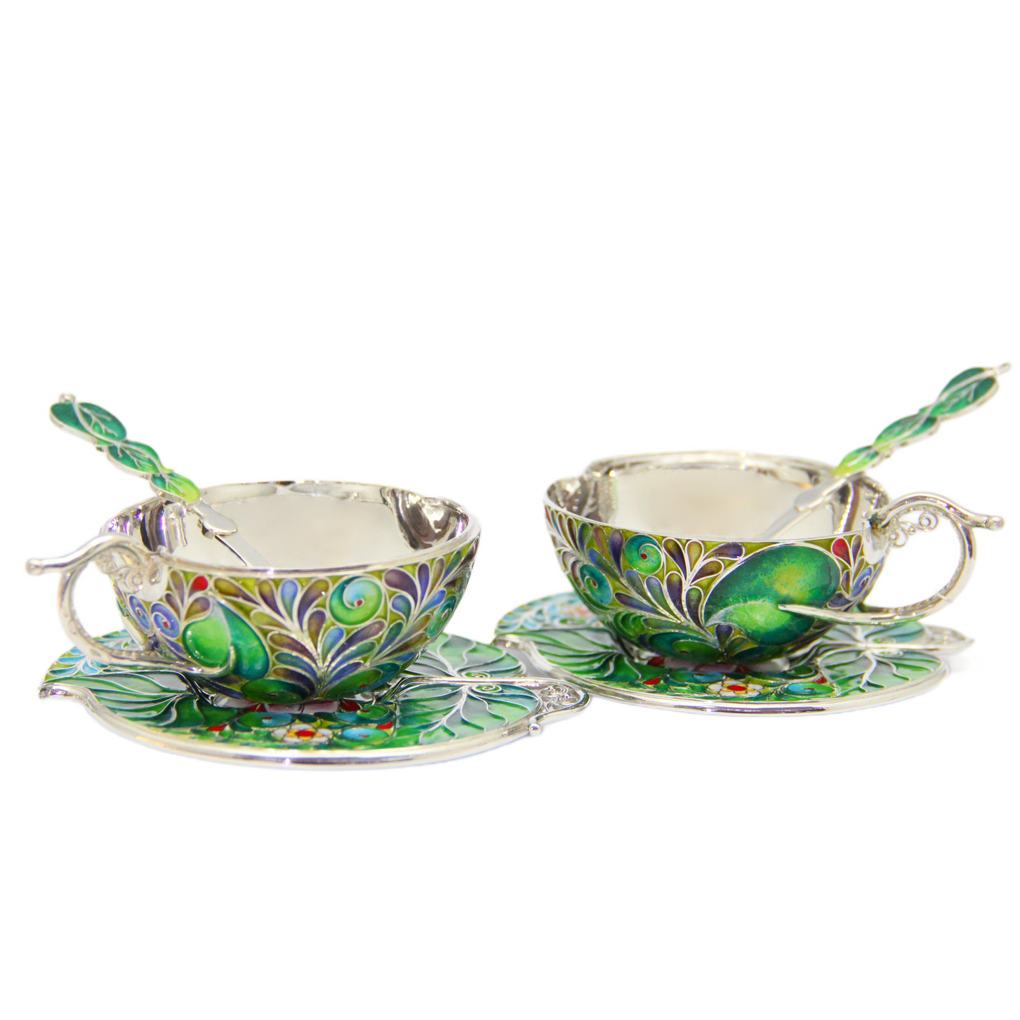 Кофейная пара из серебра "Зеленое яблоко" на 2 персоны, финифть