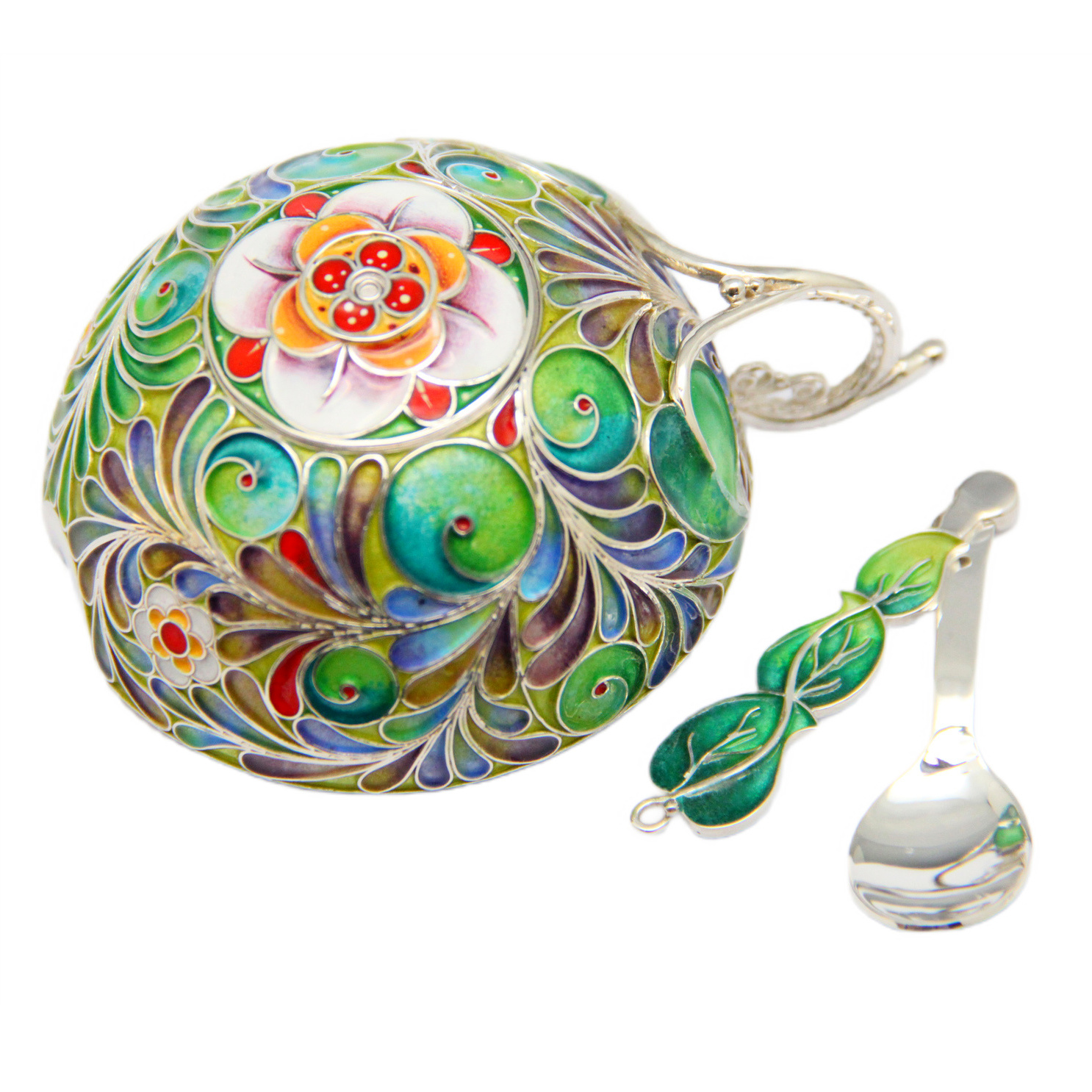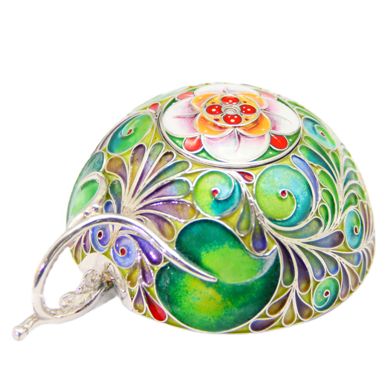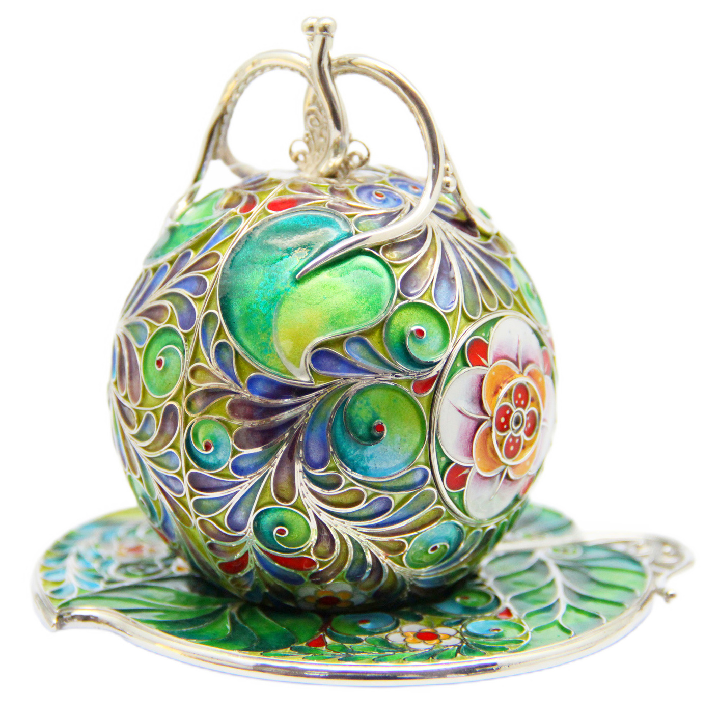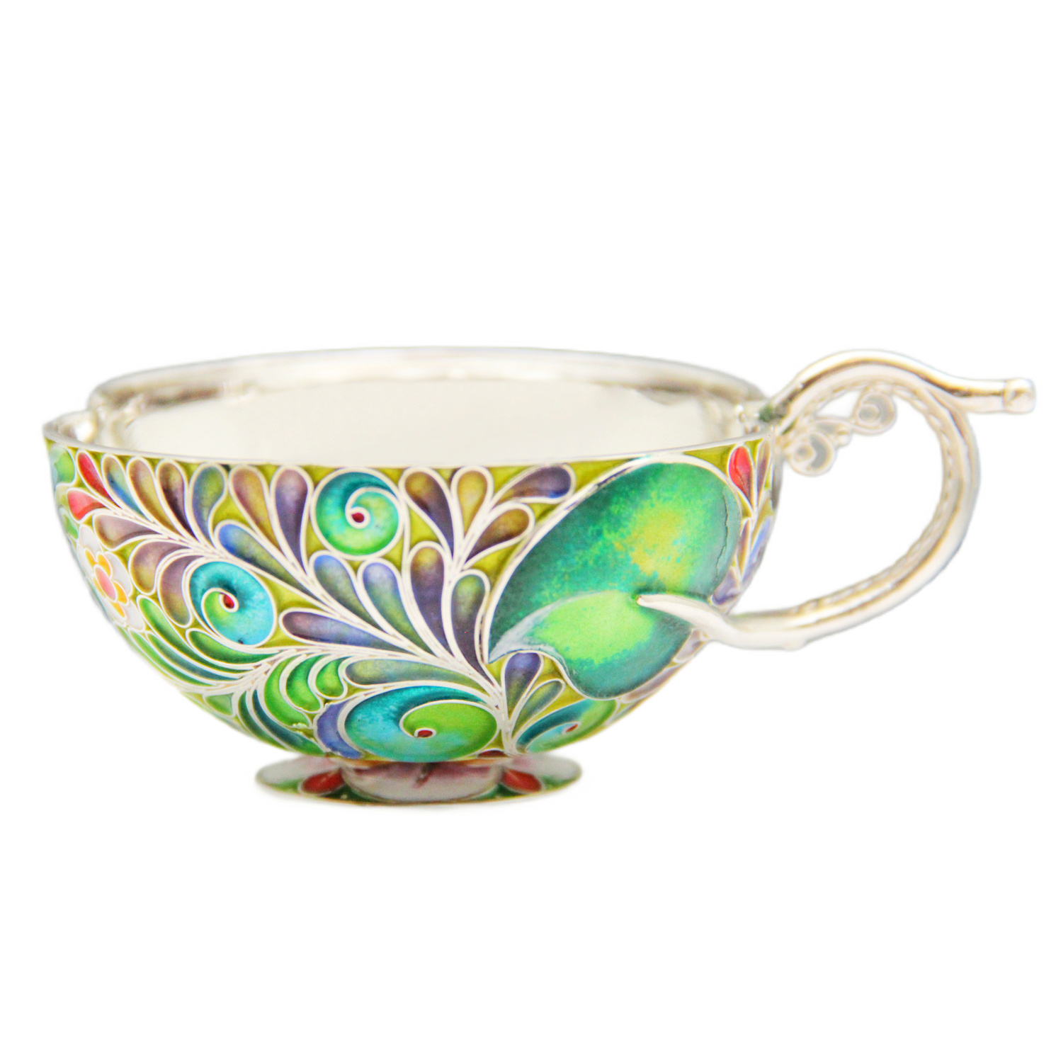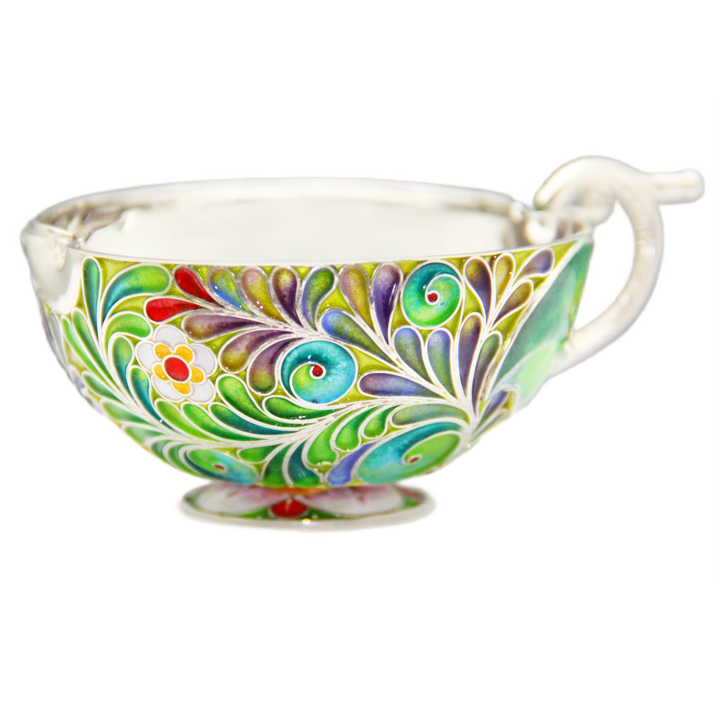 Кофейная пара из серебра "Зеленое яблоко" на 2 персоны, финифть