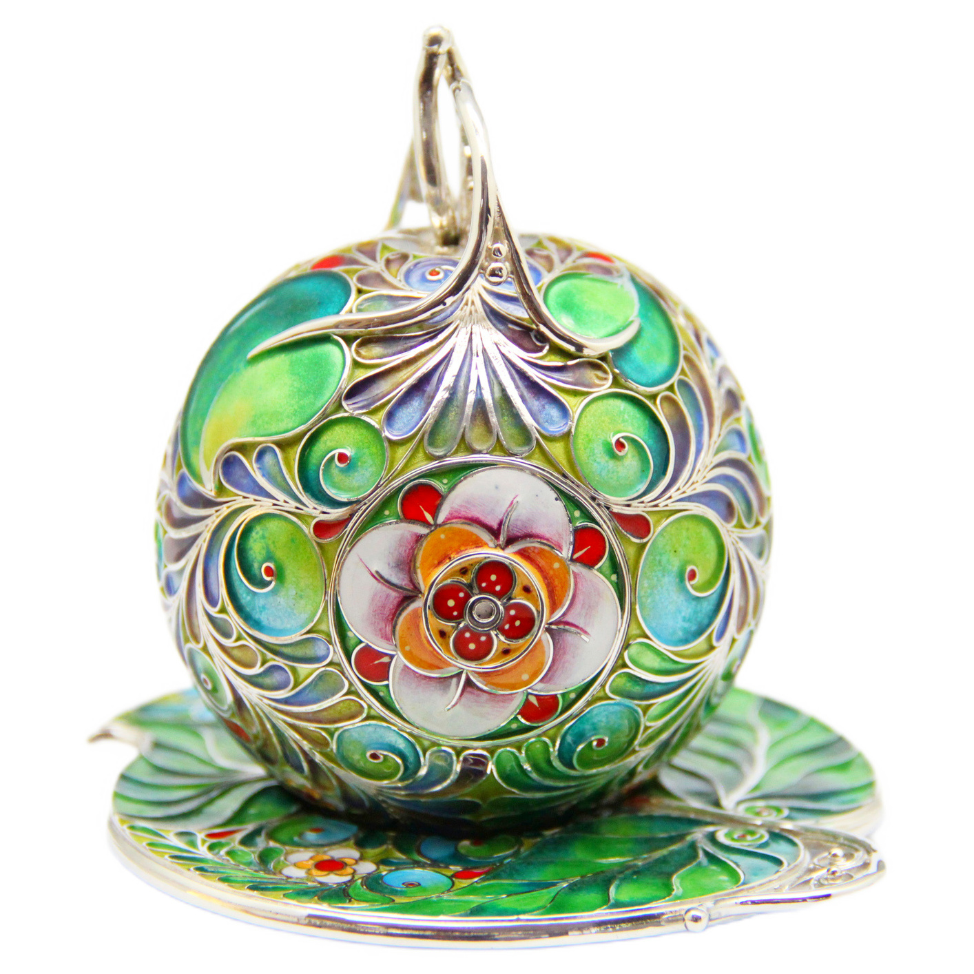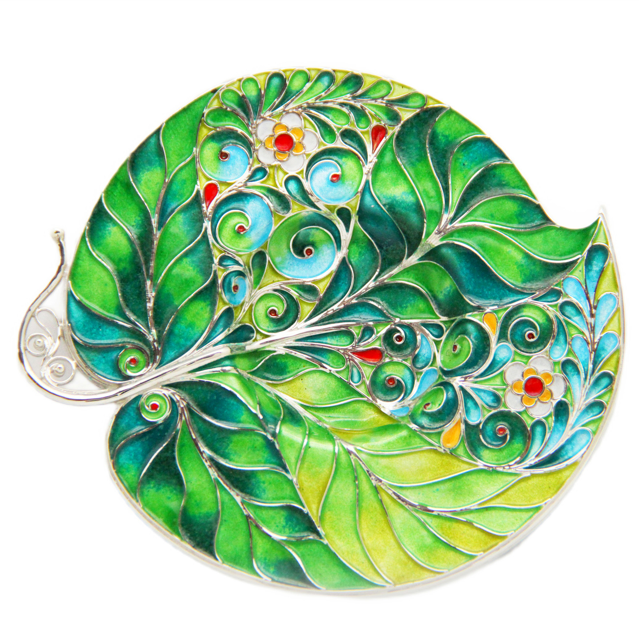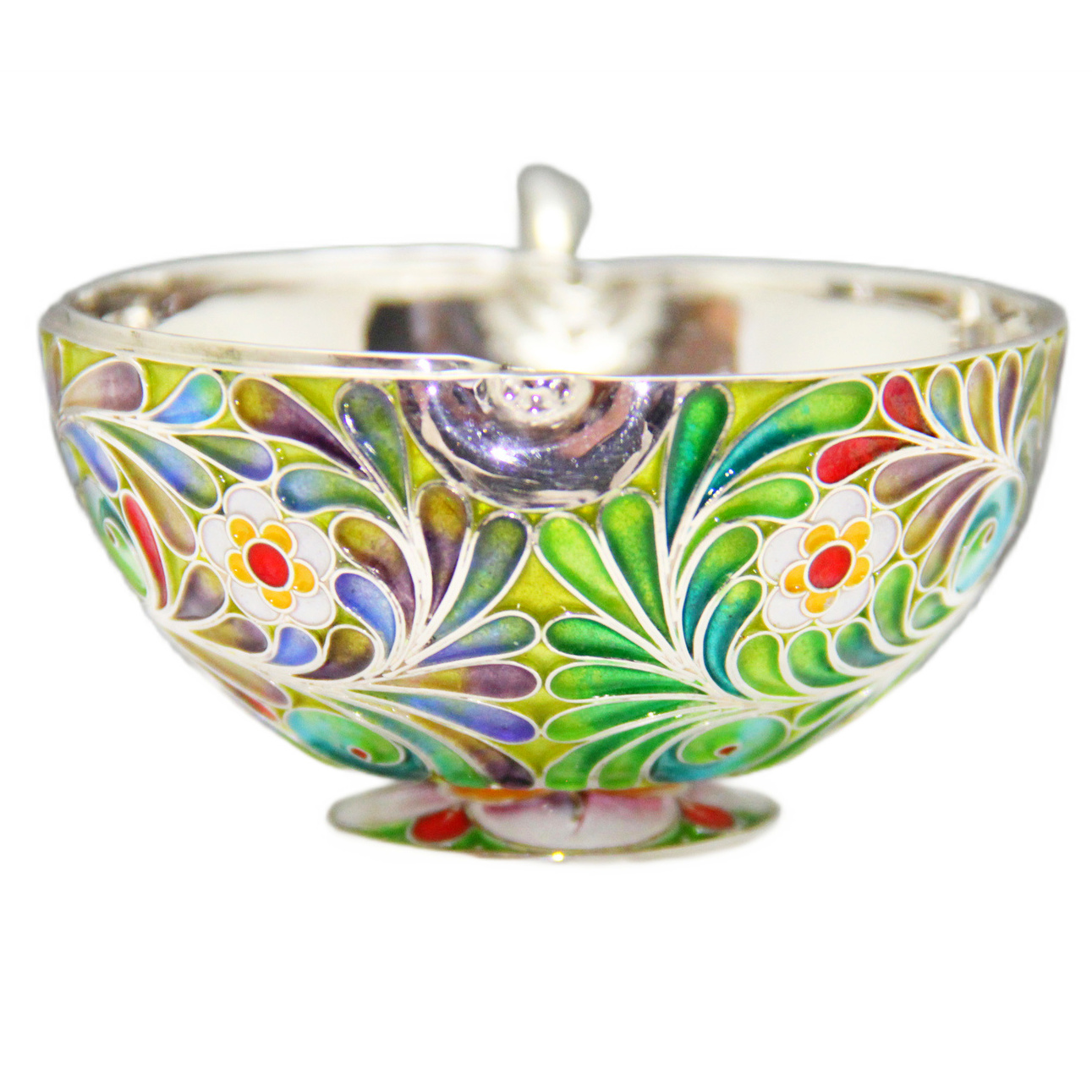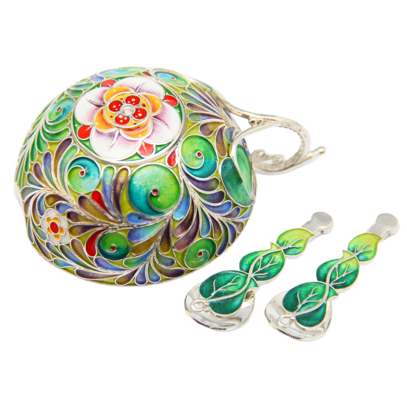 Кофейная пара из серебра "Зеленое яблоко" на 2 персоны, финифть
