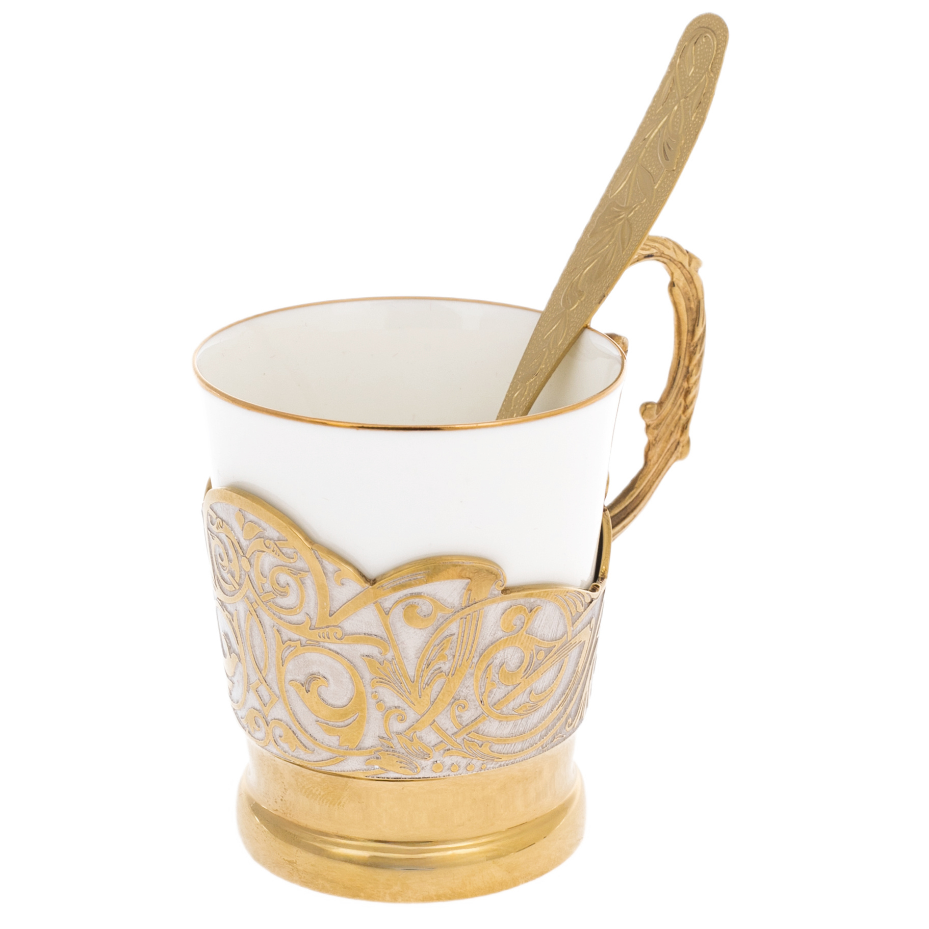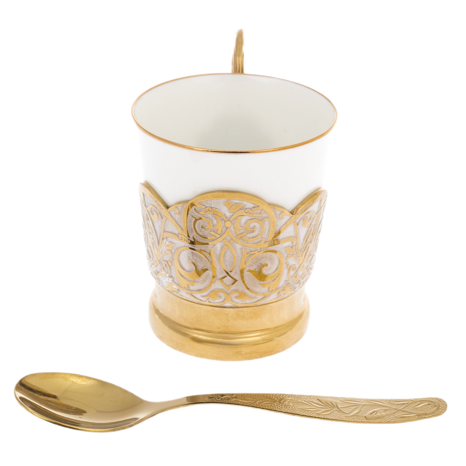 Ложечка с золотистым покрытием, гармонично дополняющая комплект, выглядит столь же изысканно. Ее плавные линии, также украшенные элегантной гравировкой, подчеркивают утонченность всего набора, напоминая о величии каждой детали, не подчиняющейся времени. Это не просто сервиз, это часть вашего стиля, вашей философии.