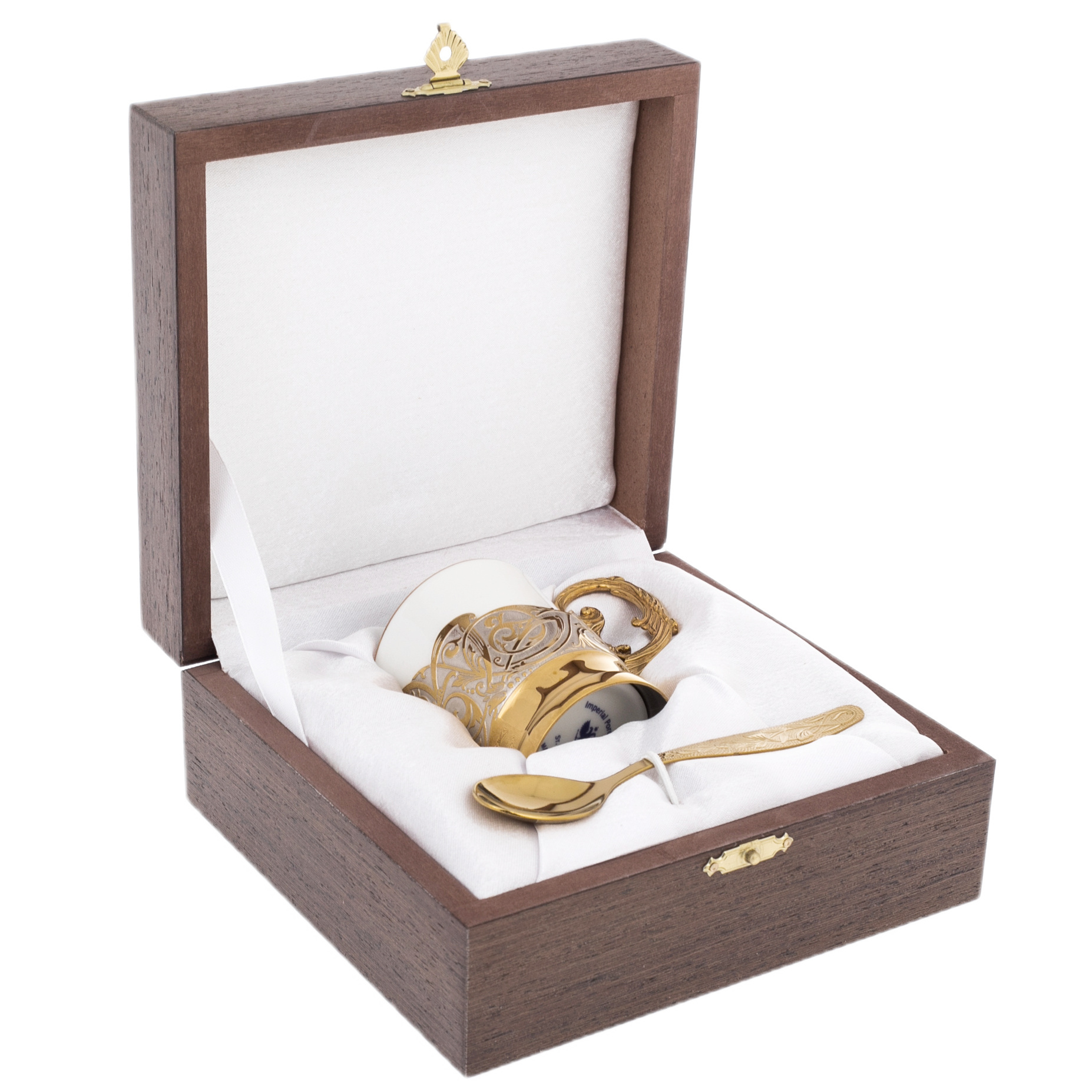 Кофейная пара "Звезда" с эмалью, ЗлатоустКофейная пара "Звезда" с эмалью, ЗлатоустКофейная пара «Звезда» из Златоуста — произведение утончённого прикладного искусства, рожденное в диалоге фарфора, золота и горячей эмали. Композиция состоит из чашки с позолоченной оправой, блюдца с изысканным орнаментом и чайной ложки, украшенной в том же стиле. Плавные линии, роскошная палитра и благородный блеск материалов формируют ансамбль, достойный коллекции истинного эстета. Гармонично сочетаясь, насыщенный изумруд и солнечное золото создают образ, передающий величие Востока и архитектурную строгость классики. Комплект укомплектован подарочной коробкой с бархатной отделкой, подчёркивающей исключительность предмета.