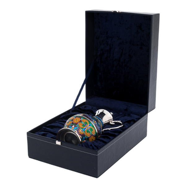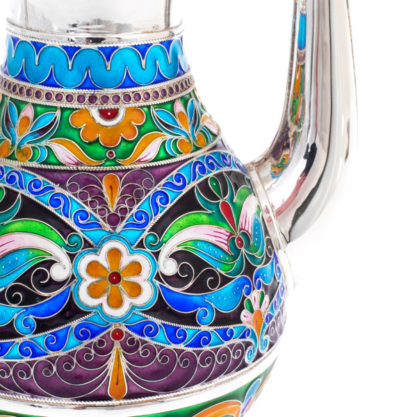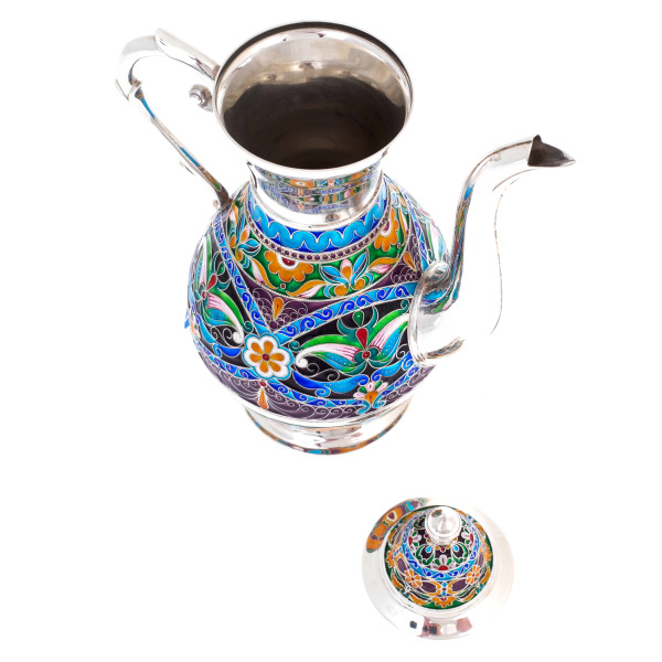 Серебряный кофейник с финифтью — изысканный шедевр ювелирного искусства, сочетающий восточную утончённость силуэта и старинные русские эмалевые традиции. Гармоничные пропорции, высокая фигурная крышка, изогнутый носик и плавная ручка создают элегантный облик, в котором красота формы подчёркнута сложнейшим декором. Основной объём кофейника украшен орнаментальными вставками, выполненными в насыщенной палитре: синий, лазурный, изумрудный, тёплый янтарный и бордовый цвета соединяются в пышных цветочных композициях, создающих ощущение богатства, тепла и торжественности.