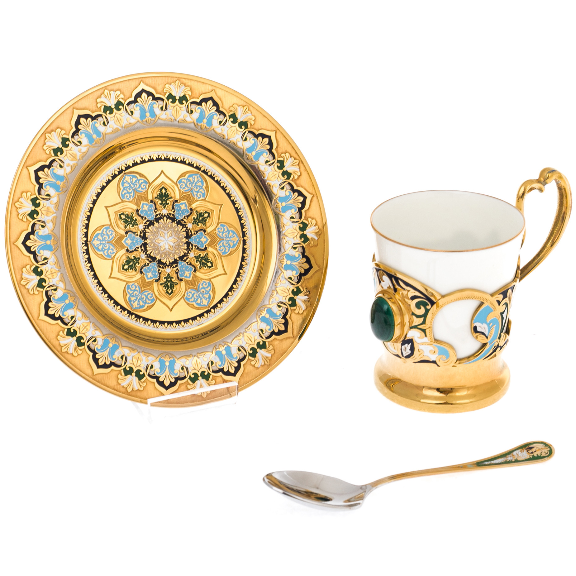 Кофейный набор «Рассвет» — воплощение торжественного ритуала, обращённого к тем, кто привык начинать день с элегантности. В набор входят чашка, блюдце и ложка, оформленные в едином стиле. Белоснежный фарфор обрамлён золочёной оправой из латуни с насыщенной эмалью, образующей изящные цветочные мотивы. Каждая линия, каждая деталь будто создана для того, чтобы подчеркнуть важность мгновения — будь то утренний кофе наедине с мыслями или неспешный разговор в тишине личного кабинета.