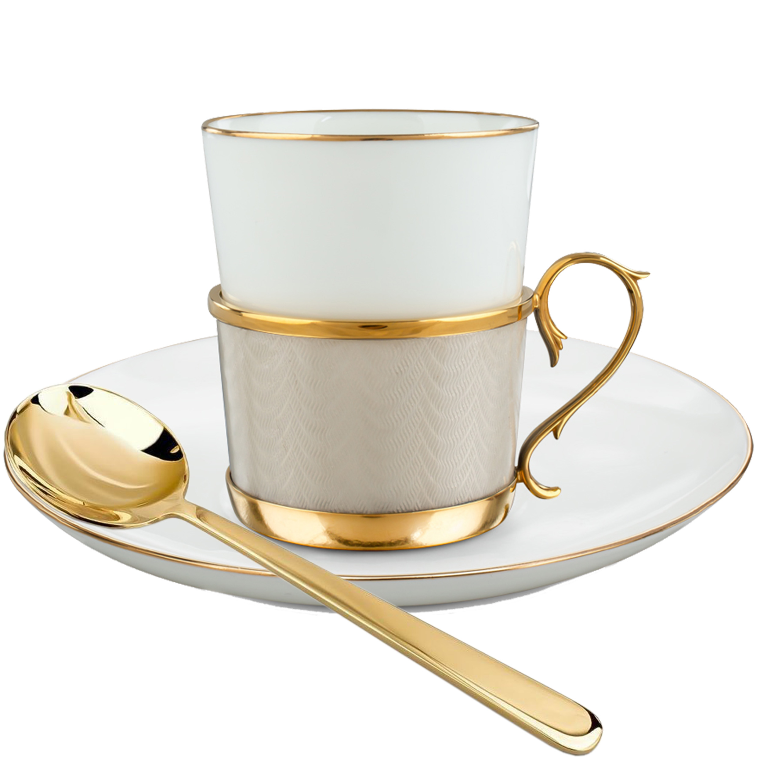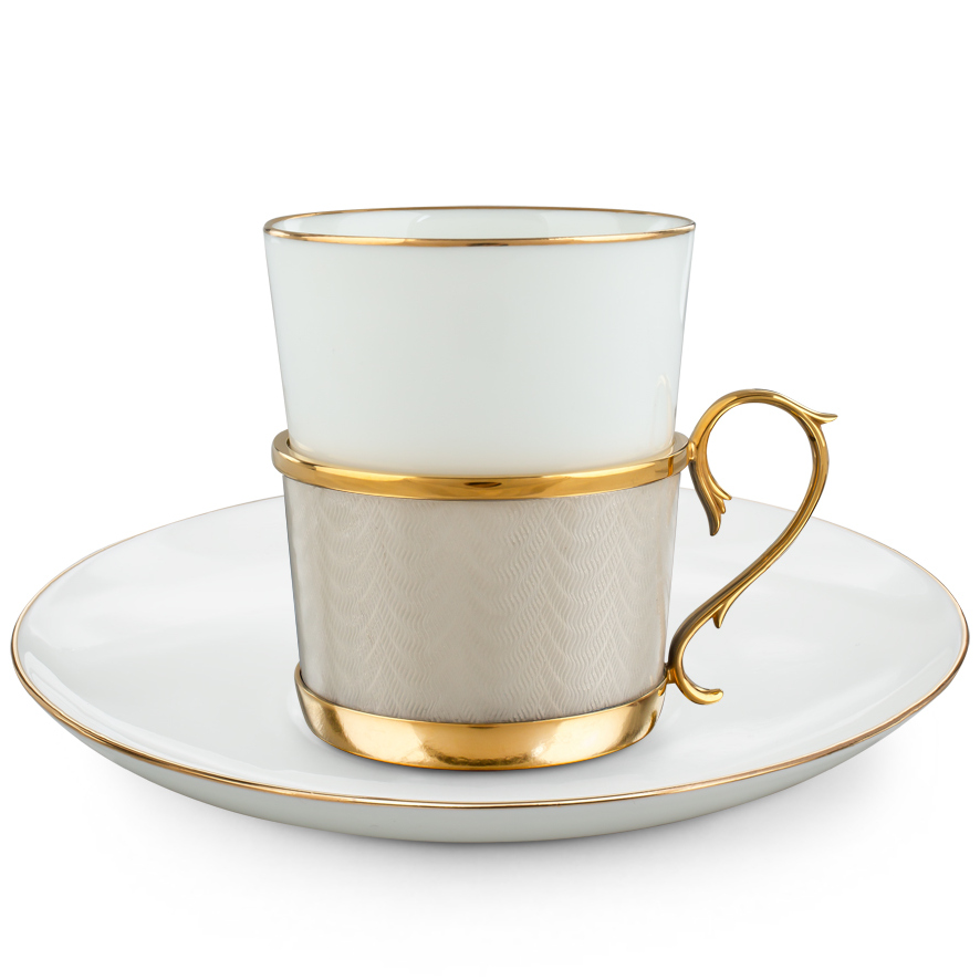 Оправа чашки выполнена из ювелирного сплава с глянцевым золотым покрытием. Цвет жемчужной эмали, нанесённой в технике прозрачной горячей эмали по гильоше, придаёт каждому элементу глубину и живую игру света. Изогнутая ножка ручки и ободок дополняются идеальной гладкостью блюдца и зеркальной поверхностью ложки, отлитой из того же металла. Все элементы набора объединены в единую композицию, где каждая деталь дополняет другую, создавая завершённый и безупречный образ.