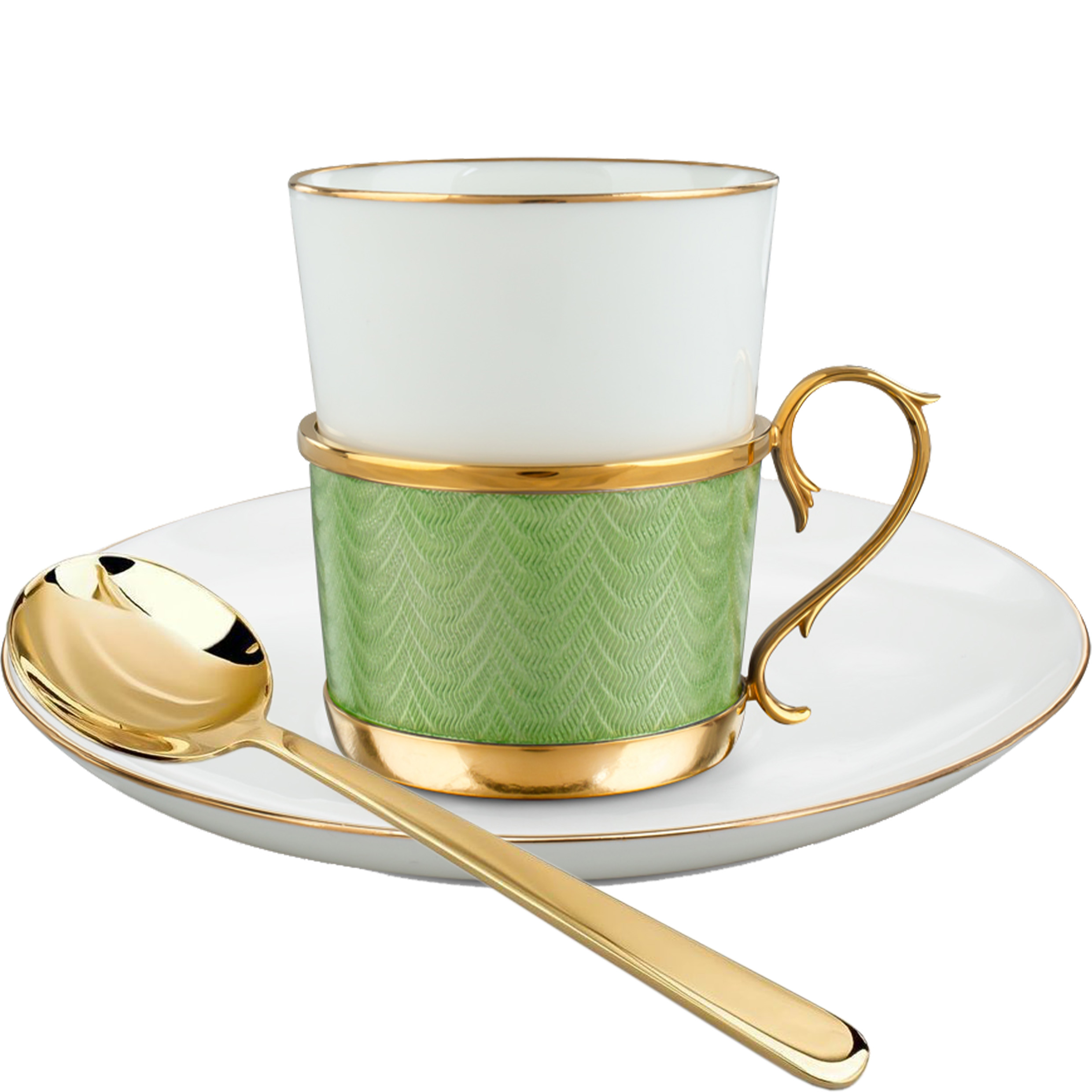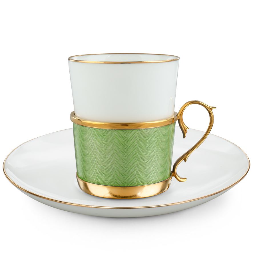 Эта кофейная пара — образец интеллигентной роскоши, в которой сдержанная геометрия сочетается с тонкостью ювелирной отделки. Элегантная чашка из фарфора покоится в оправе из благородного металла с изысканным гильошированным узором и изогнутой ручкой в классическом стиле. Каждая линия выверена, каждая деталь отточена — от утончённого контура блюдца до ложки с зеркальным блеском, уравновешивающей композицию.