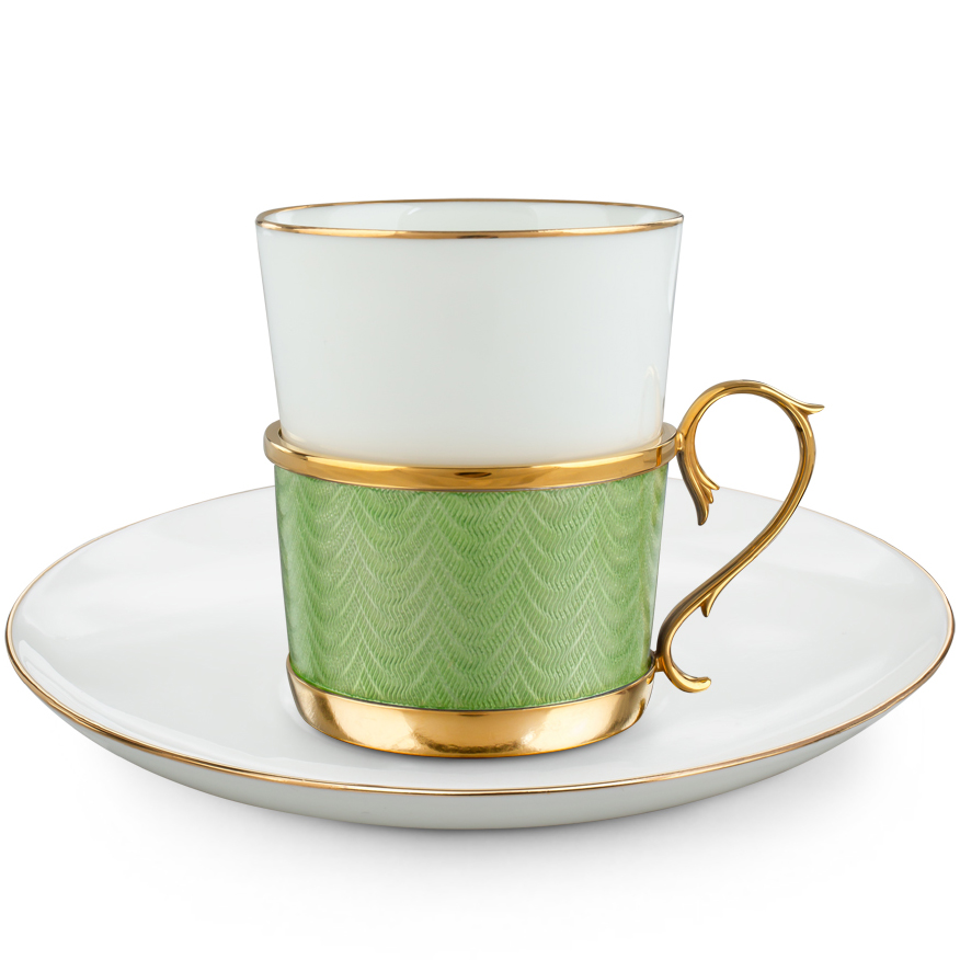Оправа чашки выполнена из ювелирного сплава с глянцевым золотым покрытием. Цвет салатовой эмали, нанесённой в технике прозрачной горячей эмали по гильоше, придаёт каждому элементу глубину и живую игру света. Изогнутая ножка ручки и ободок дополняются идеальной гладкостью блюдца и зеркальной поверхностью ложки, отлитой из того же металла. Все элементы набора объединены в единую композицию, где каждая деталь дополняет другую, создавая завершённый и безупречный образ.