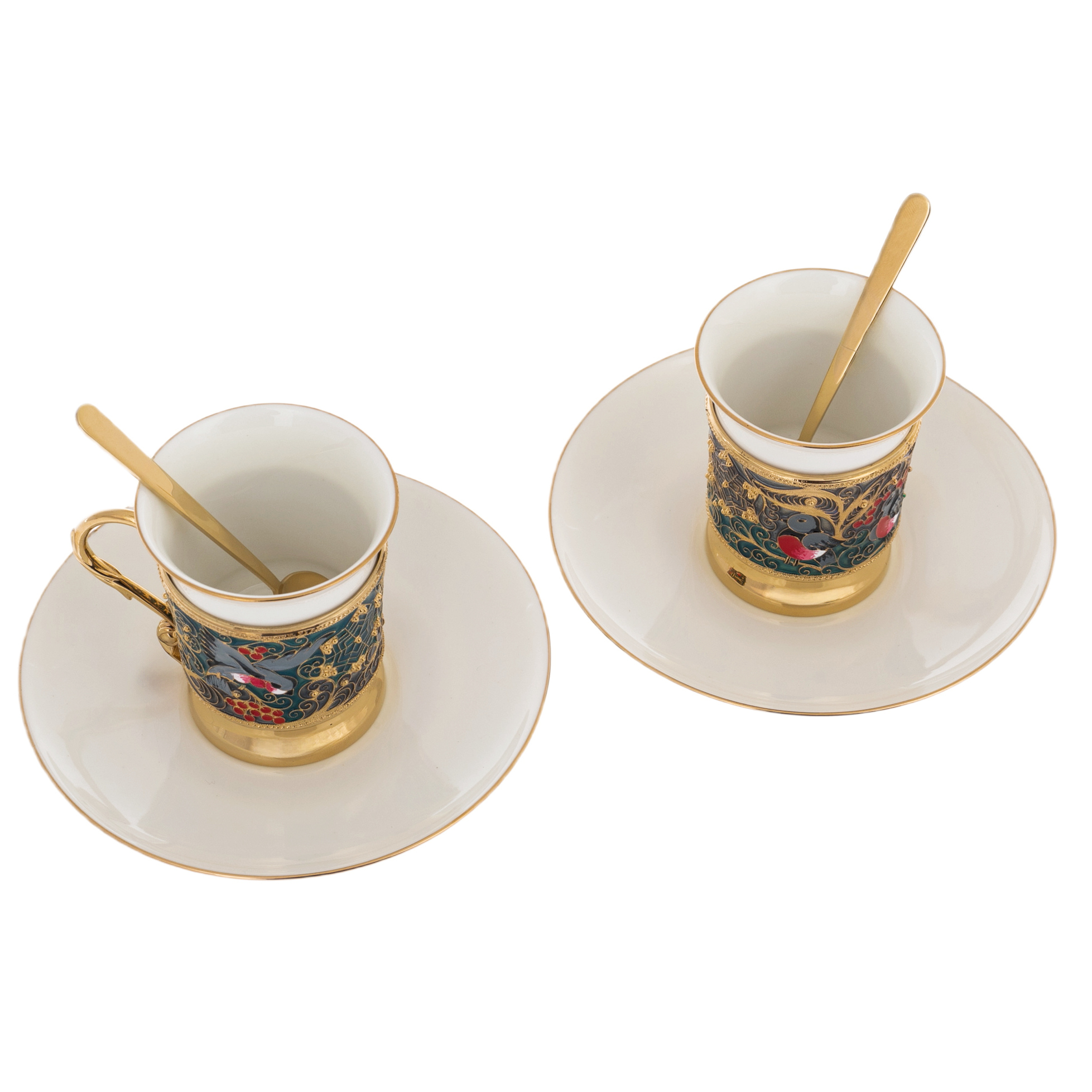 Дополнением к набору служат ложечки, выполненные в том же золочёном исполнении. Их гладкая поверхность и безупречные пропорции подчеркивают внимание к деталям, превращая каждый глоток кофе в ритуал, где форма сливается с содержанием. Блюдца, обрамляющие композицию, отражают свет и придают сервировке лёгкость и воздушность.