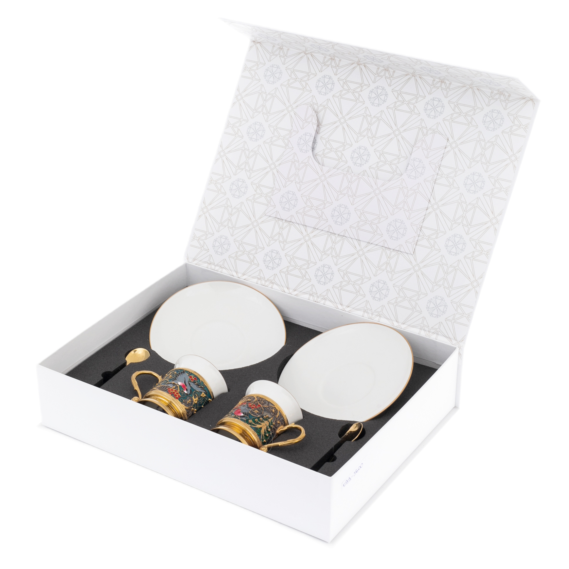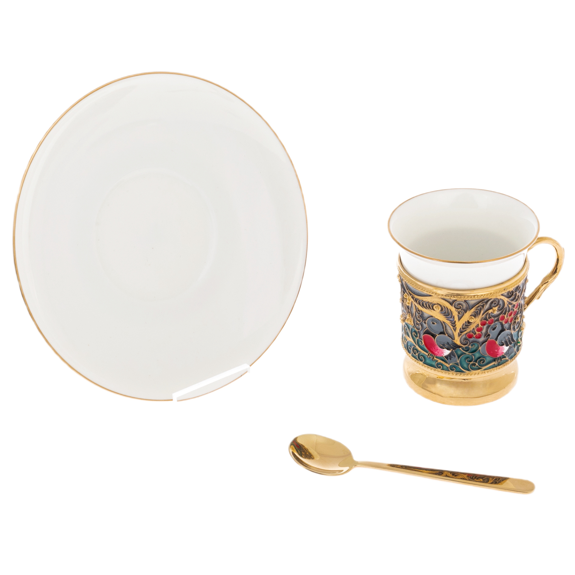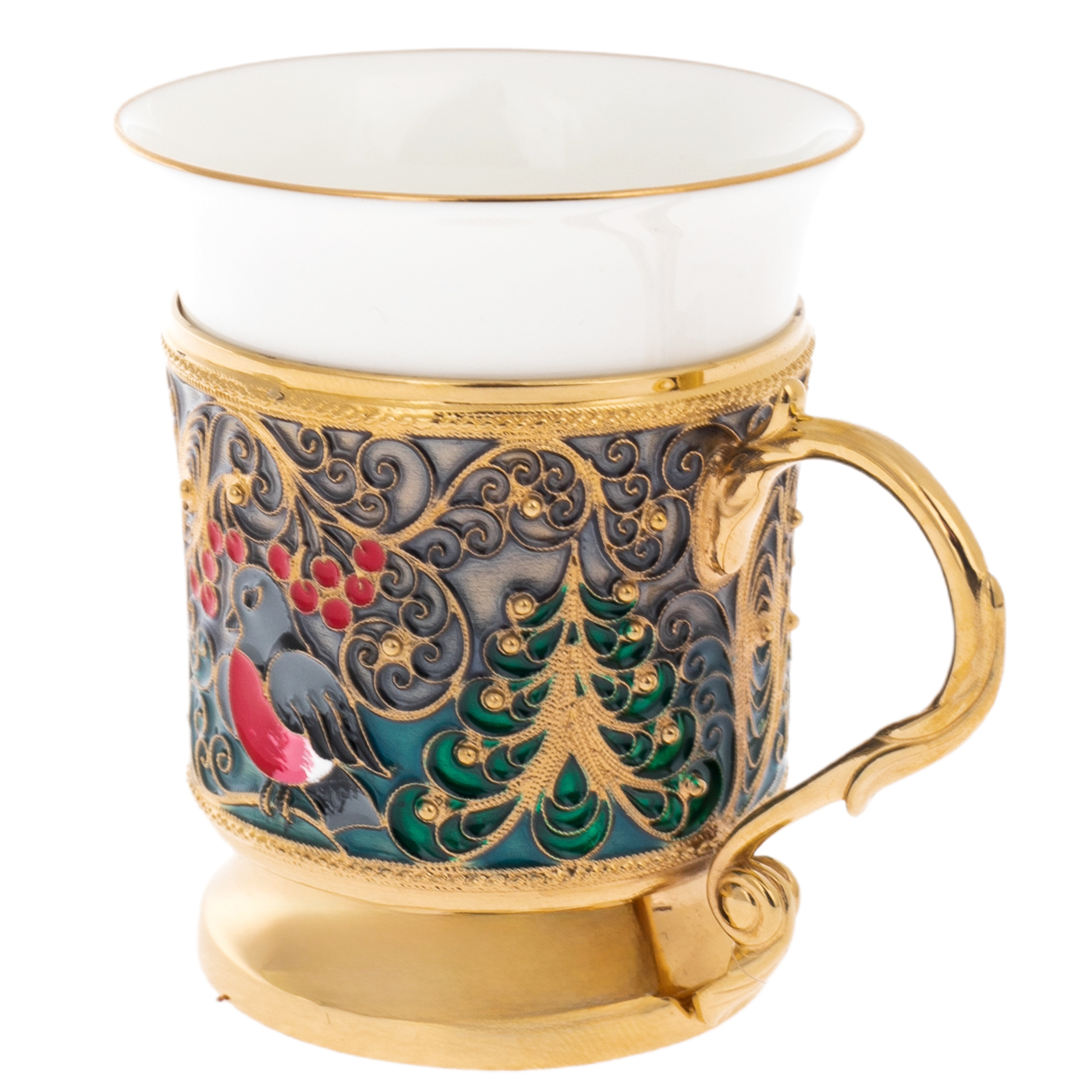 Кофейный набор "Снегири" — это гимн гармонии и искусству наслаждения моментами, где каждая деталь бережно сотворена для истинных ценителей утончённого стиля. Изящные чашки, опоясанные золотом и расписанные вручную, переносят в мир, где царит покой и красота зимнего утра. Снегири, словно из сказки, уютно устроились на ветвях вечнозелёной ели, среди узоров, переплетающихся в орнаментальные завитки. Каждая линия, каждый мазок кисти мастера — это тонкая грань между декоративным искусством и философией предмета, созданного для тех, кто умеет видеть ценность в малом.