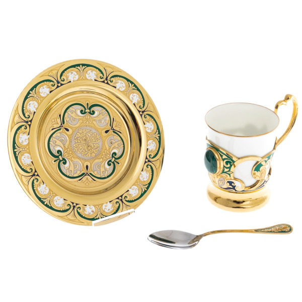 Набор для кофе "Изумрудный" с малахитом и эмалью, на 2 персоны, Златоуст