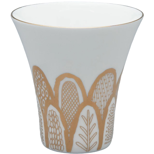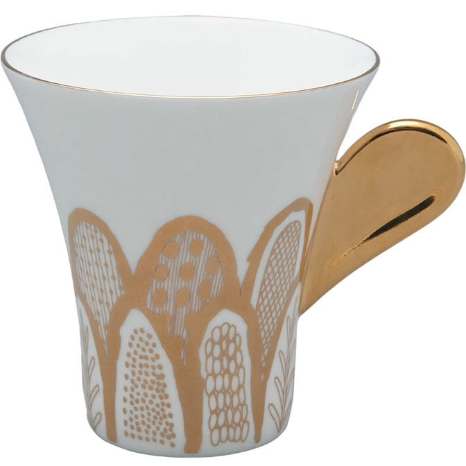 Выразительная, концептуальная – именно так можно охарактеризовать кофейную пару Модерн White. Линии чашки и непривычная форма ручки и блюдца завораживают своей причудливость. Рисунок, разработанный Верой Бакастовой, можно отнести к такому направлению в искусстве как art deco, отличительными особенностями которого, среди прочих, являются смелые геометрические и этнические узоры, а также сочетание белого цвета с золотым декором.