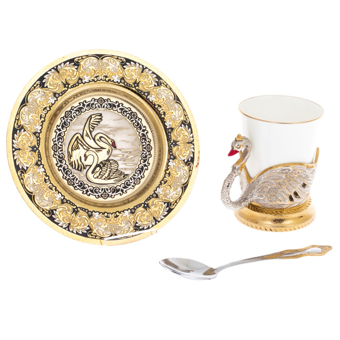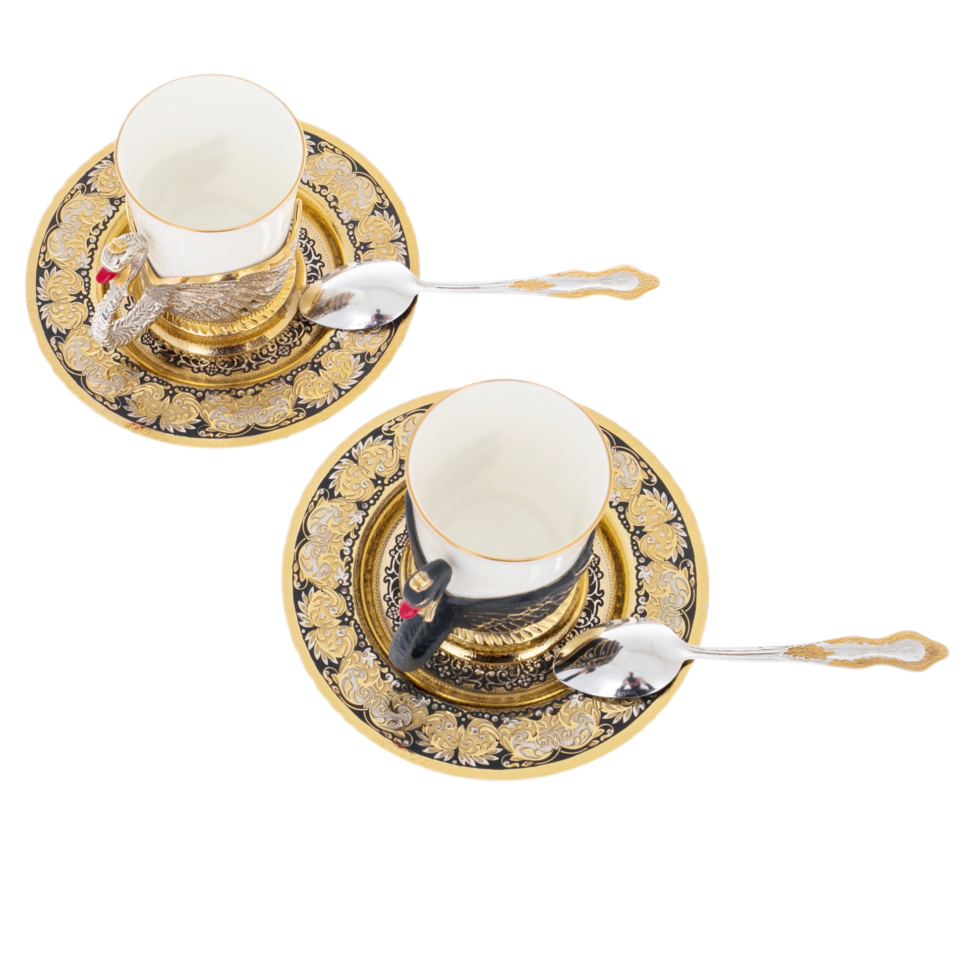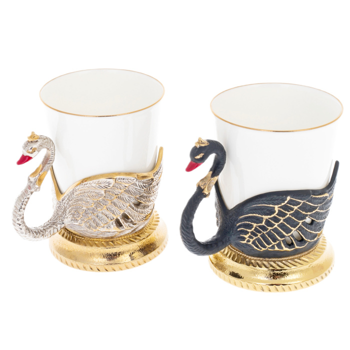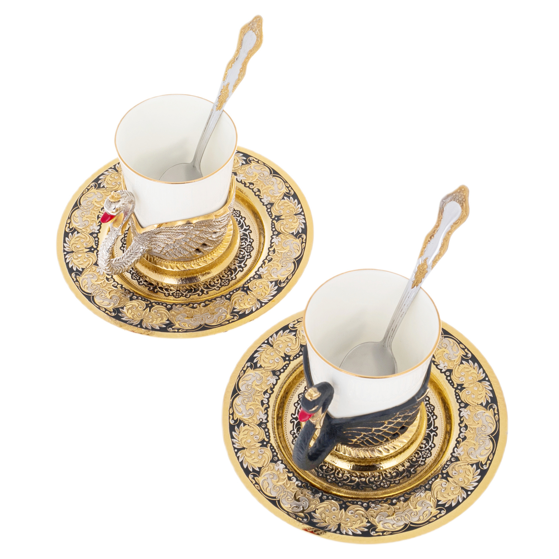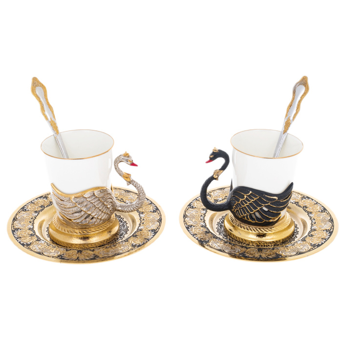 Кофейные пары "Лебеди" на 2 персоны — камерный набор для тех редких минут, когда утро хочется проживать красиво и неспешно. Две фарфоровые чашки молочно-белого оттенка с тонкой позолотой по краю установлены в изящные держатели, выполненные в виде лебедей: один — светлый, с серебристым сиянием металла, второй — глубокий чёрный, подчеркнутый контрастом золота. Рельефные крылья, графично прописанные перья, тонкая линия шеи, алый акцент клюва — каждая деталь воспринимается как миниатюрная скульптура, поддерживающая чашку без лишней массивности. Пары дополнены двумя блюдцами с роскошным орнаментом в золоте и чёрнении и двумя ложечками с декоративными, позолоченными элементами, завершающими ансамбль и подчёркивающими его подарочный характер.