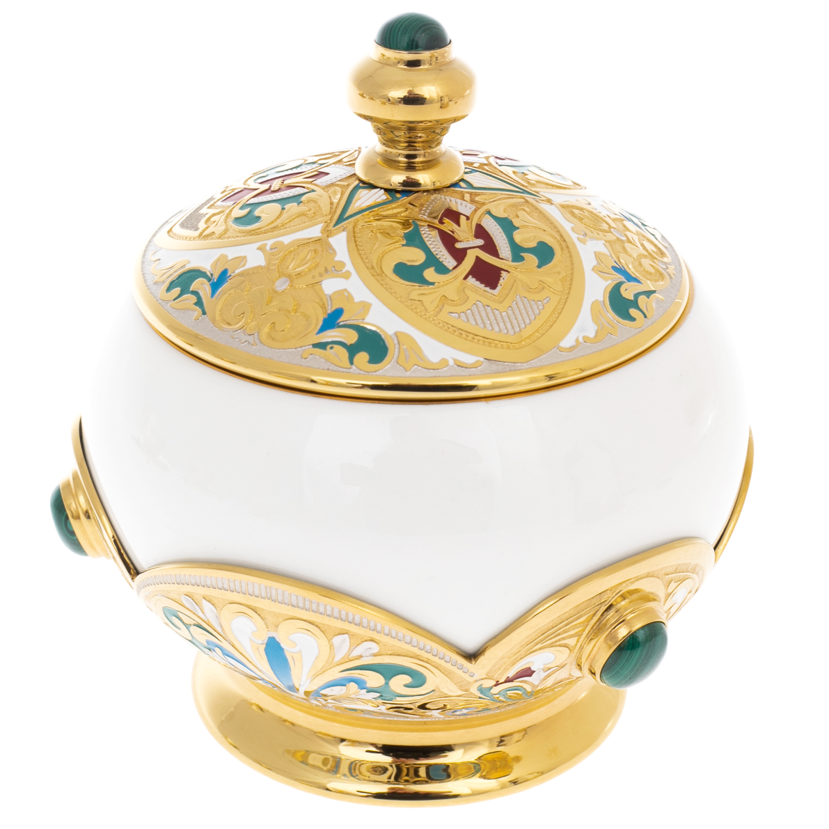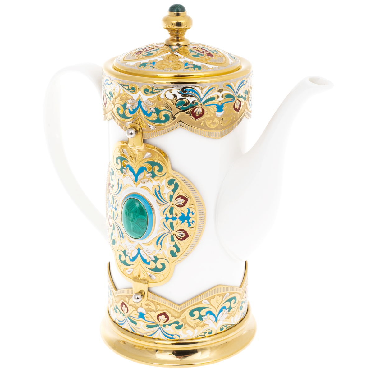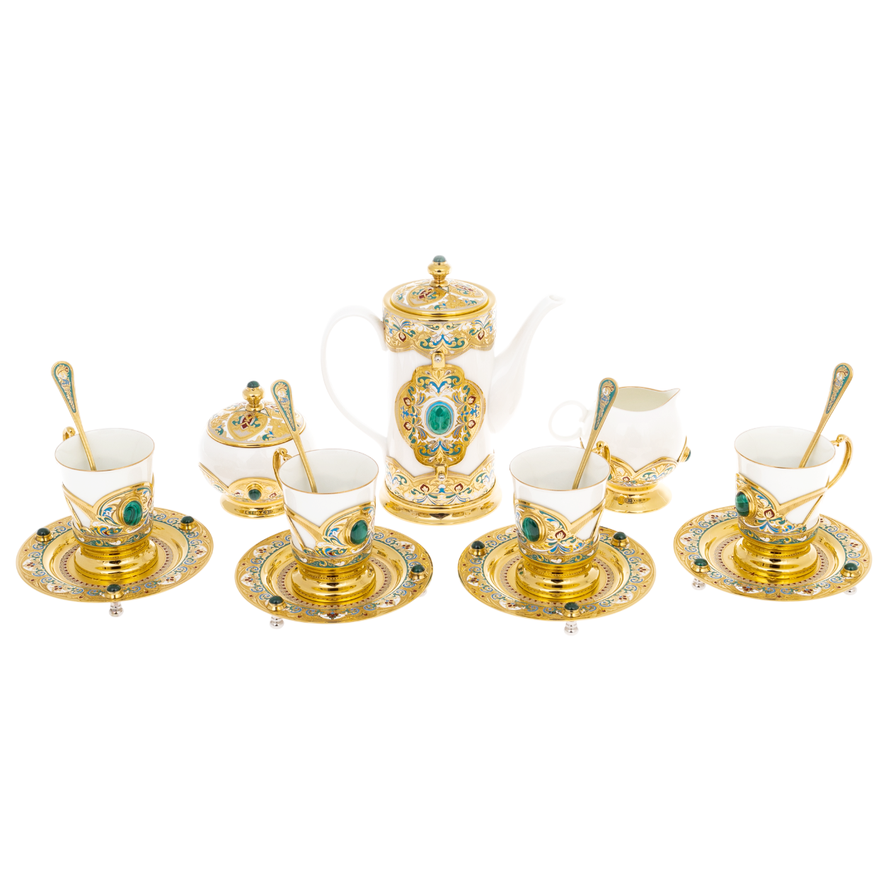 Изящные линии из фарфора, обрамлённые золотом и насыщенными оттенками эмали, создают иллюзию драгоценности, воспевающей гармонию природы и искусство мастеров. Каждый элемент набора, от кофейника до блюдец и ложек, исполнен тщательностью и точностью, характерными для златоустовской традиции. В центральной части каждого предмета сияют вставки из натурального малахита, символизирующего силу земли и её природное великолепие.
