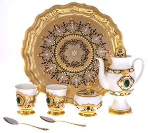 Коллекции изящной посуды от мастеров из Златоуста эффектно декорированы росписью, травлением и золочением. После того, как на полированную поверхность наносится изящный рисунок, изделие сушится в печи и подвергается обработке, после которого рисунок становится рельефным.