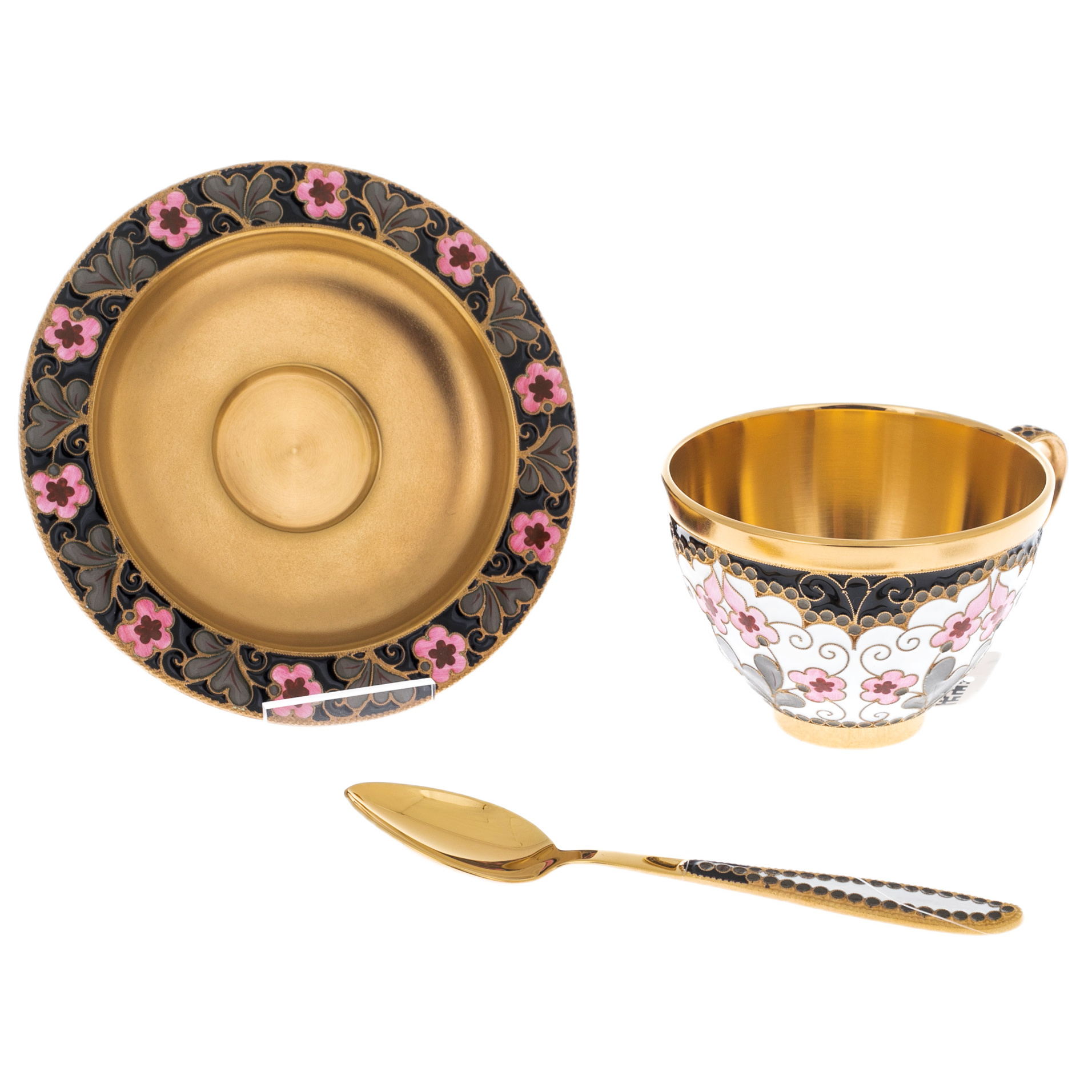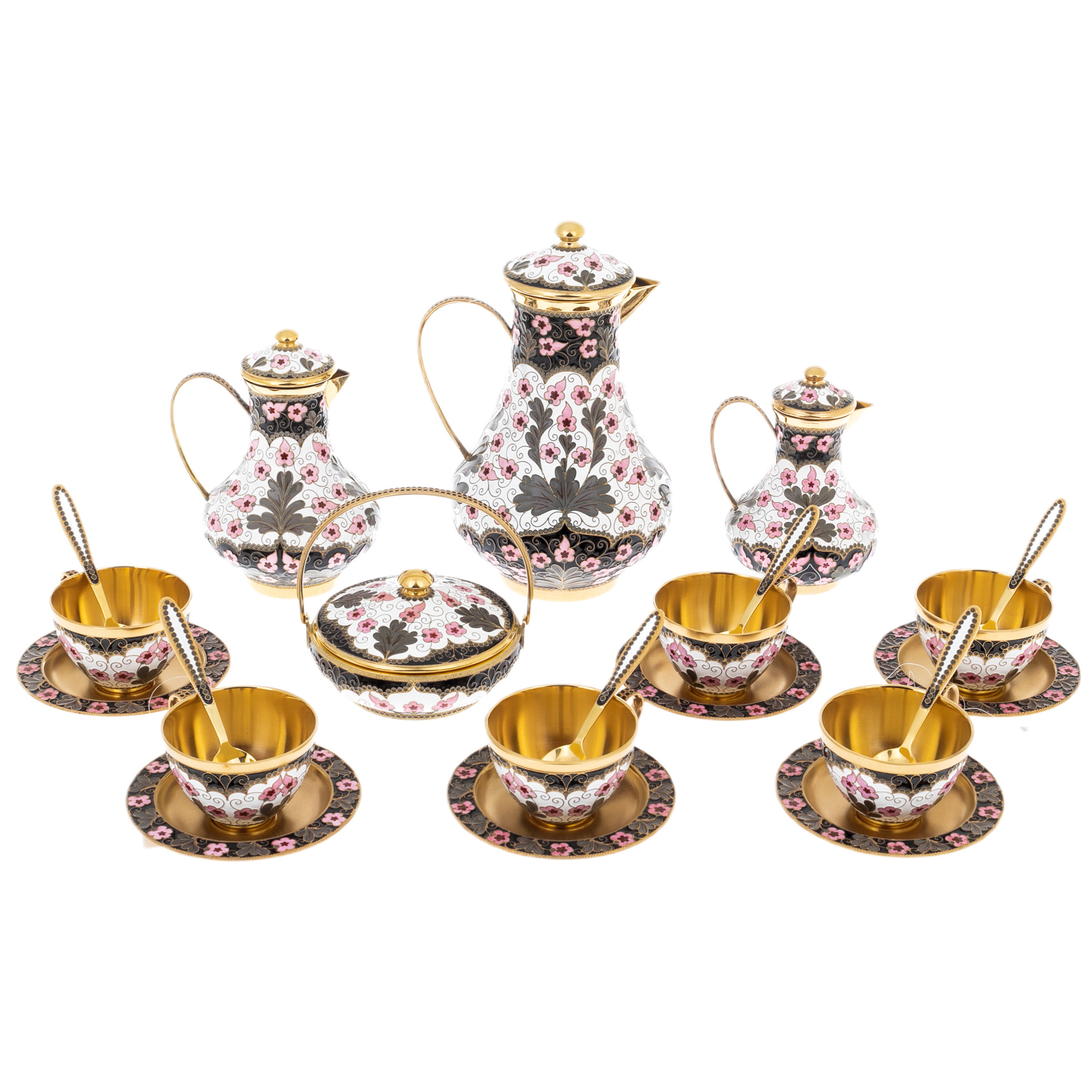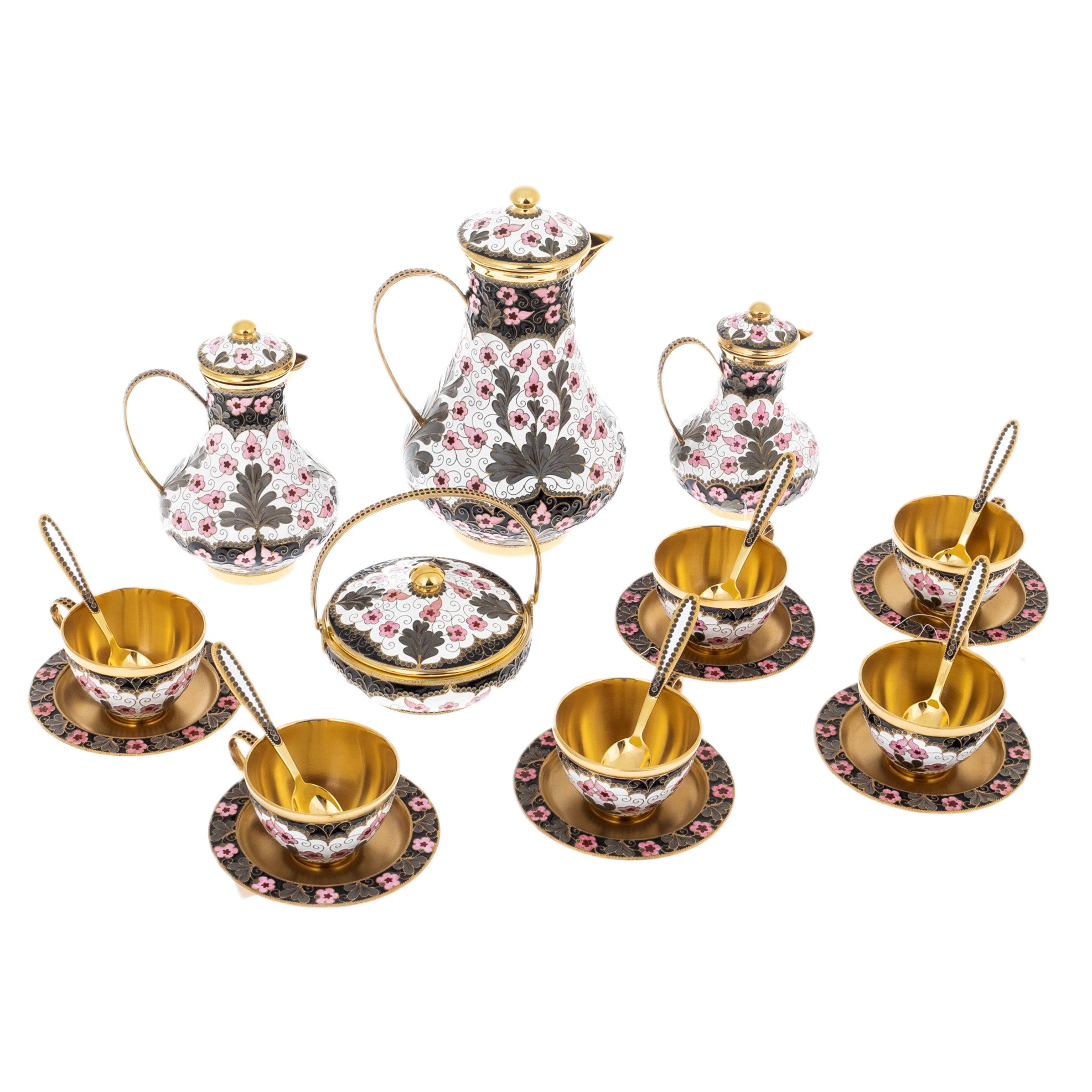 Кофейный сервиз из серебра "Роспись" на 6 персон, белая эмаль