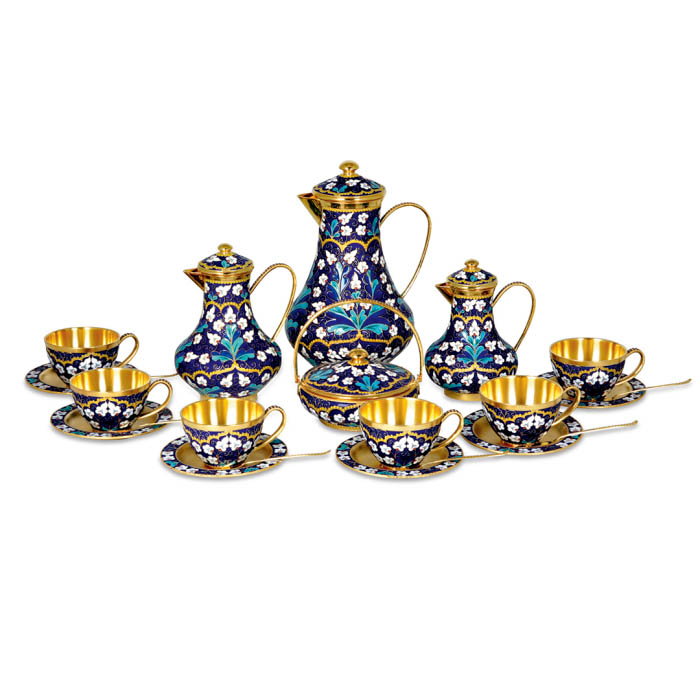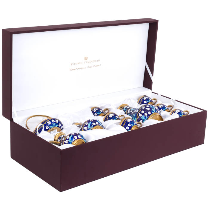 Кофейный сервиз из серебра "Роспись" на 6 персон, синяя эмаль