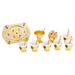 Фарфоровые чаши, установленные в изящные оправы, украшены нефритовыми кабошонами, придающими сервизу характер коллекционной вещи. Блюдо, проработанное сложным орнаментом с сочетанием золочёной и серебристой гравировки, задаёт торжественный тон всей сервировке, визуально объединяя предметы в гармоничную старинную сцену, напоминающую роскошные кофейные собрания европейских салонов. Позолоченные ложечки с рельефными наконечниками завершают композицию, поддерживая эстетику драгоценного убранства.