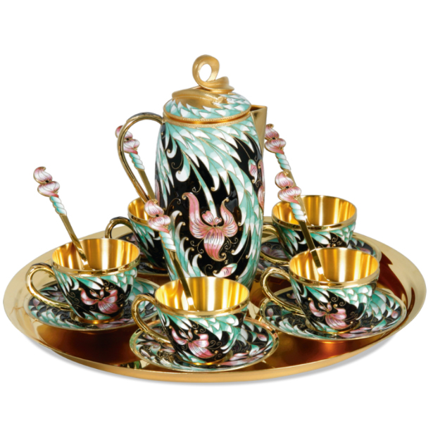 Комплектация: кофейник — 1 шт., чашка — 6 шт., блюдце — 6 шт., ложка — 6 шт., поднос — 1 шт.