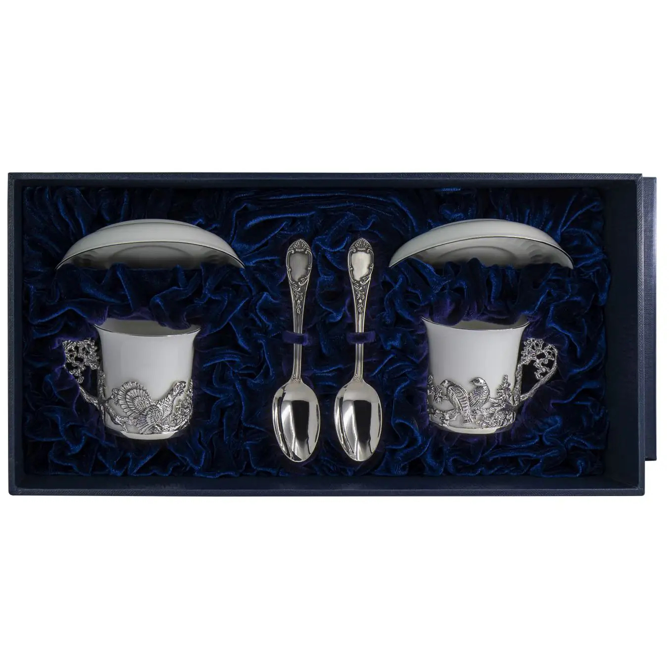 Набор кофейных чашек из серебра и фарфора "Глухарь": блюдце, ложка, чашка, на 2 персоны