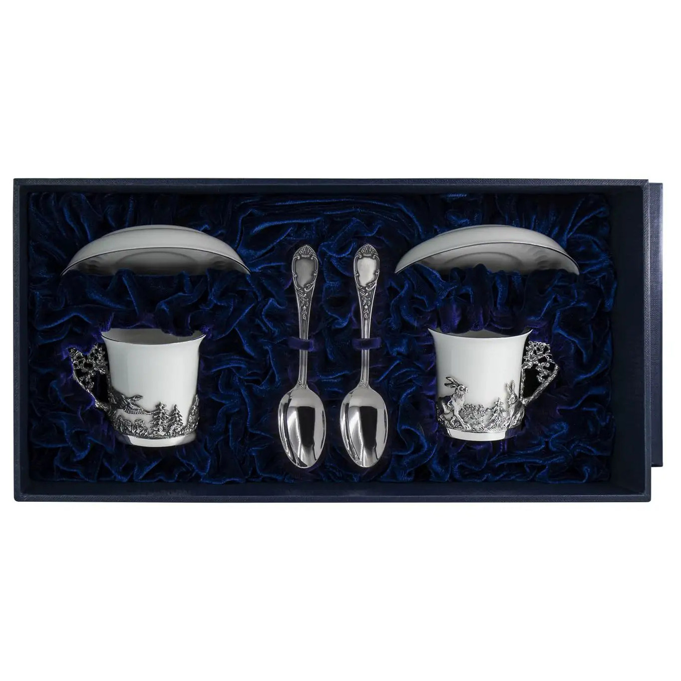 Набор кофейных чашек из серебра и фарфора "Зайцы": блюдце, ложка, чашка, на 2 персоны
