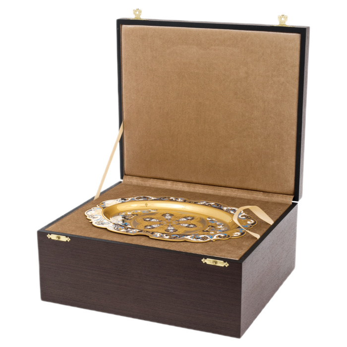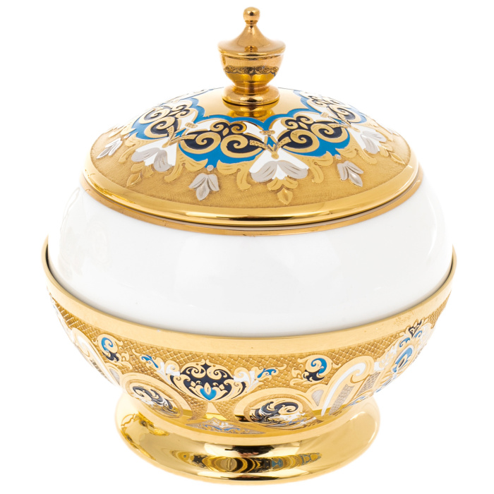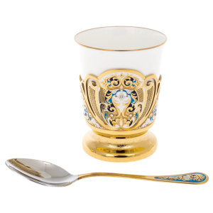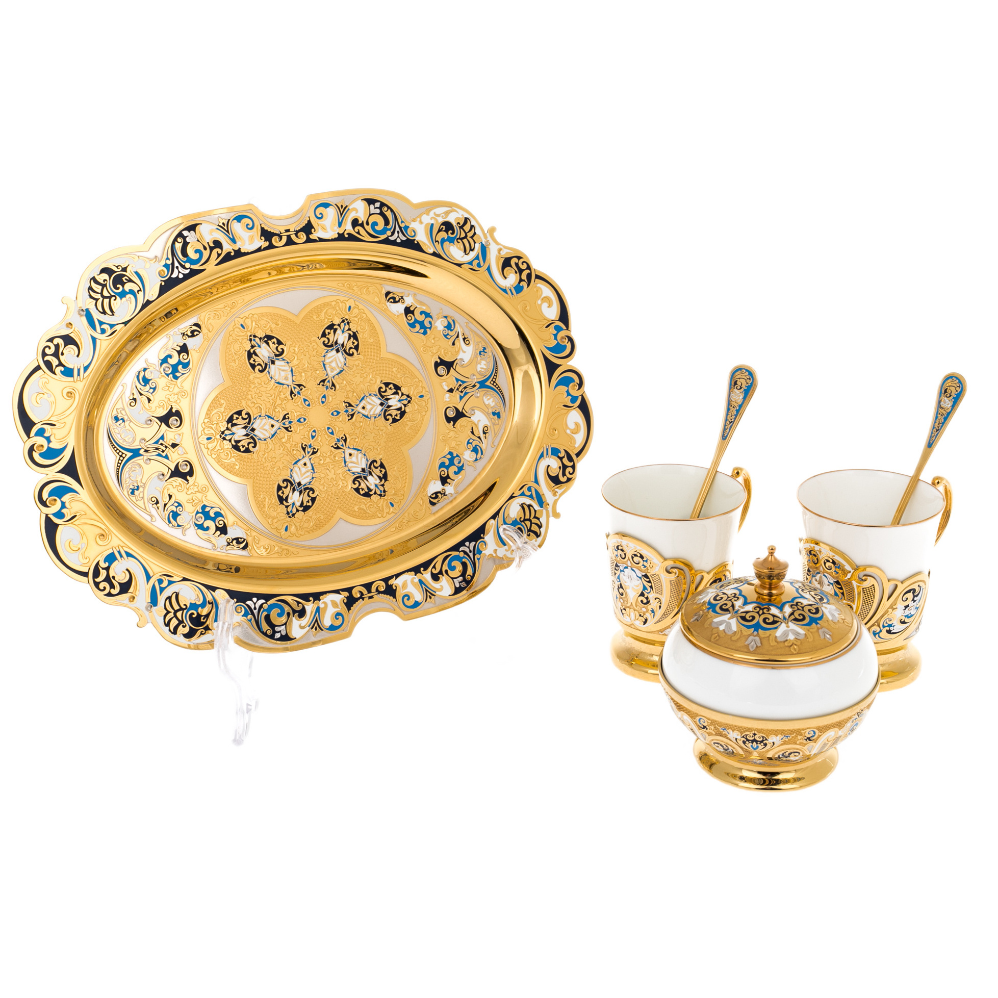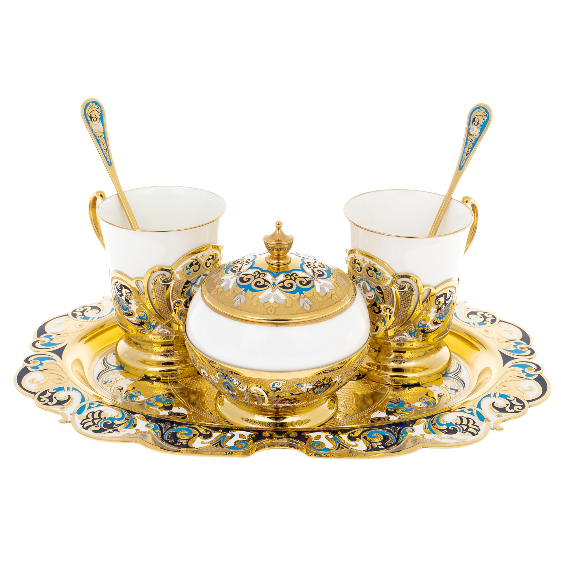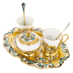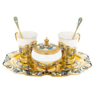 Златоустовские мастера соединили белизну фарфора с сиянием золота и переливами горячей эмали. На изысканных подстаканниках и блюде расцветает орнамент в оттенках лазури и бирюзы — словно отблеск утреннего неба над золотыми куполами. Каждая деталь, от крышки сахарницы до миниатюрных ложек, выполнена с ювелирной точностью и хранит отпечаток ручной работы.