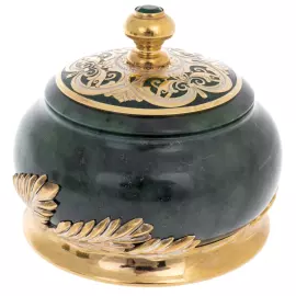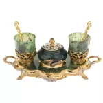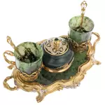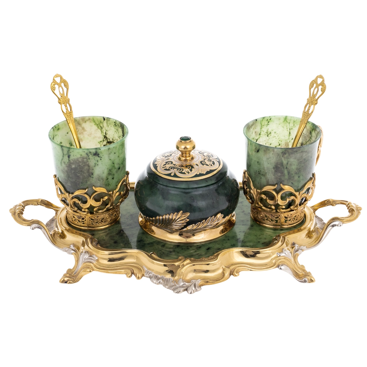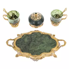 Кофейный набор «Барокко» из нефрита — изысканный ансамбль для утончённой сервировки, в котором природная красота камня соединена с выразительной декоративностью. В состав входят две чаши из нефрита с позолоченными держателями, сахарница с крышкой и изящный поднос, объединяющий композицию в единое целое. Глубокий зелёный оттенок камня с естественными прожилками создаёт ощущение живой материи, а тёплый блеск металла подчёркивает его природную глубину и благородство.