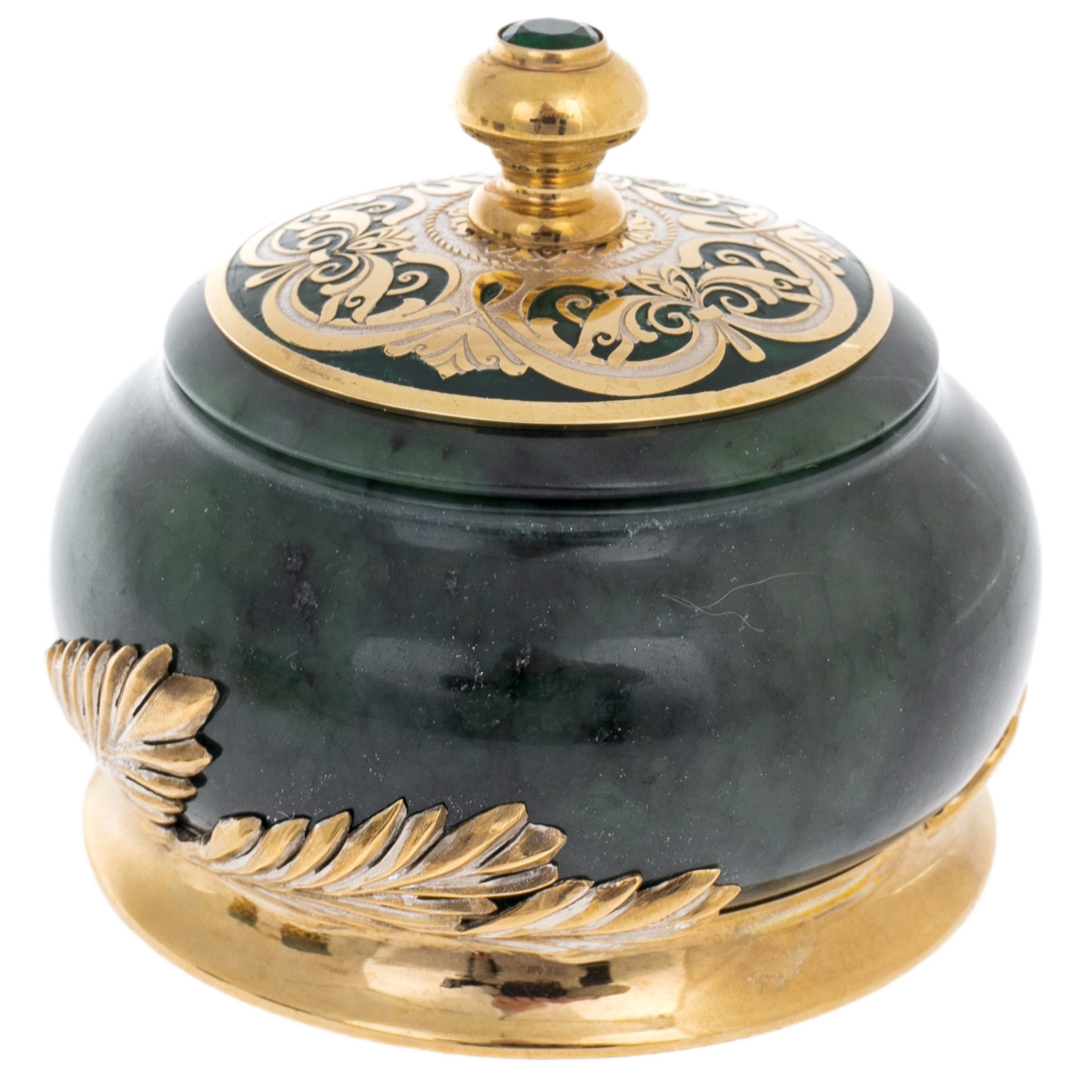 Изделие выполнено в лучших традициях златоустовского художественного ремесла. Позолоченные элементы украшены сложным барочным орнаментом с плавными линиями и растительными мотивами, создающими ощущение движения и изящества. Контраст между полированным металлом и матовой фактурой нефрита усиливает визуальную выразительность, а ручная проработка деталей придаёт композиции утончённость и завершённость. Каждая деталь — от основания до декоративных накладок — выполнена с высокой точностью и вниманием к гармонии форм.