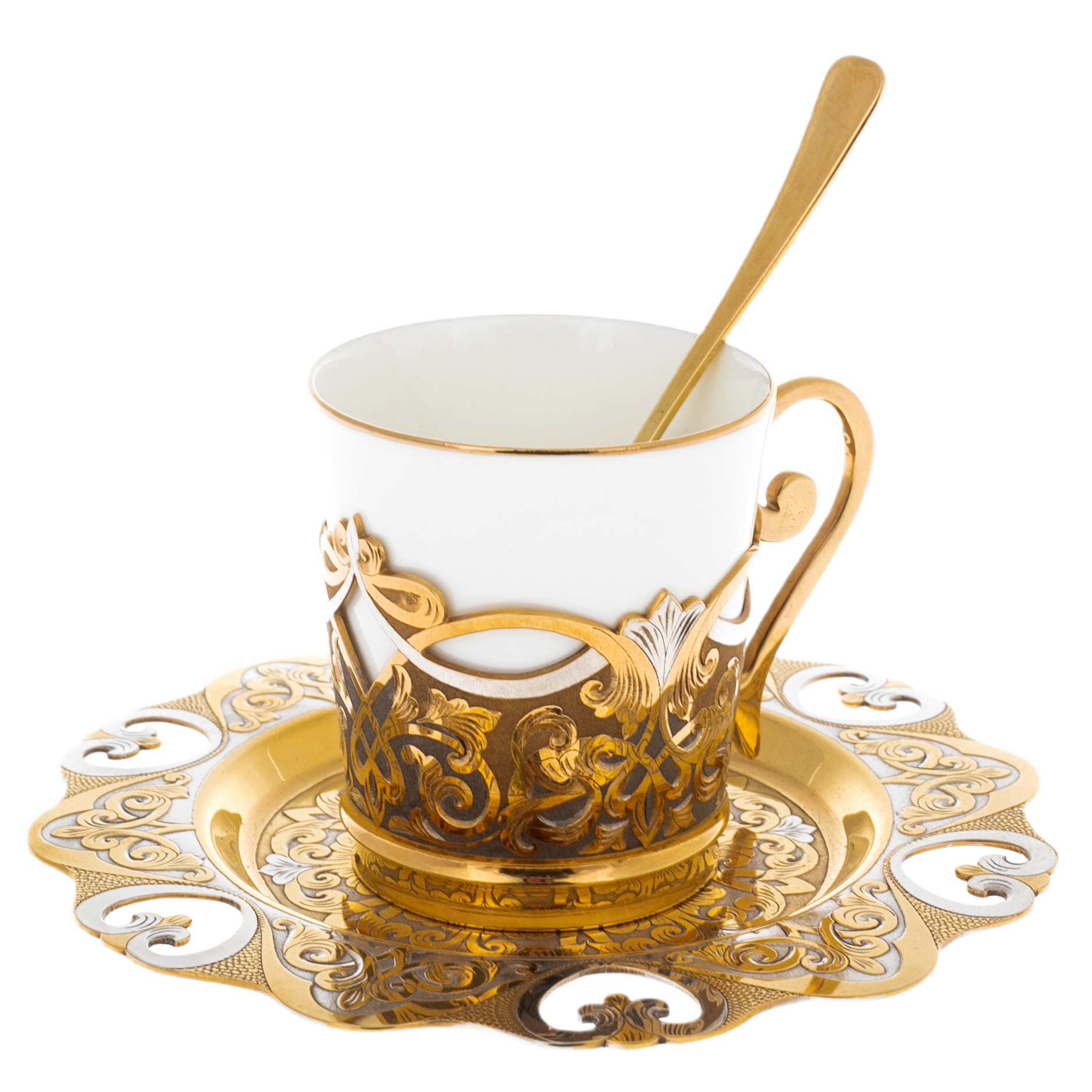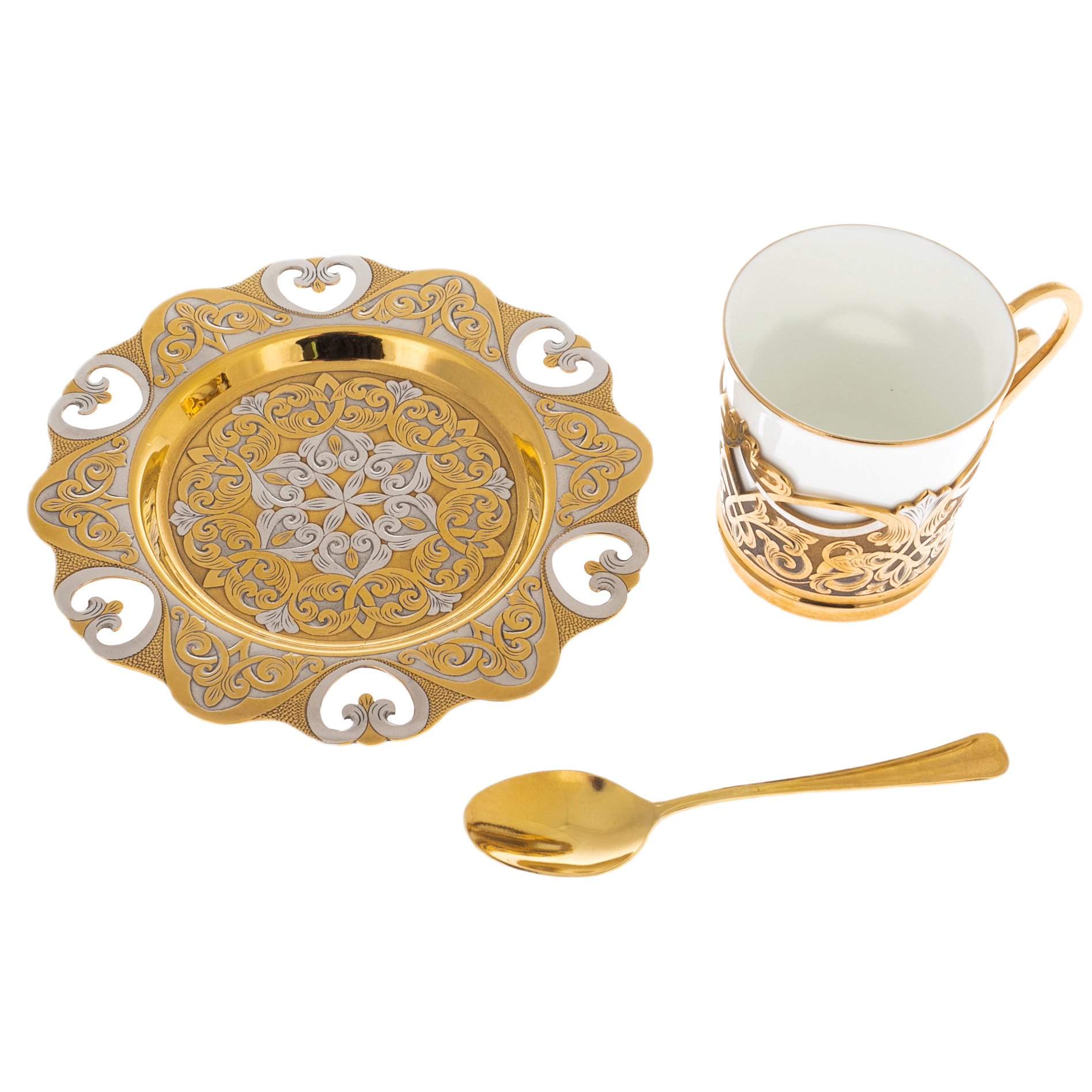 Русские самоцветыКофейный набор серебряный "Ирис" на 6 персонКофейный набор серебряный "Ирис" на 6 персонКофейный набор на шесть персон — утончённый шедевр, созданный для изысканных коллекций и исключительных утренних церемоний. Каждый элемент композиции, от вытянутого кофейника с фигурной крышкой до миниатюрных чаш с блюдцами и ложечек с жемчужными завитками, выполнен вручную из латуни с покрытием чистого золота. Внутренние поверхности чашек и кофейника отполированы до зеркального блеска, отражая теплый янтарный свет, а внешние украшены ритмичным орнаментом из бирюзовых волн, пылающих лепестков ириса и тончайших завитков. Композиция завершена изящным подносом с золотой зеркальной поверхностью, обрамляющим сервиз как драгоценную жемчужину.